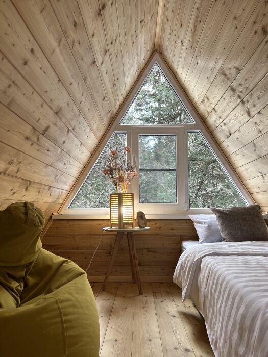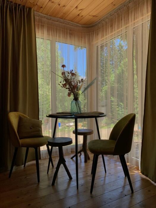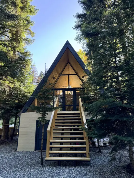 Для комфортного проживания предлагаются уютные А-фреймы. Каждый дом может разместить до 5 гостей и один дом до 7 гостей. Все они оборудованы удобной мебелью, собственной ванной комнатой с душем и беспроводным доступом в интернет. Гости также могут воспользоваться мини-кухней, оснащенной холодильником, электрочайником, микроволновкой и индукционной печью, кофемашиной для самостоятельного приготовления пищи.