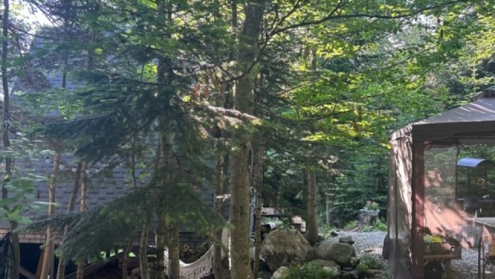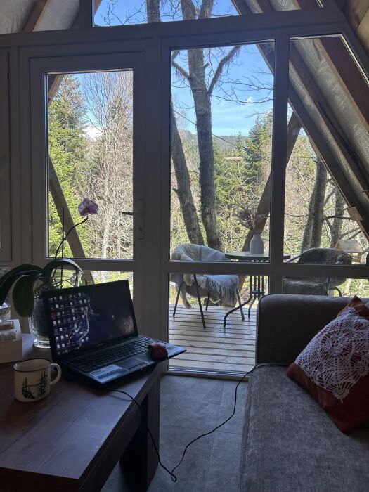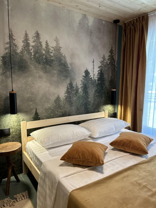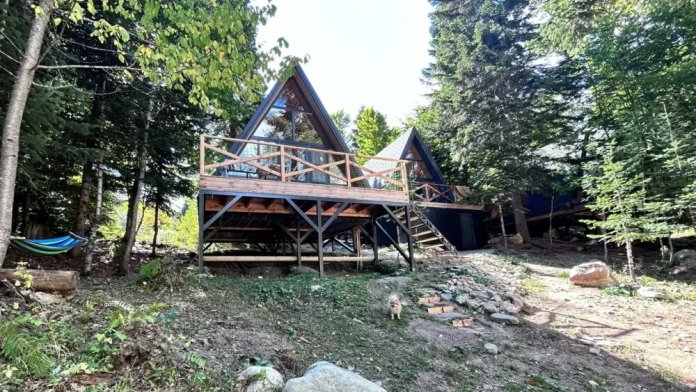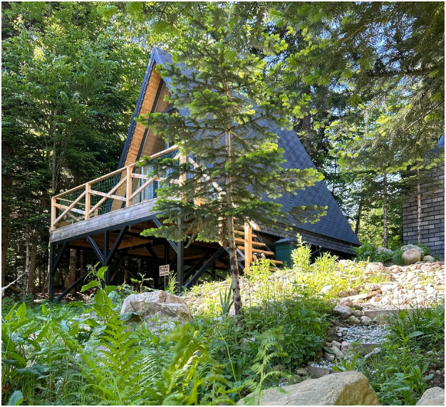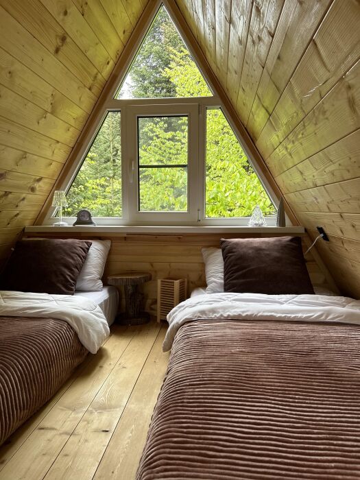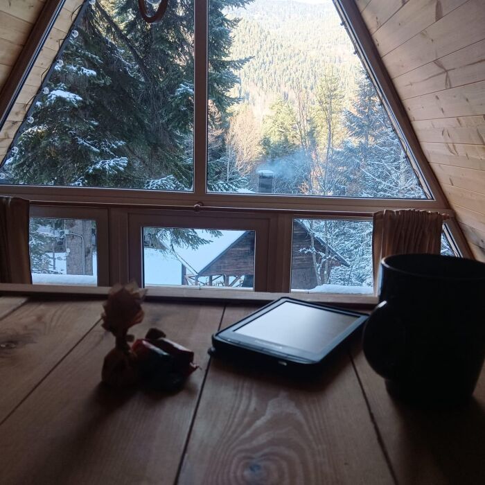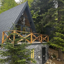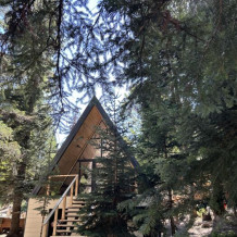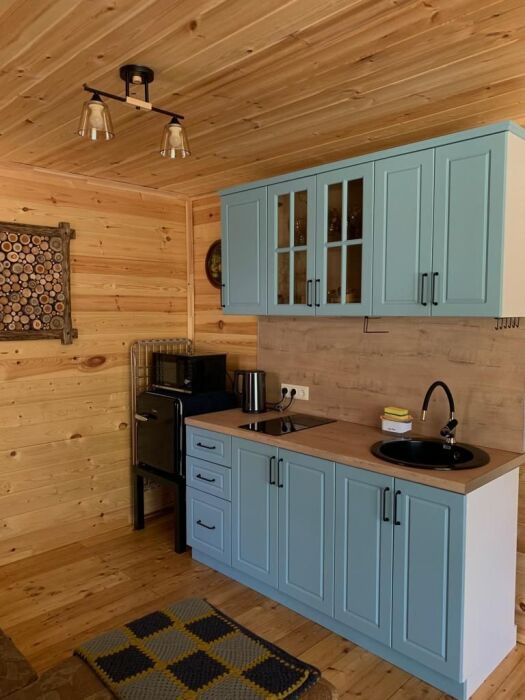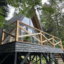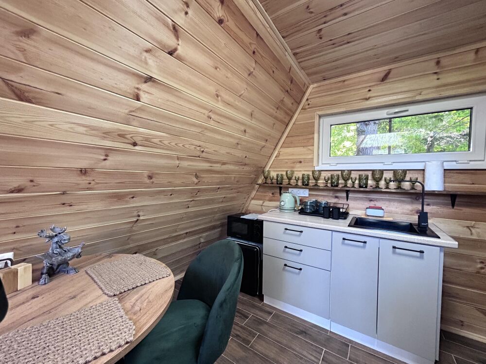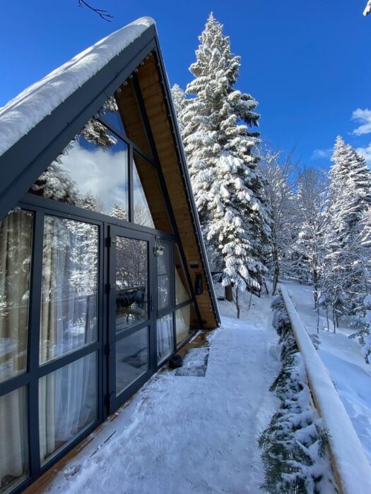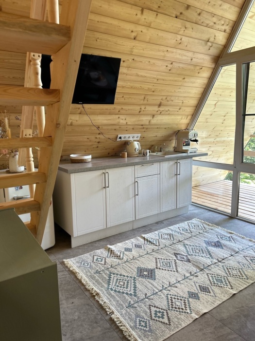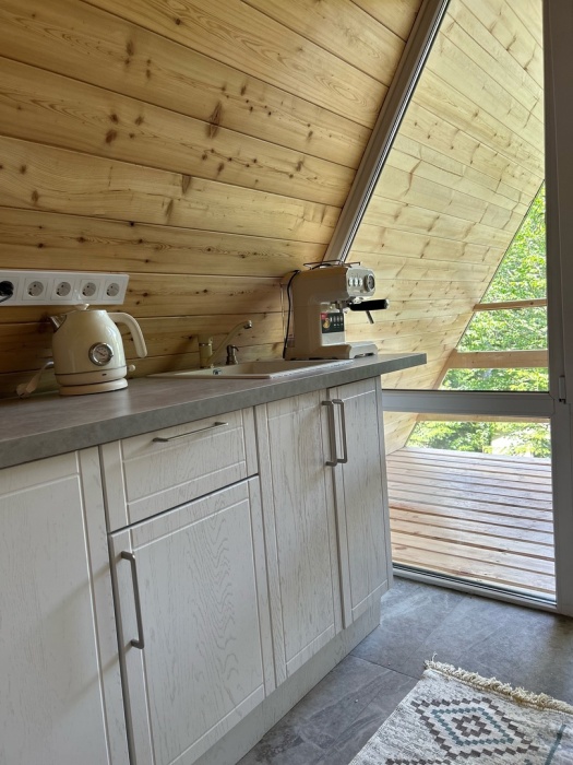А-фрейм или треугольный дом, дом-шалаш с панорамной стеной, выходящей на горы и лес. Много света и воздуха дизайнерский ремонт и уютная атмосфера. Дом для комфортного проживания круглый год. Теплый пол и электрическое отопление. Теплый туалет и горячая вода круглосуточно. В доме есть телевизор и wi-fi . Кухонная зона, оснащена всем необходимым: холодильник, электрическая плита, кофеварка, чайник, микроволновая печь и набор посуды.