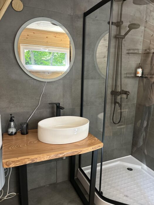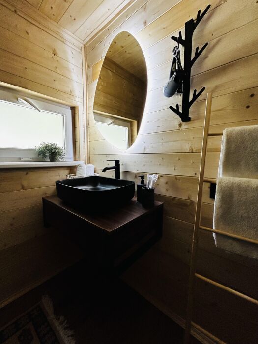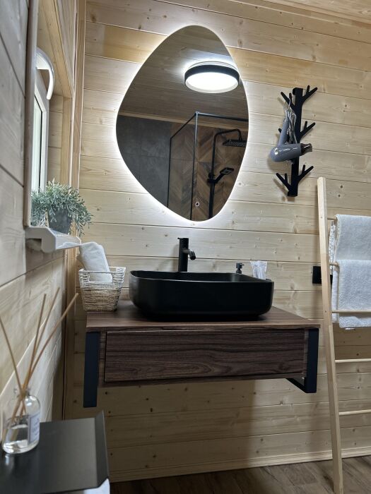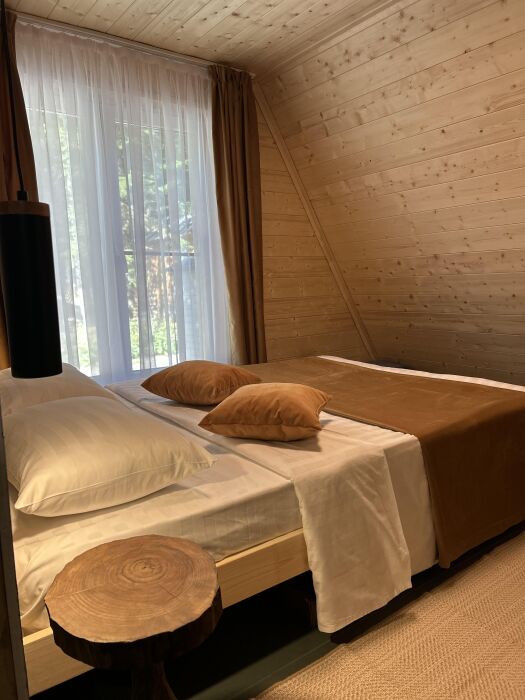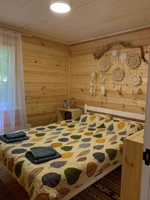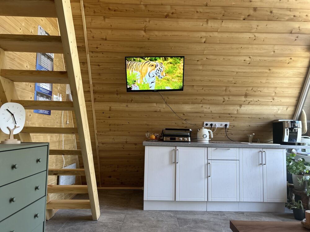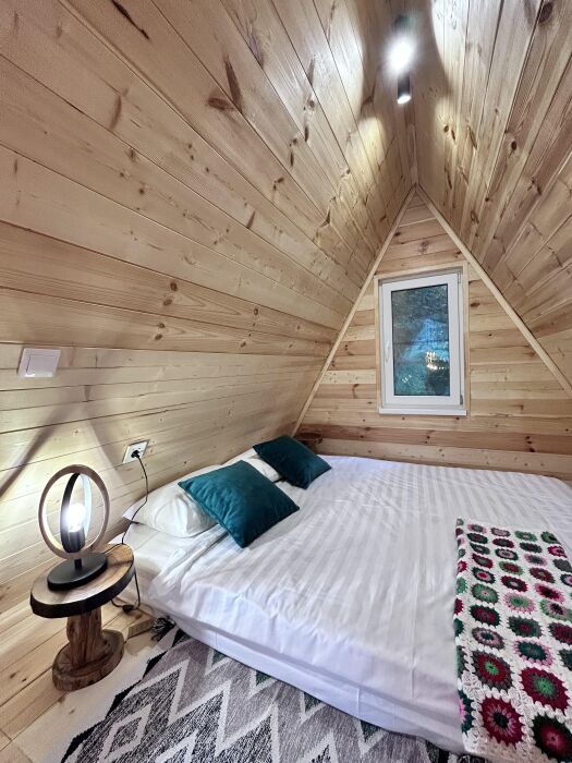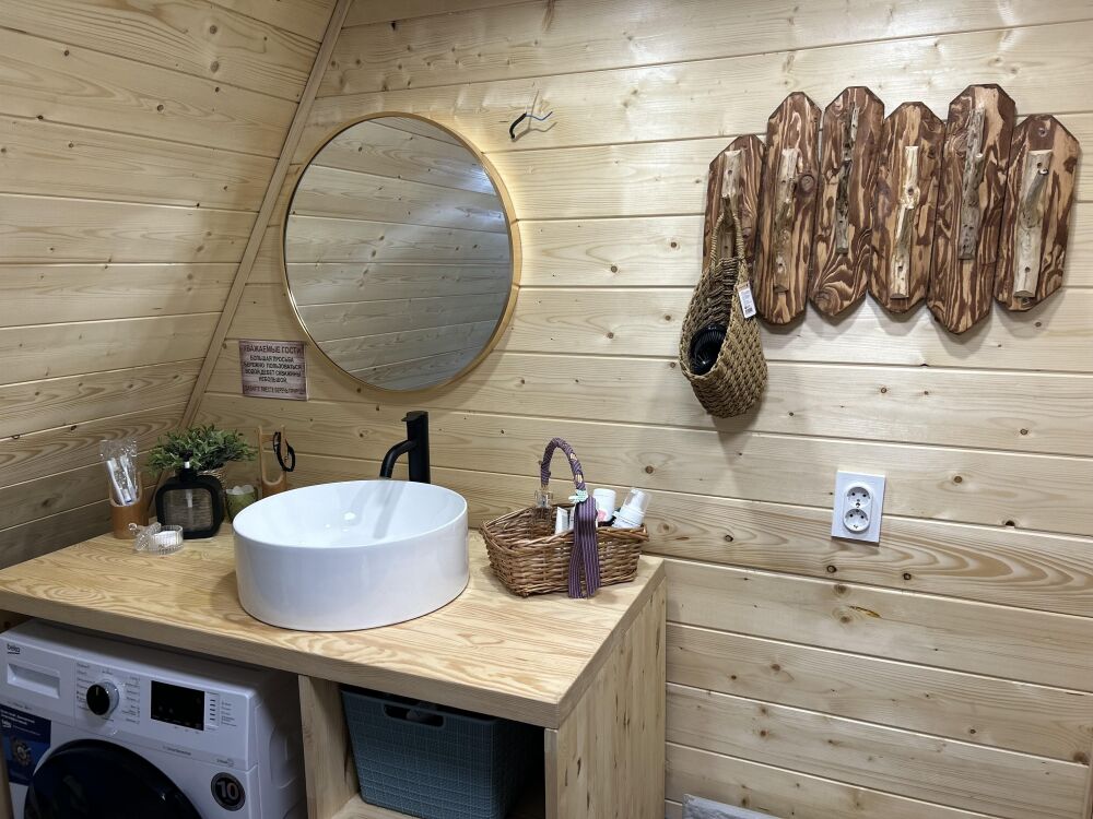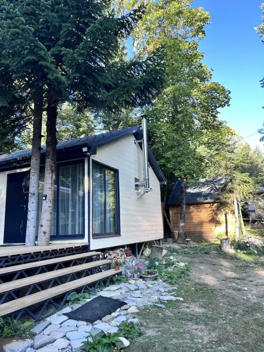Новый уютный дом в стиле А-фрейм с отдельной спальней и вторым светом, так же есть двуспальное место на антресоли. В кухни-столовой удобный раскладной диван. Дом оборудован всем необходимым для жизни. В кухонной зоне есть холодильник, микроволновая печь, индукционная печь, кофемашина, электрический чайник, столовые приборы, турецкий фарфоровый сервис, чайные и кофейные чашки, набор кастрюль и сковорода, телевизор и интернет, парковка.