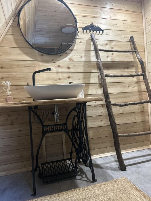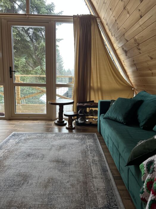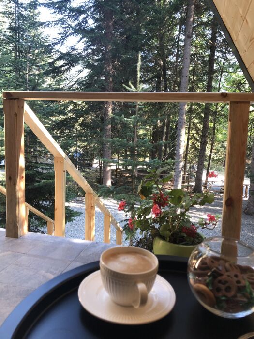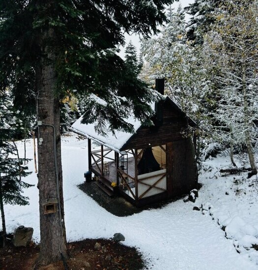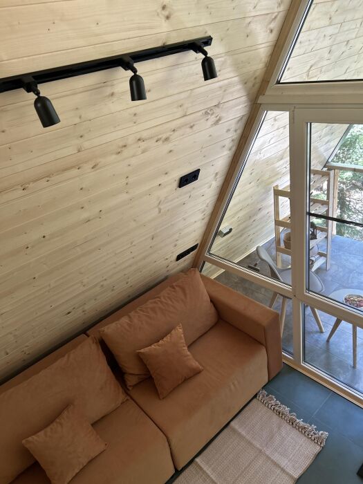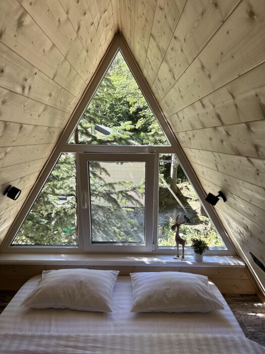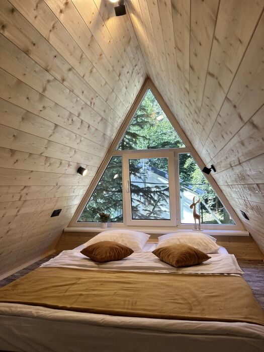 А-фрейм или треугольный дом, дом-шалаш с панорамной стеной, выходящей на горы и лес. Много света и воздуха дизайнерский ремонт и уютная атмосфера. Дом для комфортного проживания человек круглый год. Теплый пол и электрическое отопление. Теплый туалет и горячая вода круглосуточно. В доме есть телевизор и wi-fi . Кухонная зона, оснащена всем необходимым: холодильник, электрическая плита, кофеварка, чайник, микроволновая печь и набор посуды.
