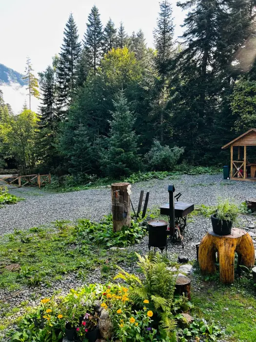 На территории имеется банный чан за дополнительную плату, костровая и мангальная зоны. Есть большая беседка, так же оборудованная мангалом и печью под казан. Гости могут воспользоваться парковкой. В зимний период предоставляется трансфер до подъемников.