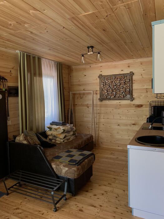 На антресоли ортопедические матрасы, можно использовать, как двуспальное место или раздвинув их для детей или друзей. На 1 этаже диван-кровать, раскладывается в полноценное двуспальное место, дополнительная раскладная кровать. Кухонная зона с холодильником, СВЧ-печью, индукционной печью, кофемашиной и электрическим чайником, набор тарелок, бокалы, стаканы, рюмки, чайная группа. Чай и молотый кофе для кофемашины, сахар. В санузле гигиенические принадлежности: зубные щетки одноразовые, гель для душа, мыло, шампунь и кондиционер для волос, крем для тела и рук.