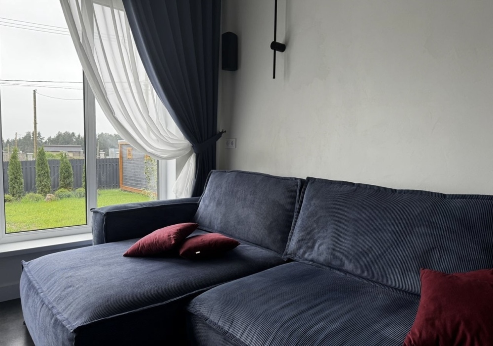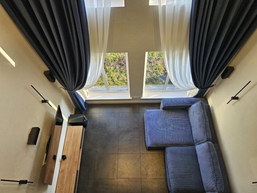 Гостиная оснащена домашним кинотеатром 5.1 Dolby Atmos, большим диваном повышенной комфортности.