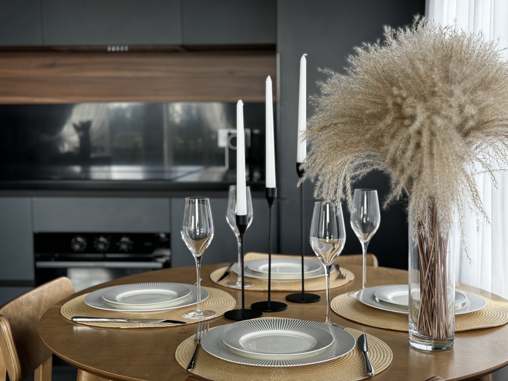 На кухне вы найдете абсолютно все, что необходимо для семейного ужина/торжества (красивый набор посуды, сковороды, кастрюли, ведерко для льда, бокалы для красного/белого/игристого вина).