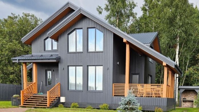 Загородный дом (120 к.м.) у леса с уютной террасой и русской баней на дровах, расположенный в окружении чистых озер, экотроп и живописного соснового бора.