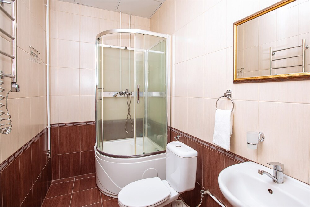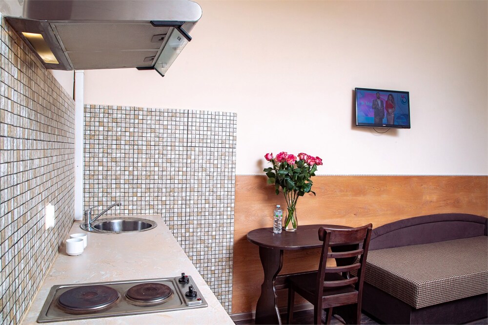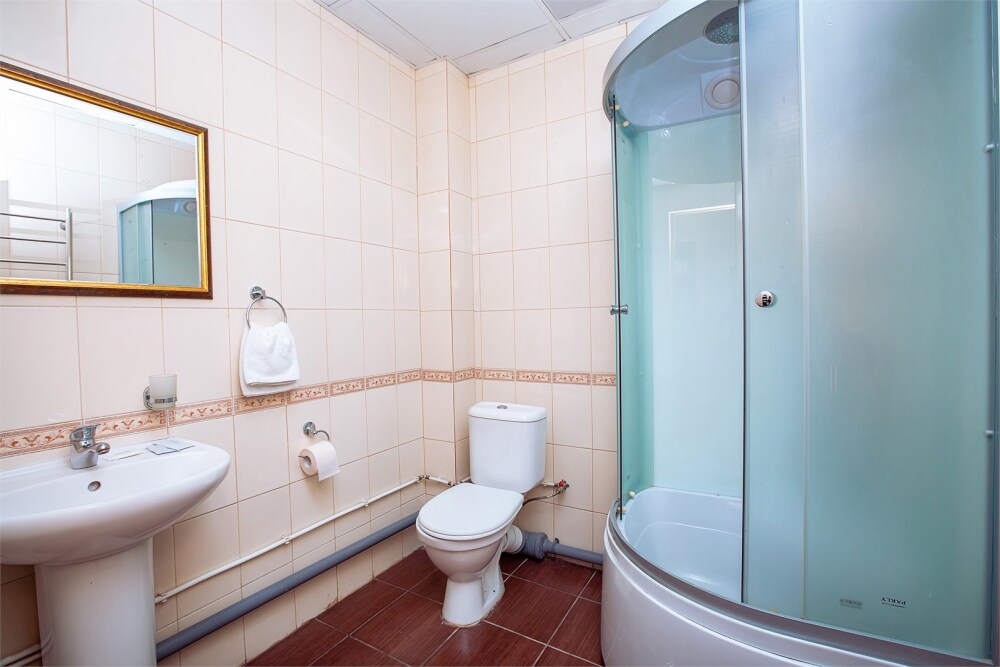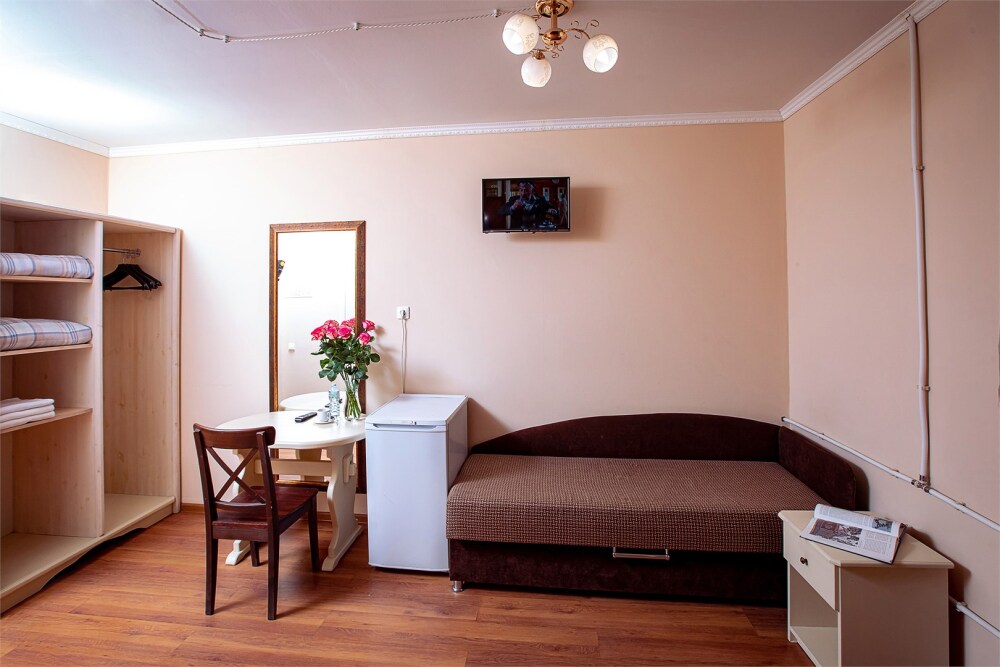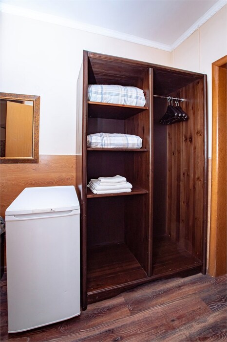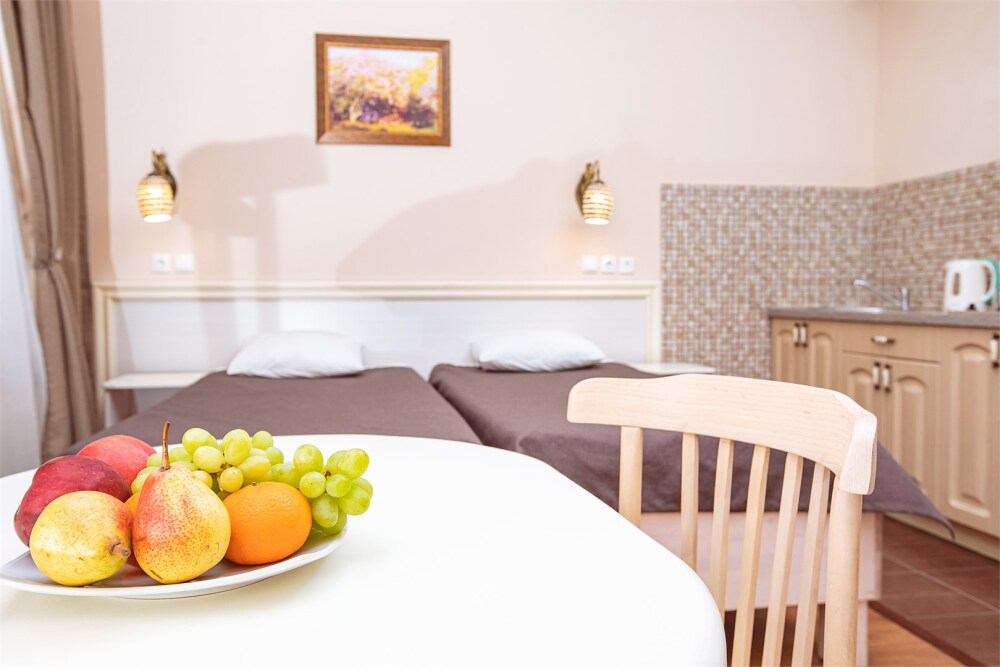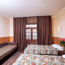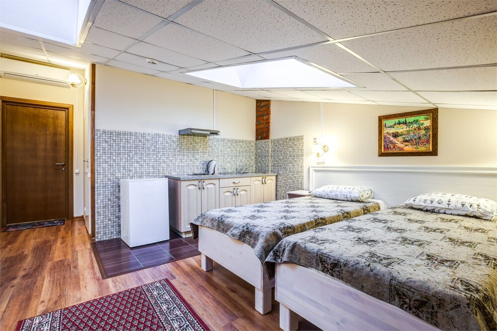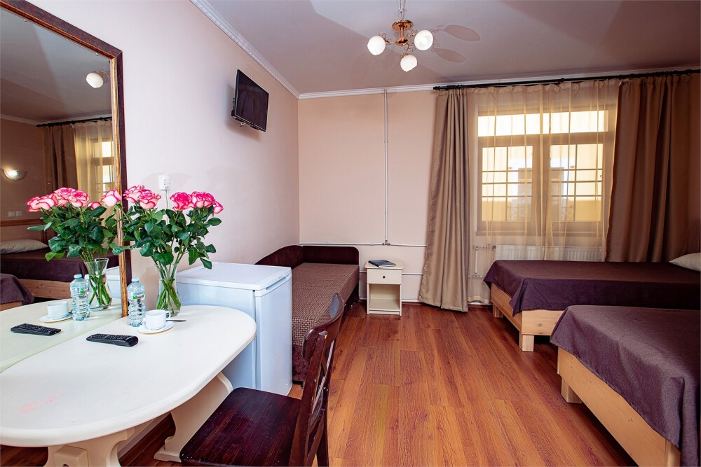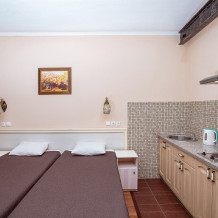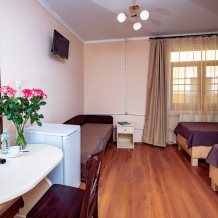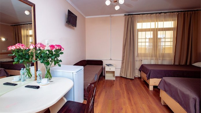 В номере кухонная зона с плитой и вытяжкой, 3 раздельные кровати, центральное отопление, зеркало, шкаф или гардероб, вешалки для одежды, телевизор с плоским экраном, холодильник, обеденный стол, стул. Услуги и удобства: кулер, собственная ванная комната, душ, туалет, фен, полотенца. Детская кроватка (до 3-х лет) предоставляется бесплатно по предварительному запросу.