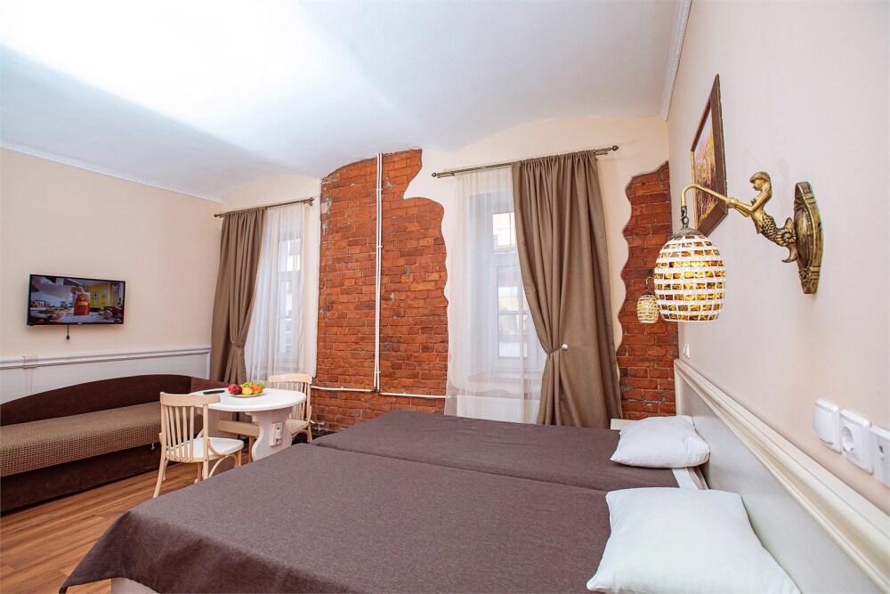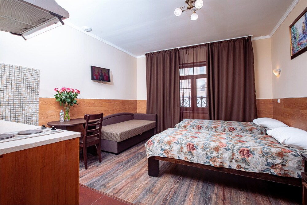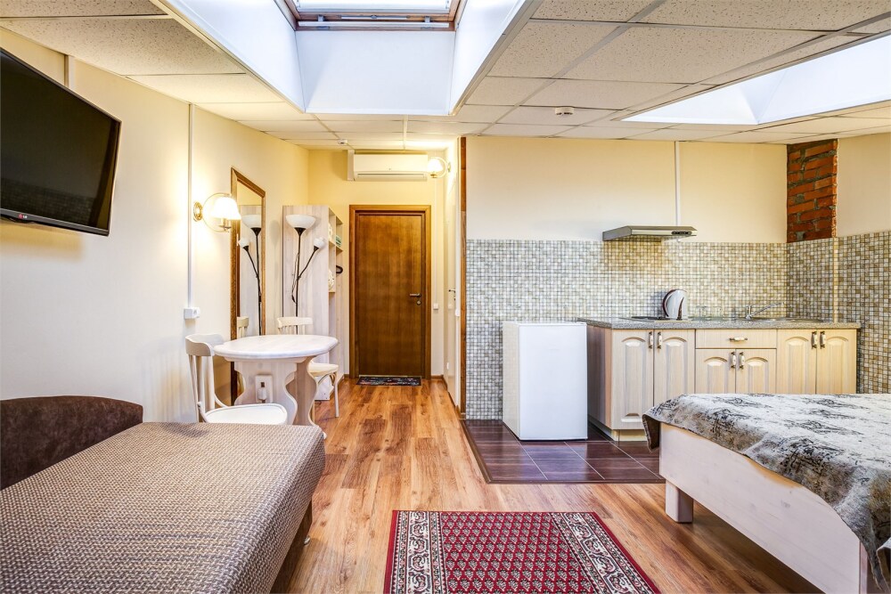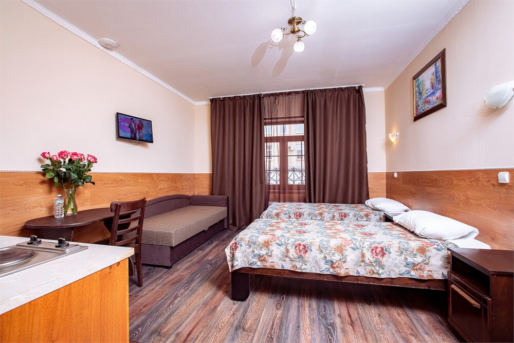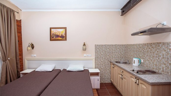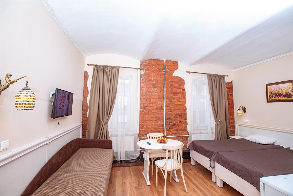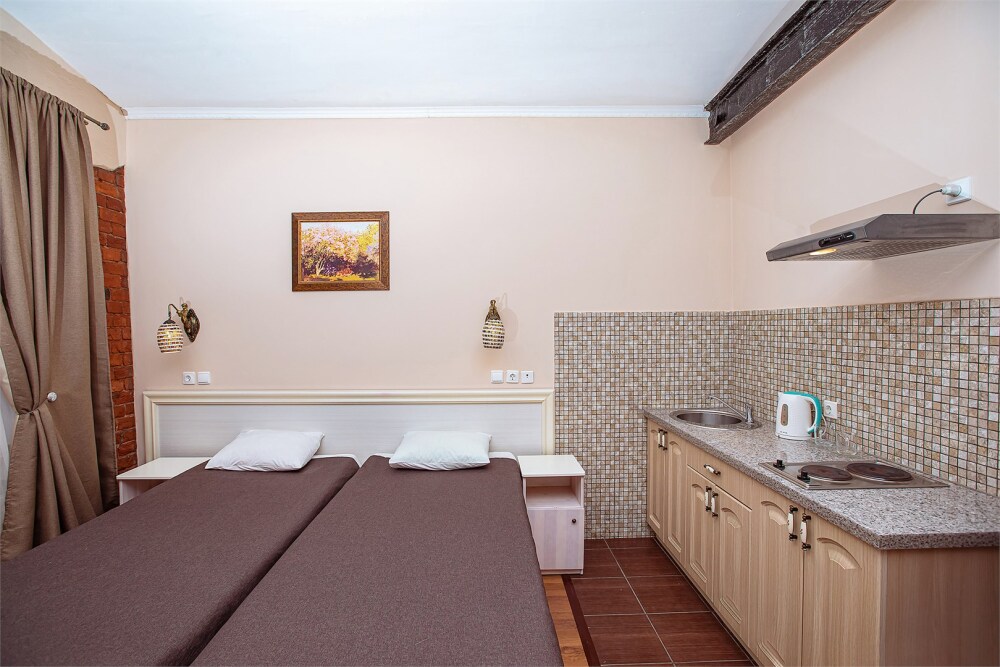 Это просторный с двумя раздельными кроватями и диваном, оснащенный кухонной зоной подходит для проживания 1-4 гостей. Этот номер прекрасно подойдет тем, кто приезжает в Санкт-Петербург надолго или с маленькими детьми. Вид во внутренний дворик отеля. В номере кухонная зона с плитой и вытяжкой, чайник, 2 раздельные кровати, односпальный диван, центральное отопление, шкаф или гардероб, вешалки для одежды, зеркало, телевизор с плоским экраном, холодильник, обеденный стол, стул.