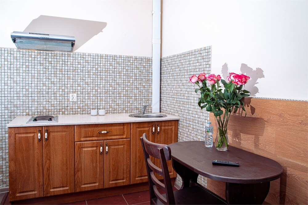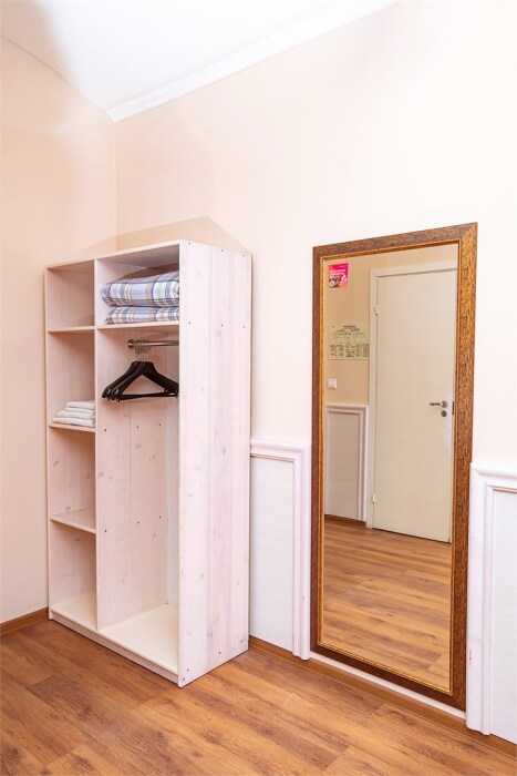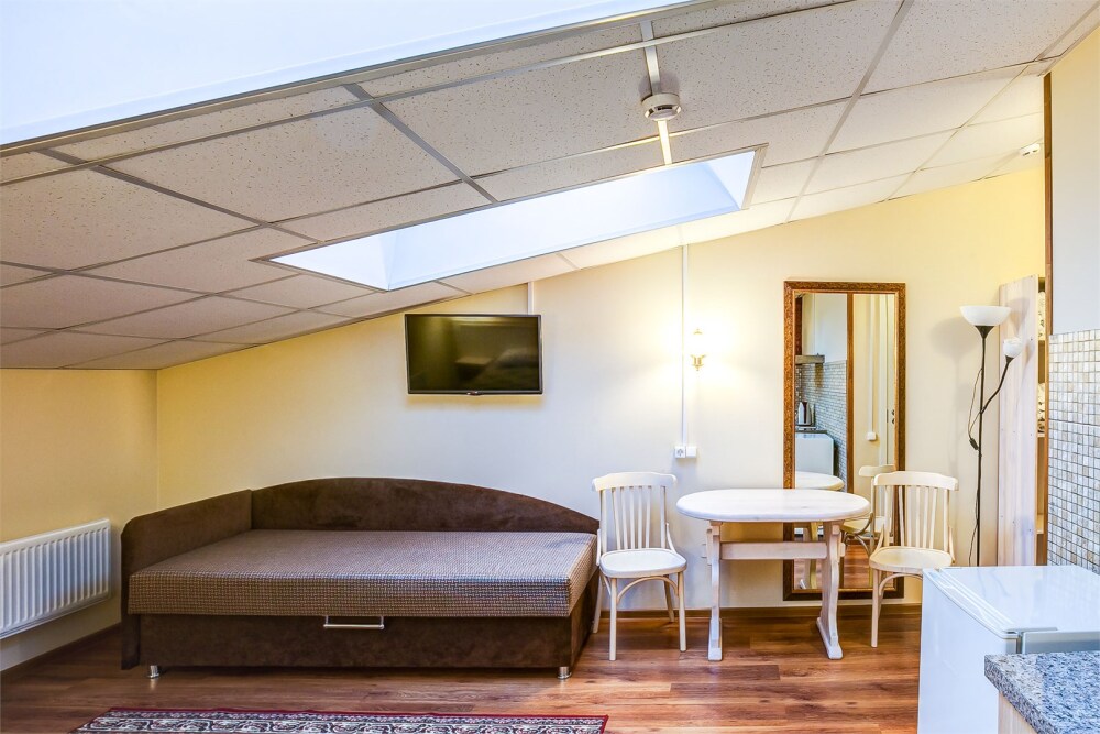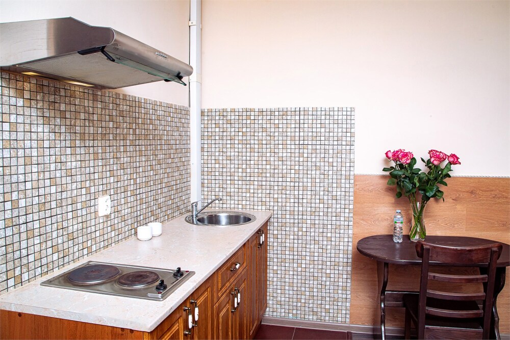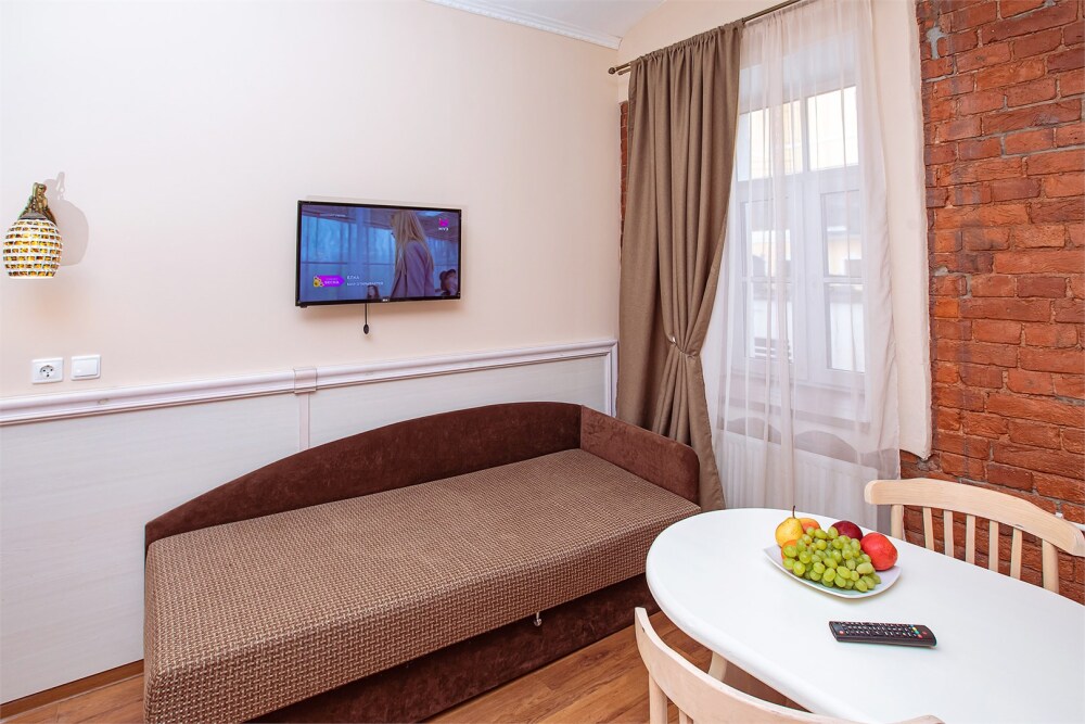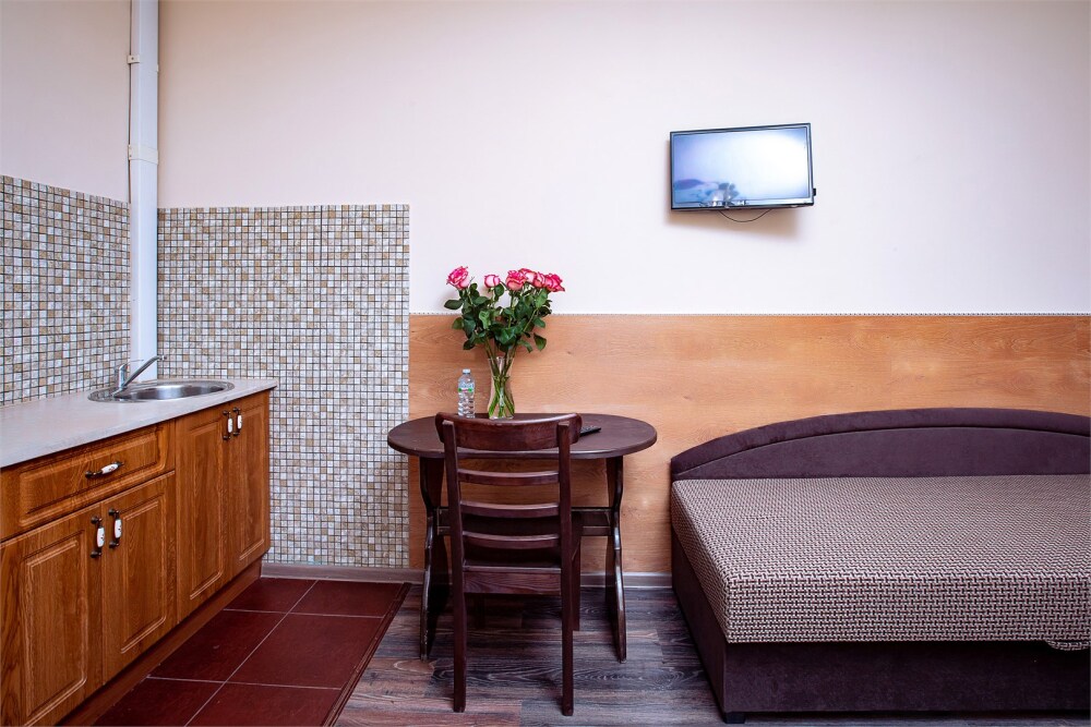 Это просторный с двумя раздельными кроватями и диваном, оснащенный кухонной зоной подходит для проживания 1-4 гостей. Этот номер прекрасно подойдет тем, кто приезжает в Санкт-Петербург надолго или с маленькими детьми. Вид во внутренний дворик отеля. В номере кухонная зона с плитой и вытяжкой, чайник, 2 раздельные кровати, односпальный диван, центральное отопление, шкаф или гардероб, вешалки для одежды, зеркало, телевизор с плоским экраном, холодильник, обеденный стол, стул.