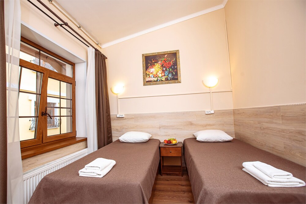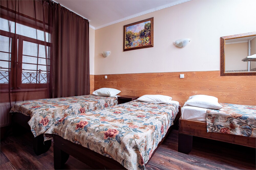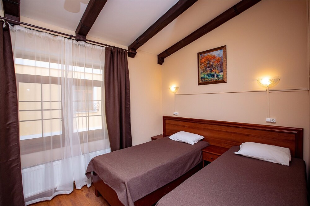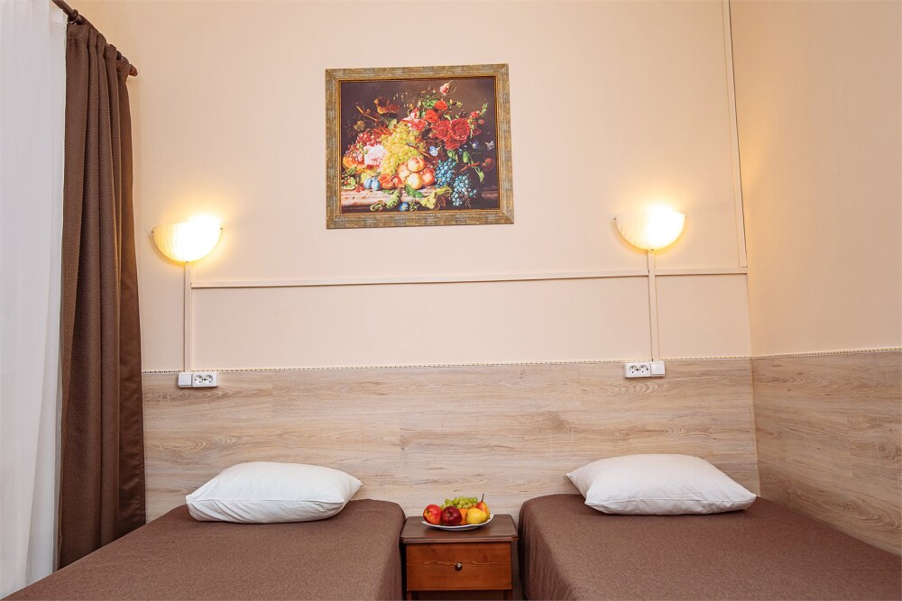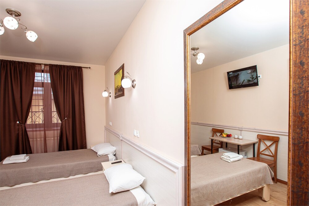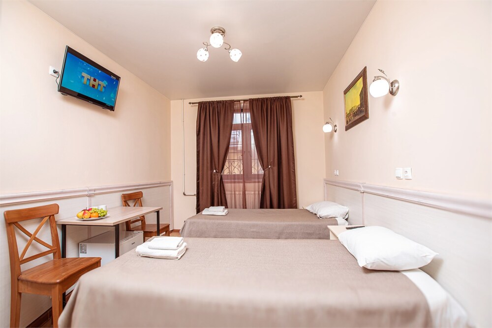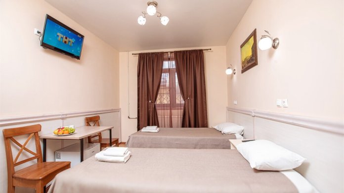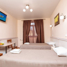 Номер данной категории идеально подходит для проживания 1-2 гостей. Вид во внутренний дворик отеля. В номере 2 раздельные кровати, центральное отопление, шкаф или гардероб, вешалки для одежды, зеркало, телевизор с плоским экраном, холодильник, стол, стул. Услуги и удобства: собственная ванная комната, душ, туалет, фен, полотенца. В здании кулер с горячей и холодной питьевой водой.
