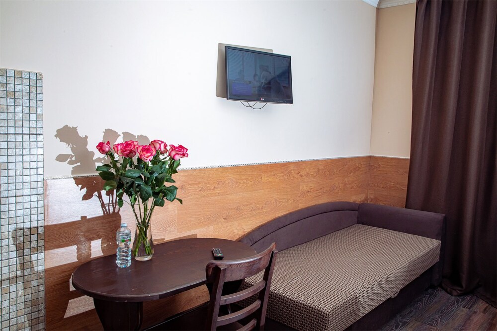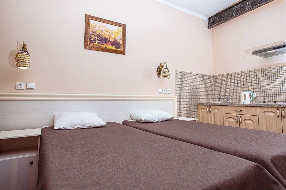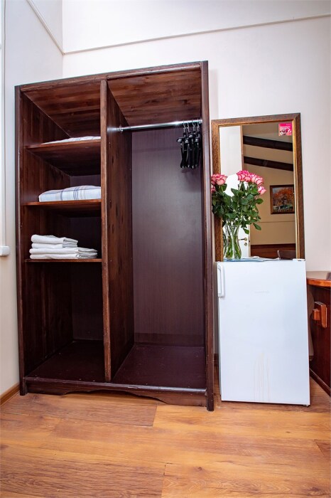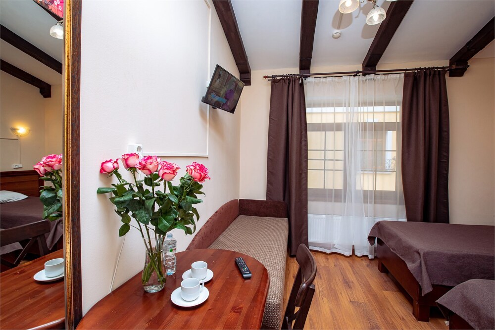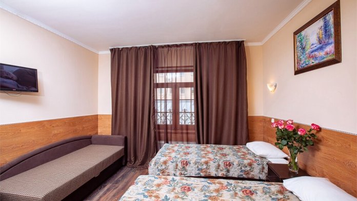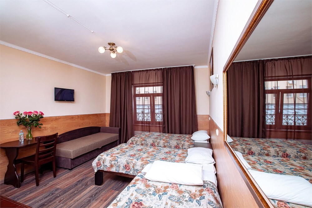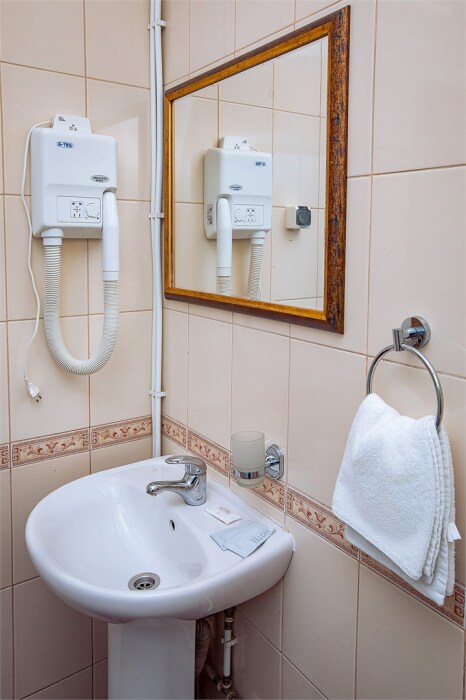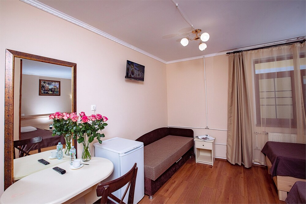 Номер данной категории идеально подходит для проживания 1-2 гостей. Вид во внутренний дворик отеля. В номере 2 раздельные кровати, центральное отопление, шкаф или гардероб, вешалки для одежды, зеркало, телевизор с плоским экраном, холодильник, стол, стул. Услуги и удобства: собственная ванная комната, душ, туалет, фен, полотенца. В здании кулер с горячей и холодной питьевой водой.