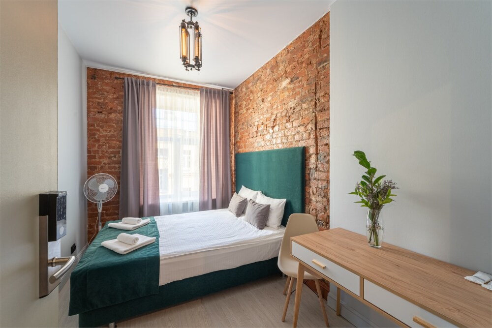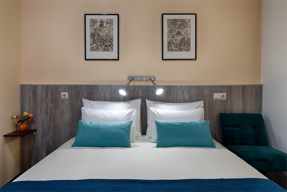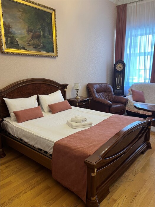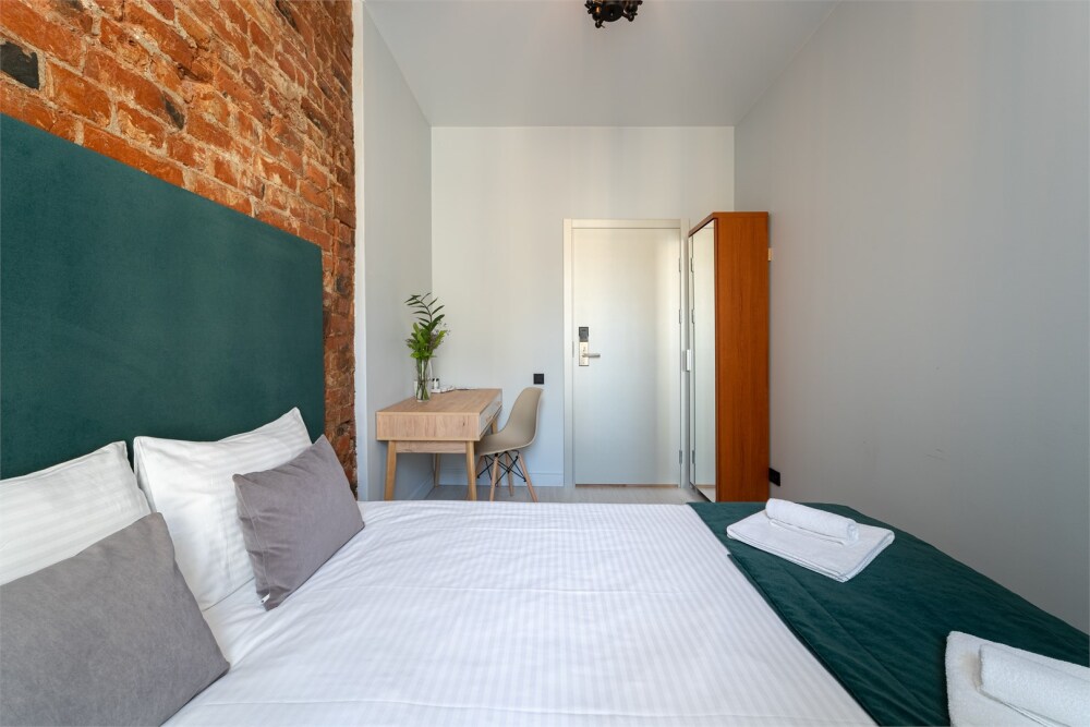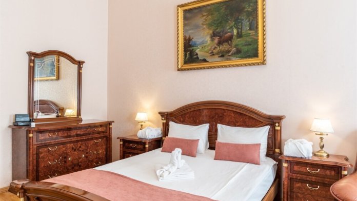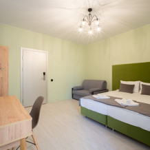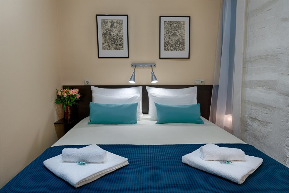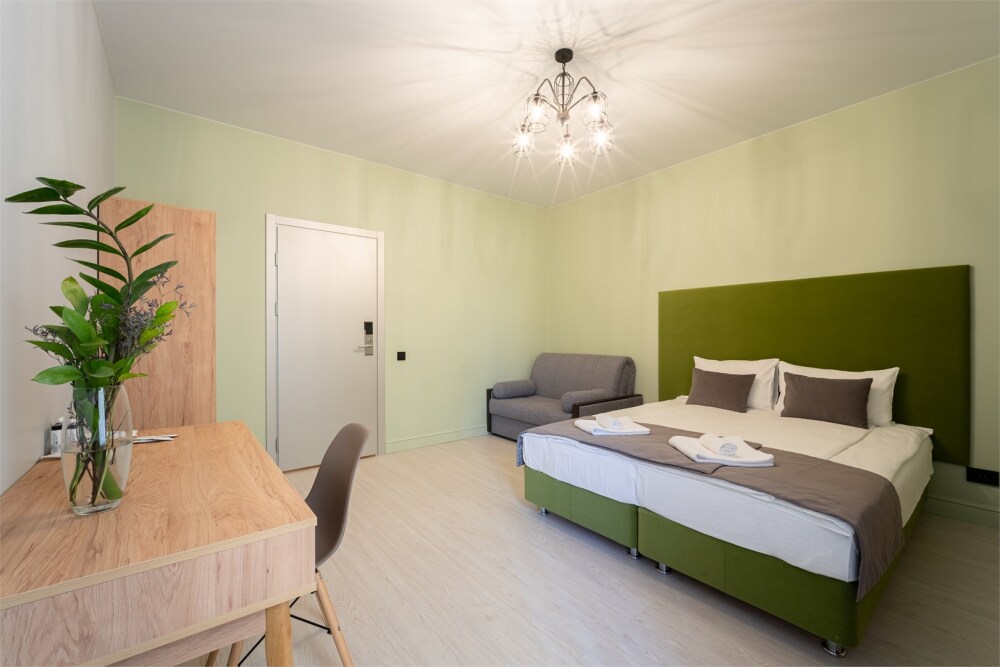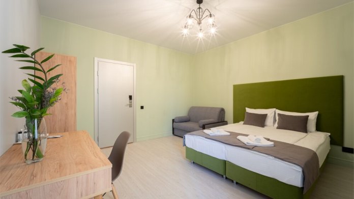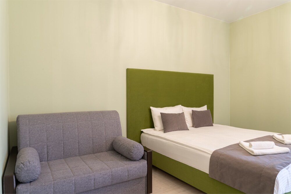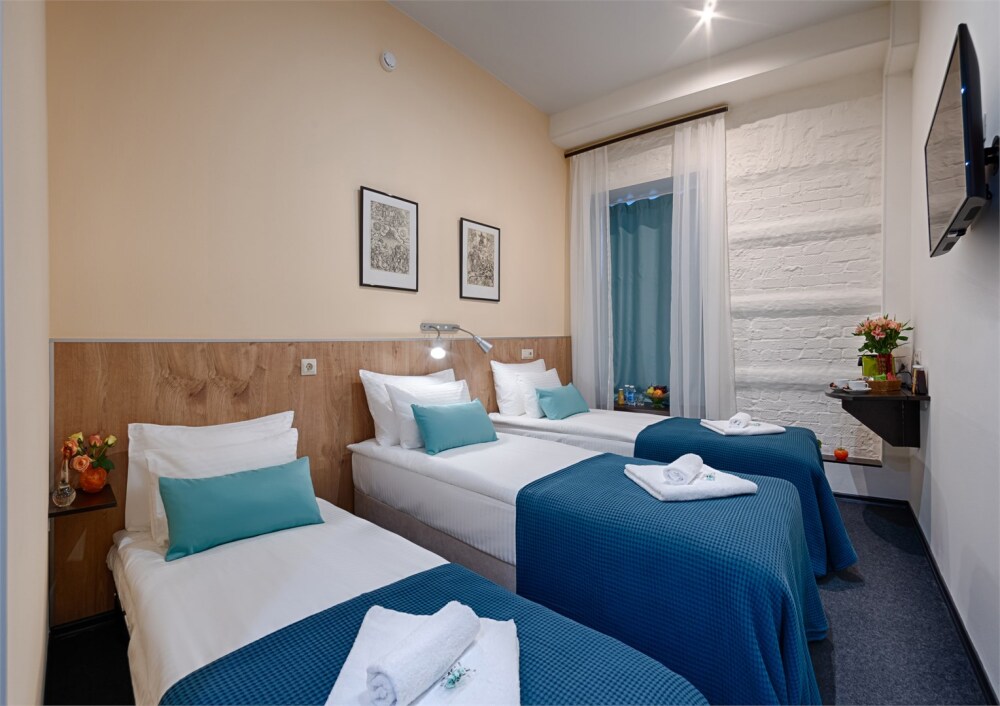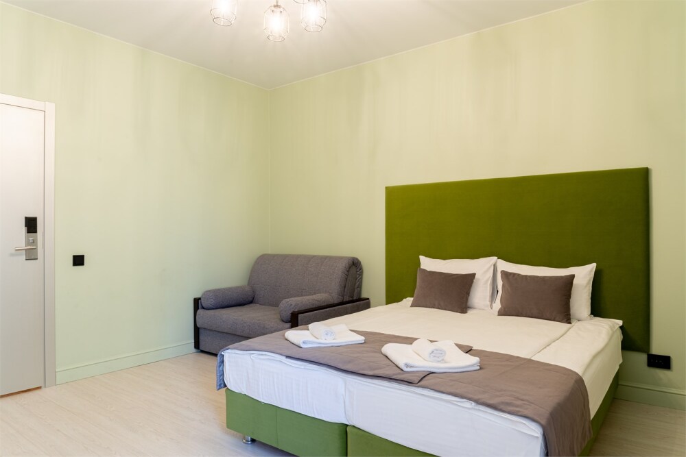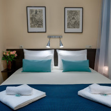 Кровать с ортопедическим матрасом. Часть номеров с отдельным входом с улицы. В номере центральная система вентиляции воздуха. Оснащение номера: телевизор с плоским экраном и Usb-разъемом, телефон для связи с ресепшн, комплект полотенец, гипоаллергенное постельное белье, светонепроницаемые шторы, беруши, щетка для одежды, рожок, губка и салфетка для обуви, вода в бутылках, средства личной гигиены (шампунь-гель для душа, жидкое мыло для рук, туалетная бумага). Возможность размещения доп. места (еврораскладушка).