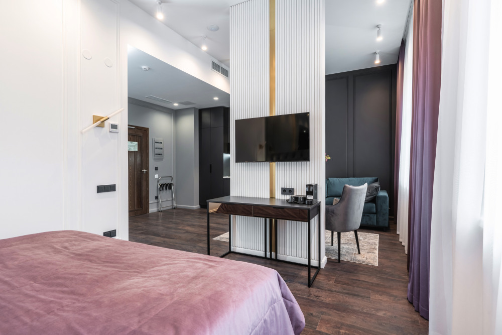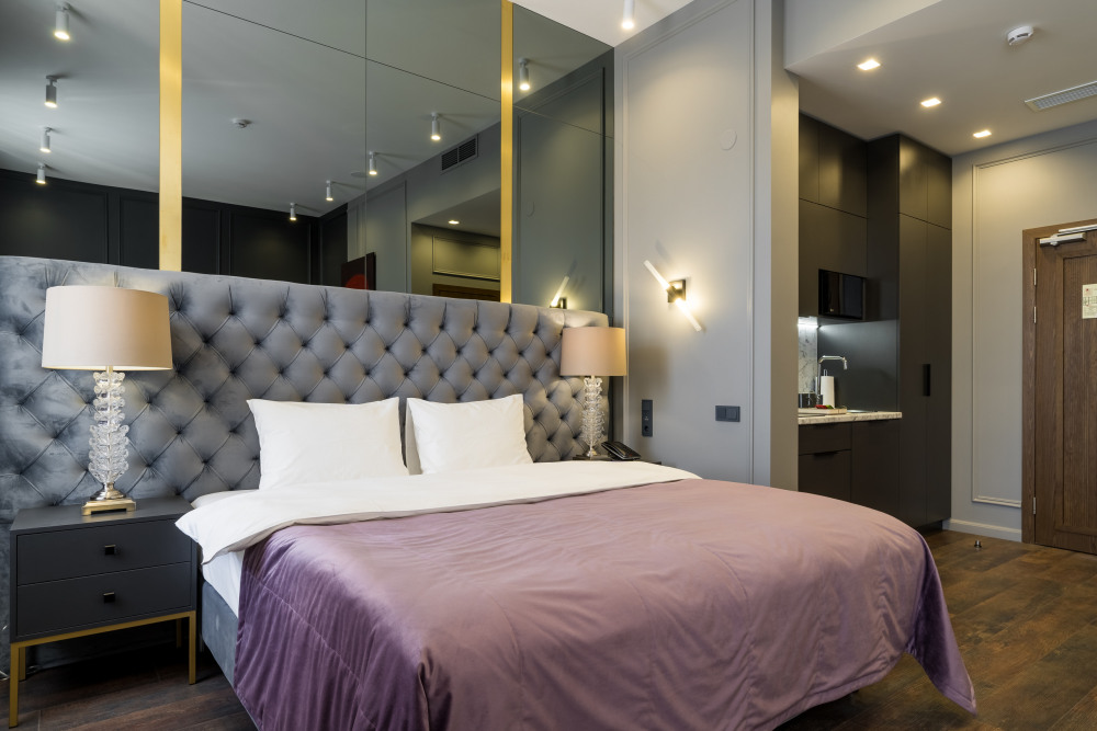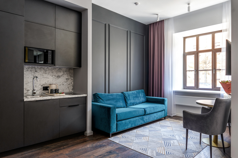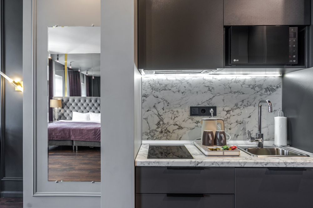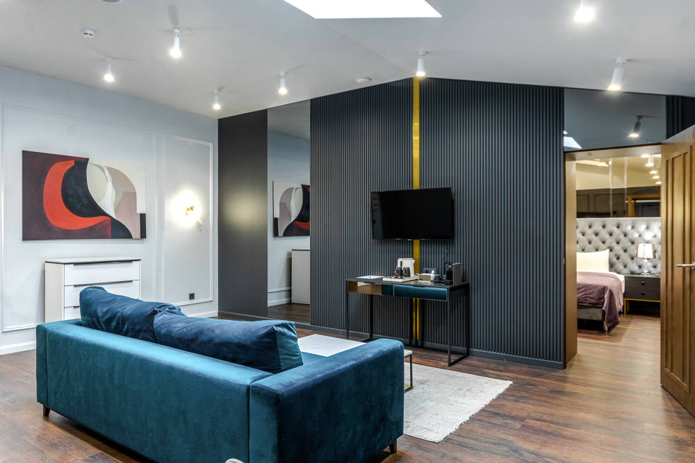 Просторный дизайнерский номер имеет две комнаты: спальню с двуспальной широкой кроватью и гостиную с диваном, кухонной и обеденной зоной.