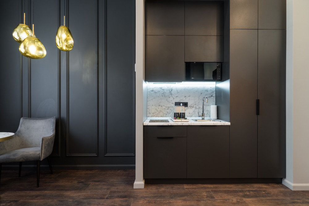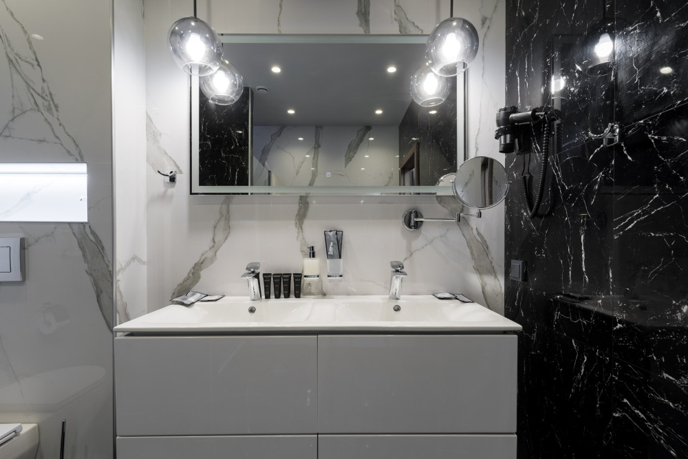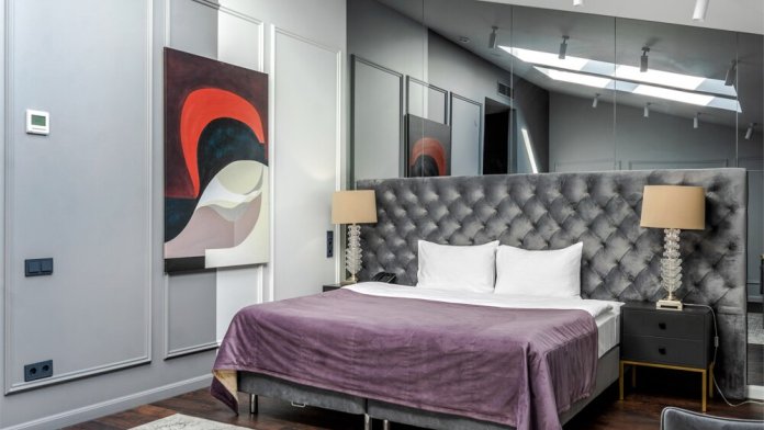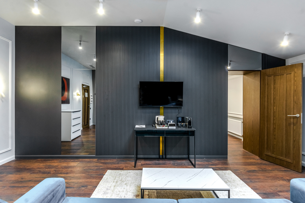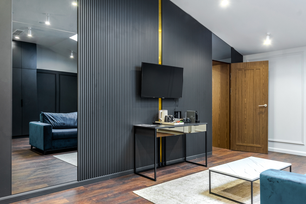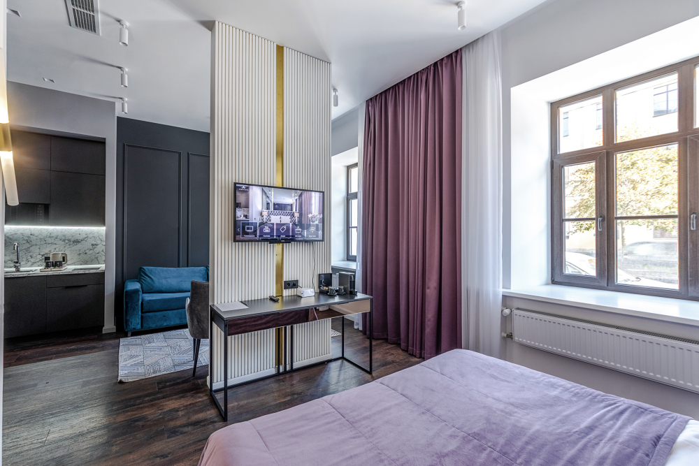 Просторный дизайнерский номер имеет две комнаты: спальню с двуспальной широкой кроватью и гостиную с диваном, кухонной и обеденной зоной.