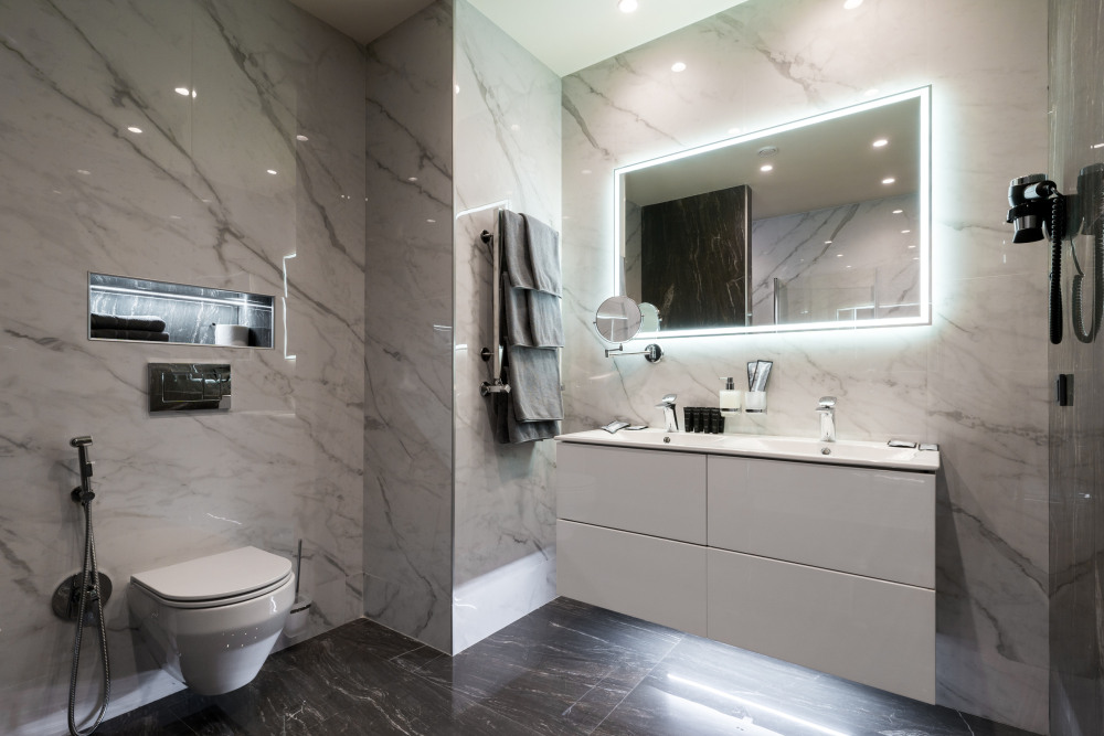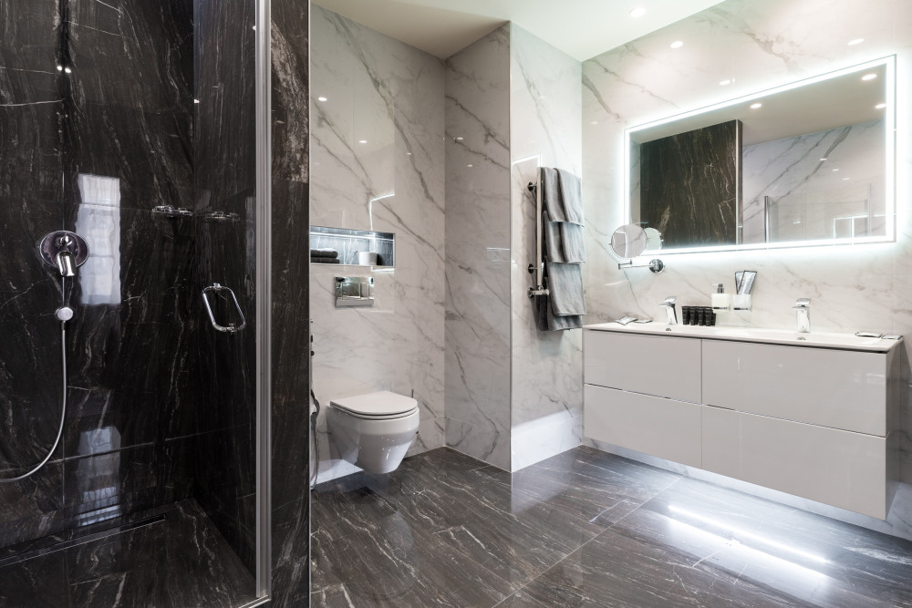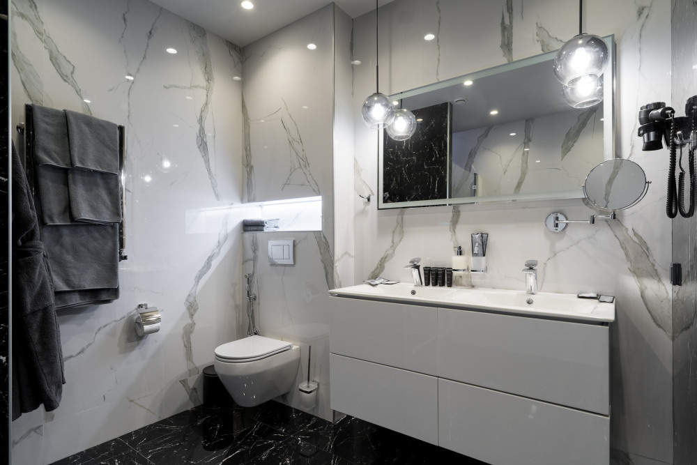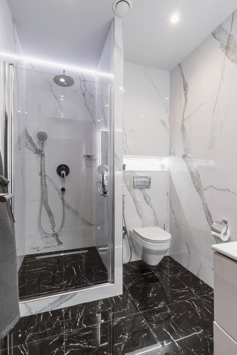 Просторная ванная комната имеет вход со стороны спальни и оборудована вместительной душевой кабиной, сдвоенной раковиной для умывания и туалетом, феном.