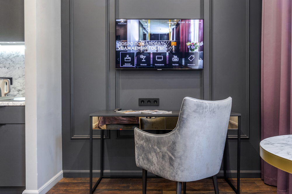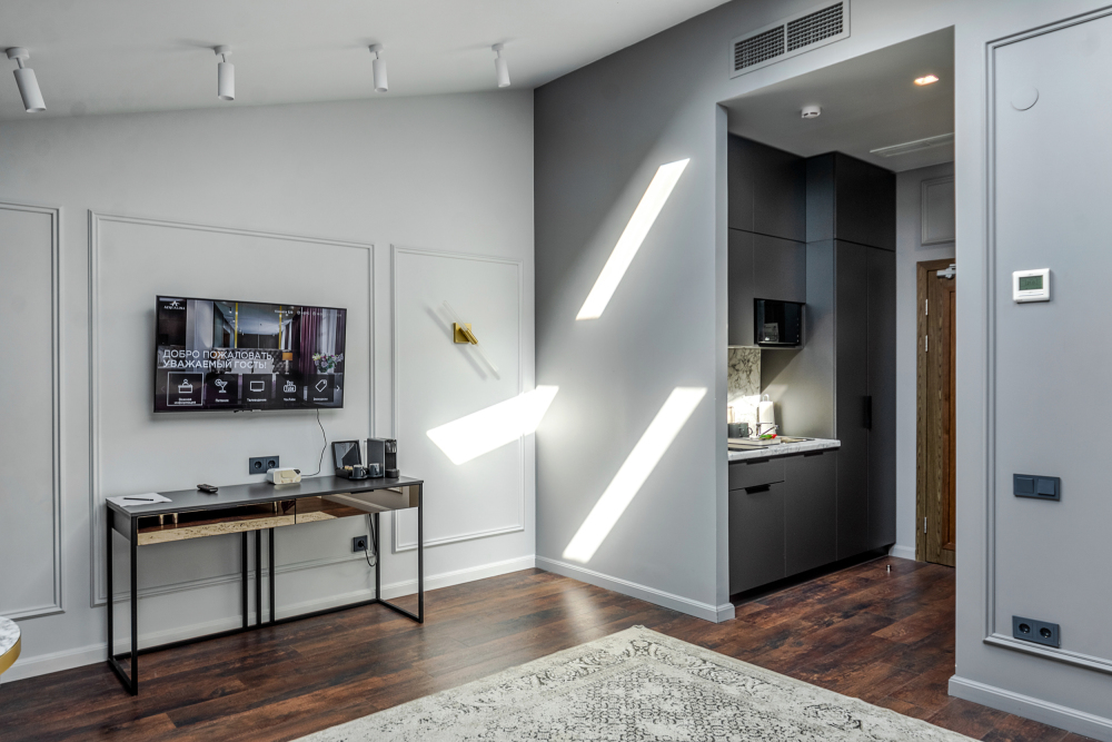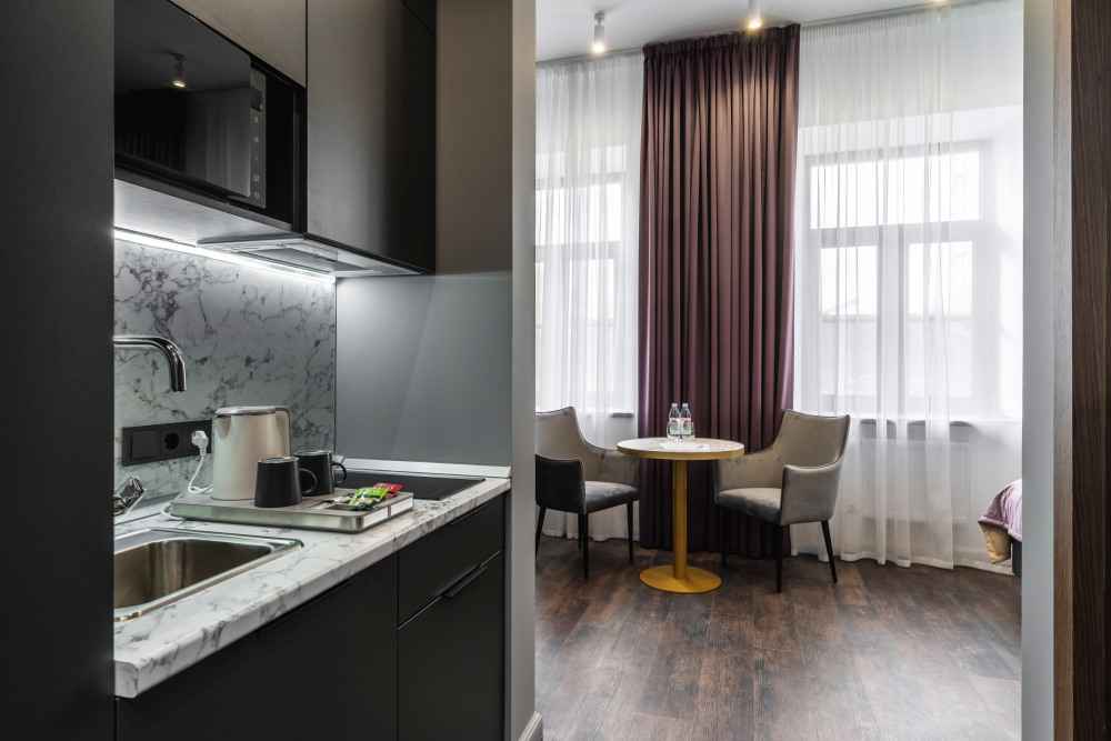 В номерах: две кроватяи-трансформеры, зона для работы и отдыха в виде стола и дизайнерских кресел, кухонный уголок с необходимой бытовой техникой (микроволновая печь, холодильник, варочная панель). Номера имеют повышенную шумоизоляцию и плотные шторы блэк-аут, что способствует комфортному пребыванию и спокойному отдыху. Ванная комната оборудована душевой кабиной, туалетом, феном и банными принадлежностями.