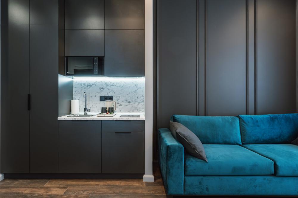 Спальная зона оборудована кроватями-трансформерами, а в гостиной зоне находится диван, кухонная и обеденная зона.