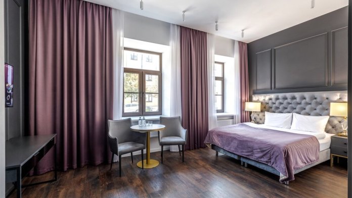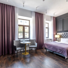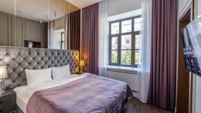 Отель включает в себя номера площадью от 21 до 56 кв. метров с различными вариантами планировочных решений: от мансардных номеров «Стандарт» до просторных двухкомнатных номеров «Люкс» с кухонной зоной.