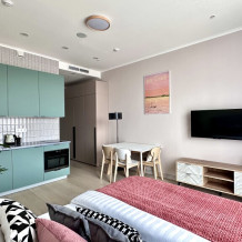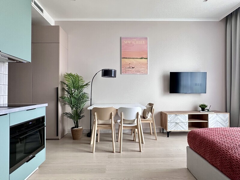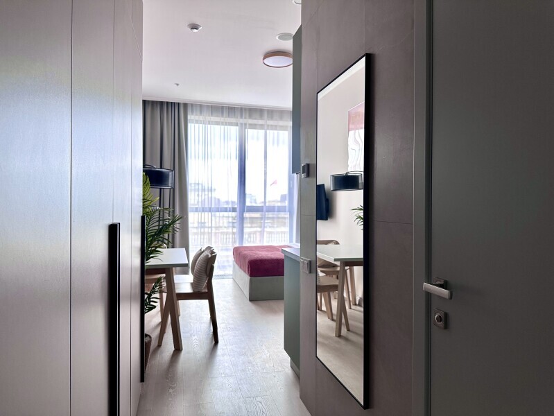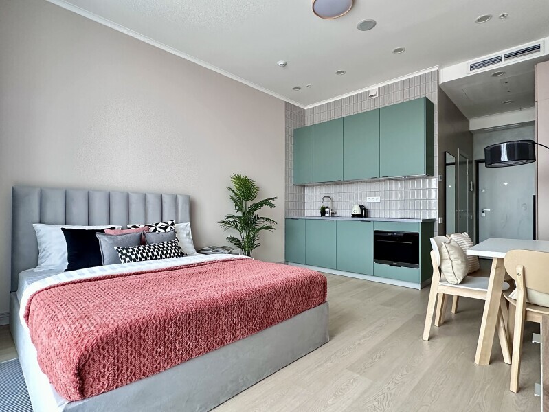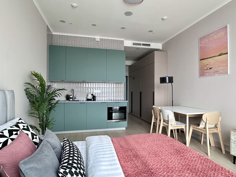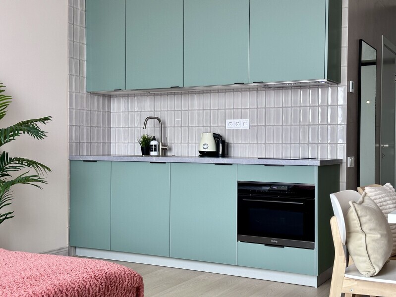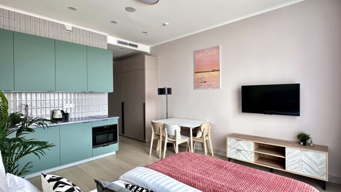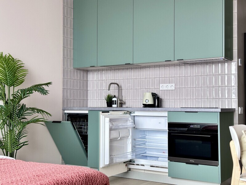 - Полноценная кухня с холодильником есть во всех апартаментах.