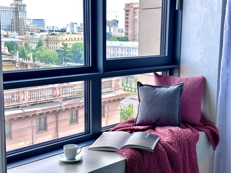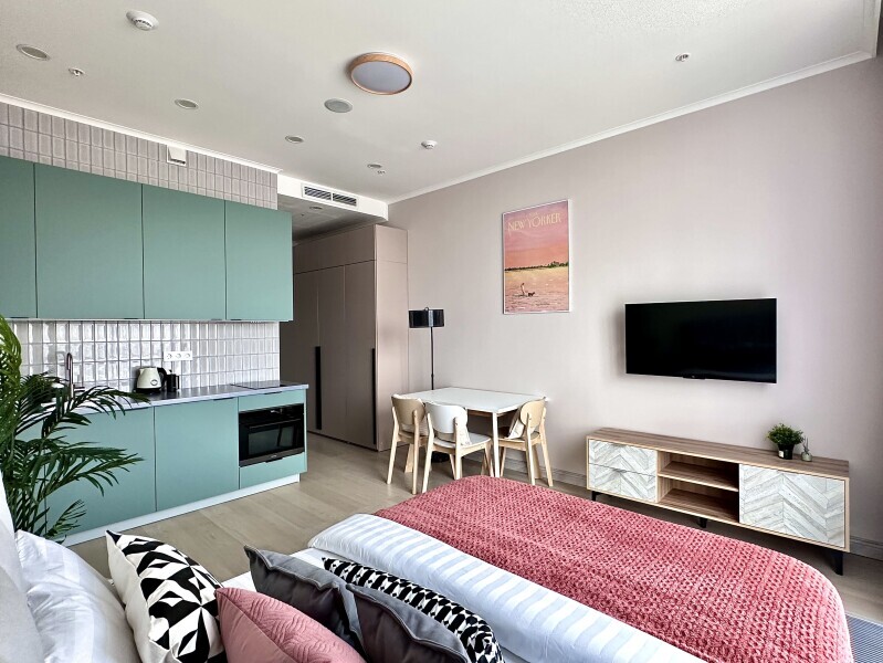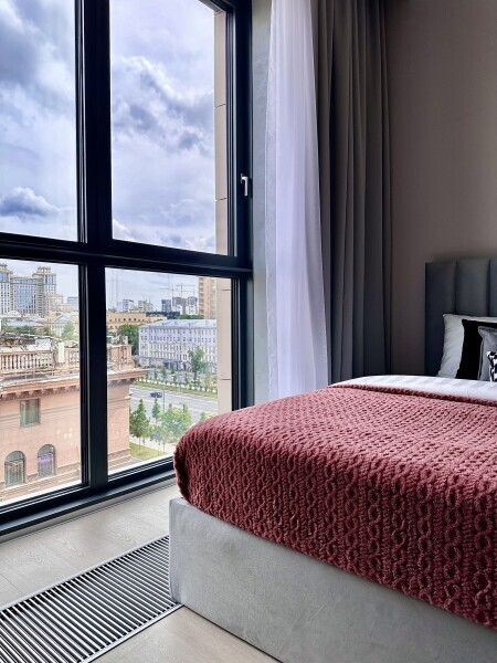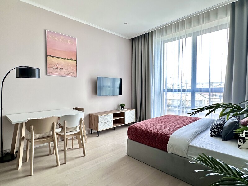 Просторные дизайнерские апартаменты с панорамными окнами. Прекрасный выбор чтобы отдохнуть в тишине в центре столицы и насладится закатными видами.