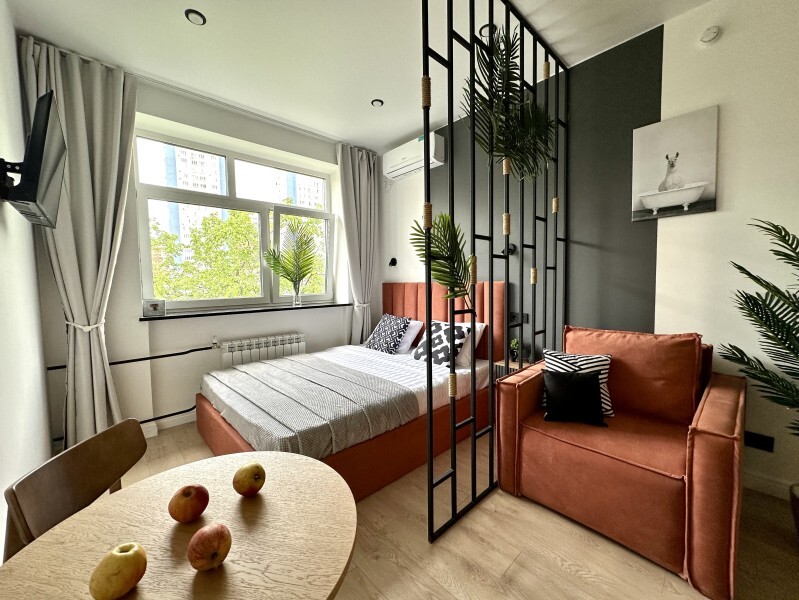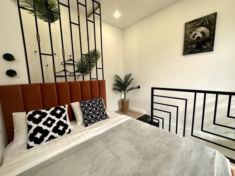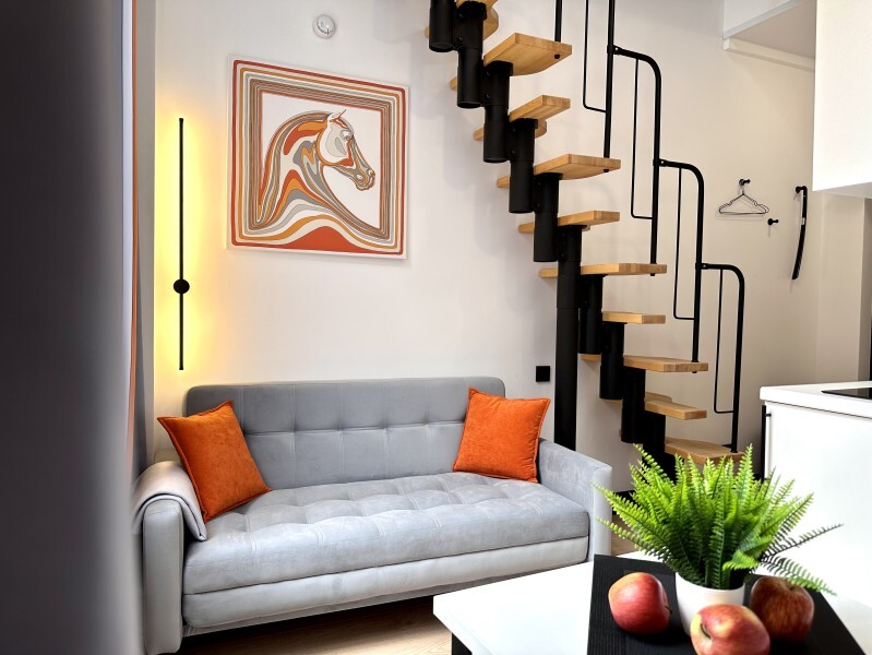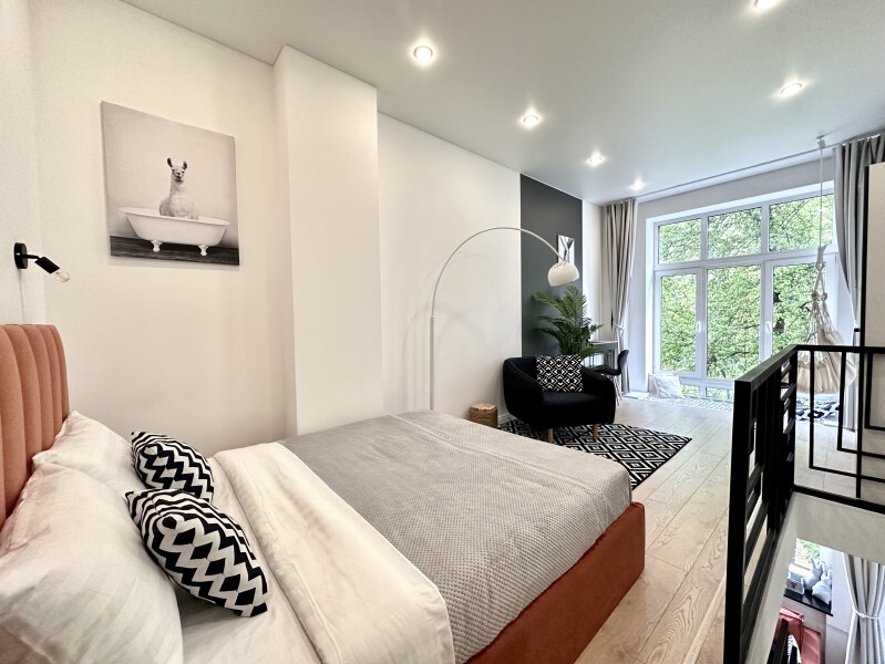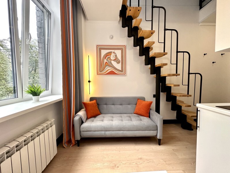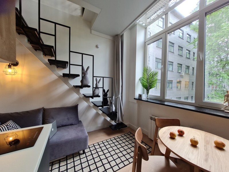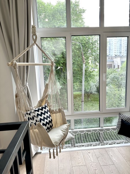 Оригинальный вариант жилья с двухуровневым расположением. В апартаментах 6-ти метровые французские окна в два этажа, есть кресло-качели и сетка-гамак у окна на втором этаже, здесь вы можете полежать, отдохнуть и насладится видом из окна.