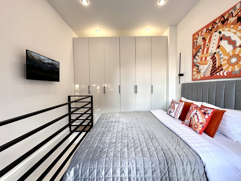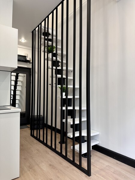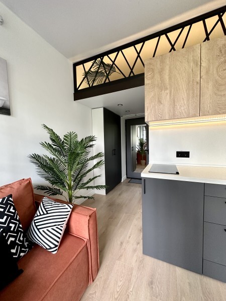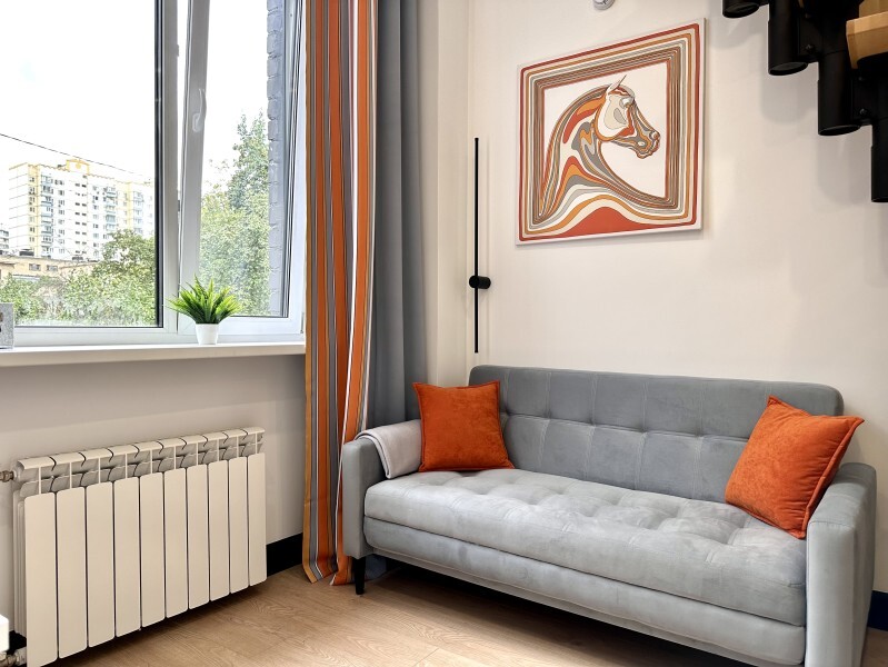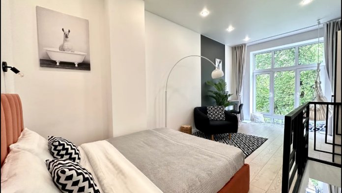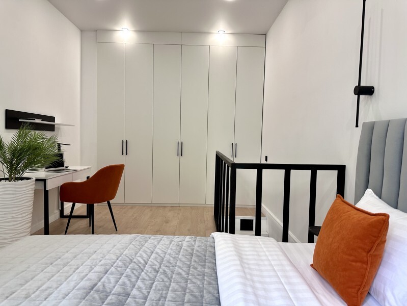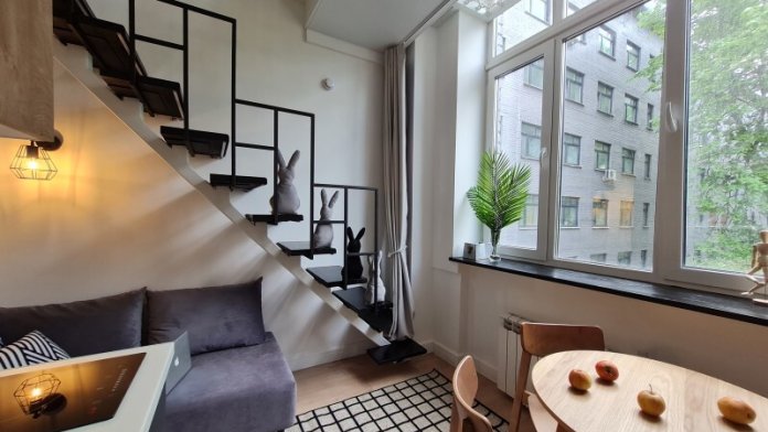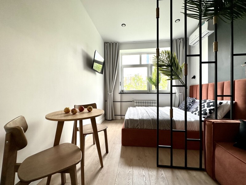 Оригинальный вариант жилья с двухуровневым расположением. В апартаментах 6-ти метровые французские окна в два этажа, есть кресло-качели и сетка-гамак у окна на втором этаже, здесь вы можете полежать, отдохнуть и насладится видом из окна.