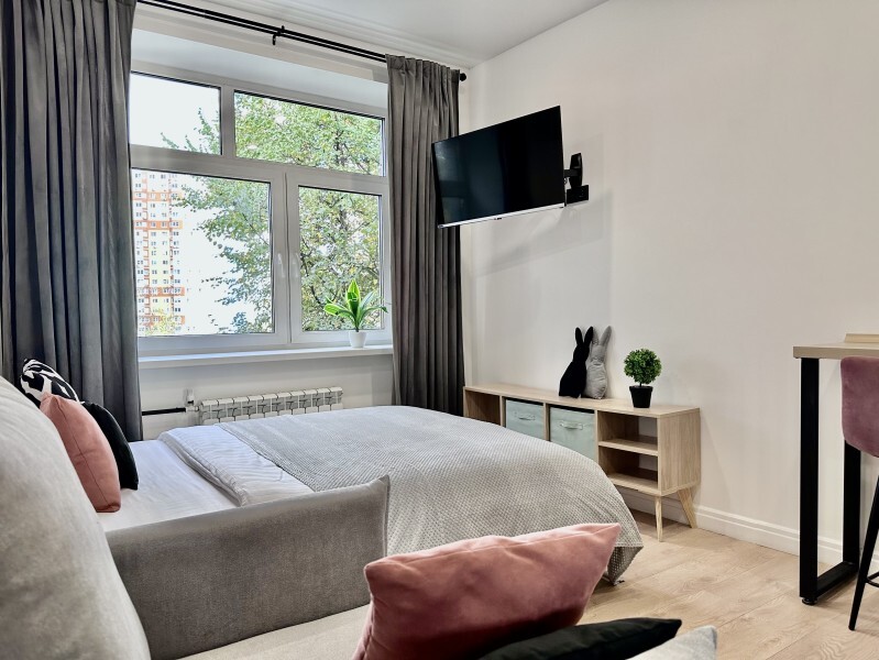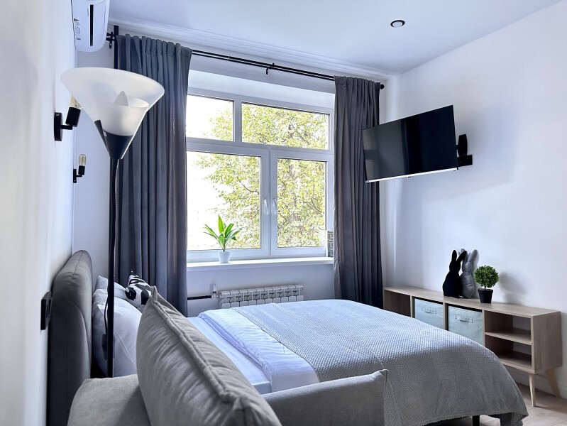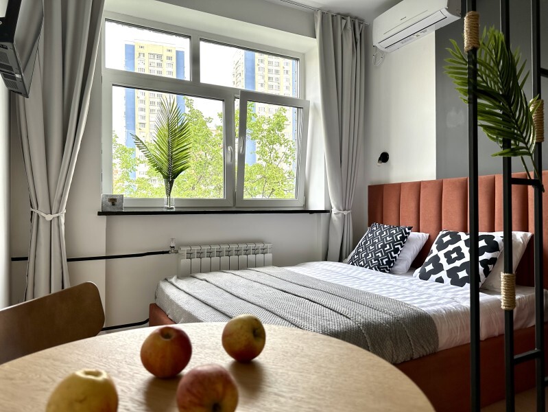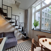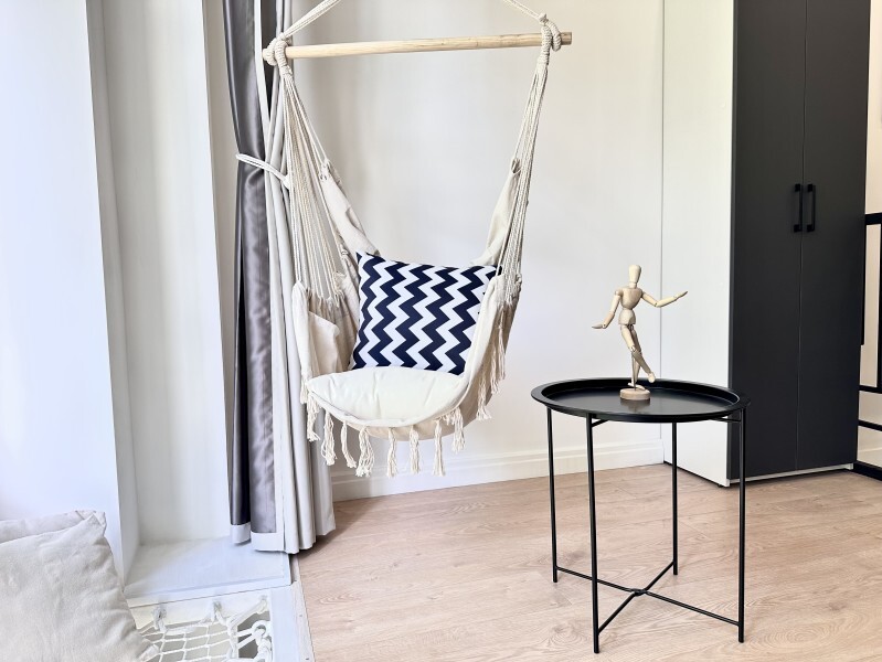 Оригинальный вариант жилья с двухуровневым расположением. В апартаментах 6-ти метровые французские окна в два этажа, есть кресло-качели и сетка-гамак у окна на втором этаже, здесь Вы можете полежать, отдохнуть и насладится видом из окна.