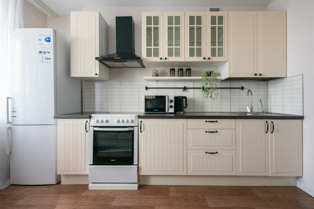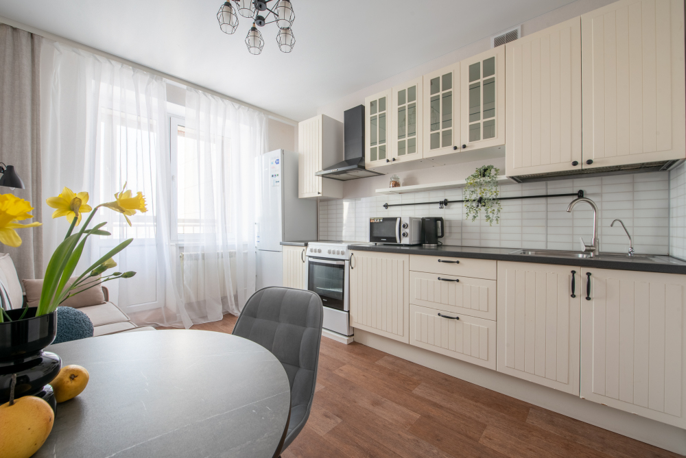 - Все необходимые кухонные принадлежности для комфортного приготовления еды (новая посуда, электрический чайник, холодильник, микроволновая печь).