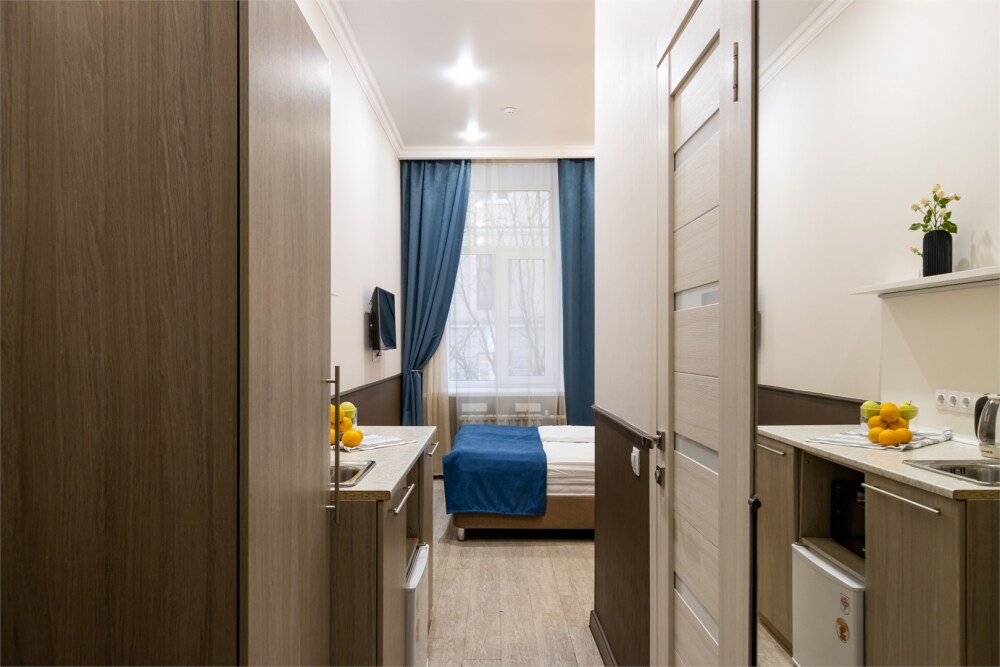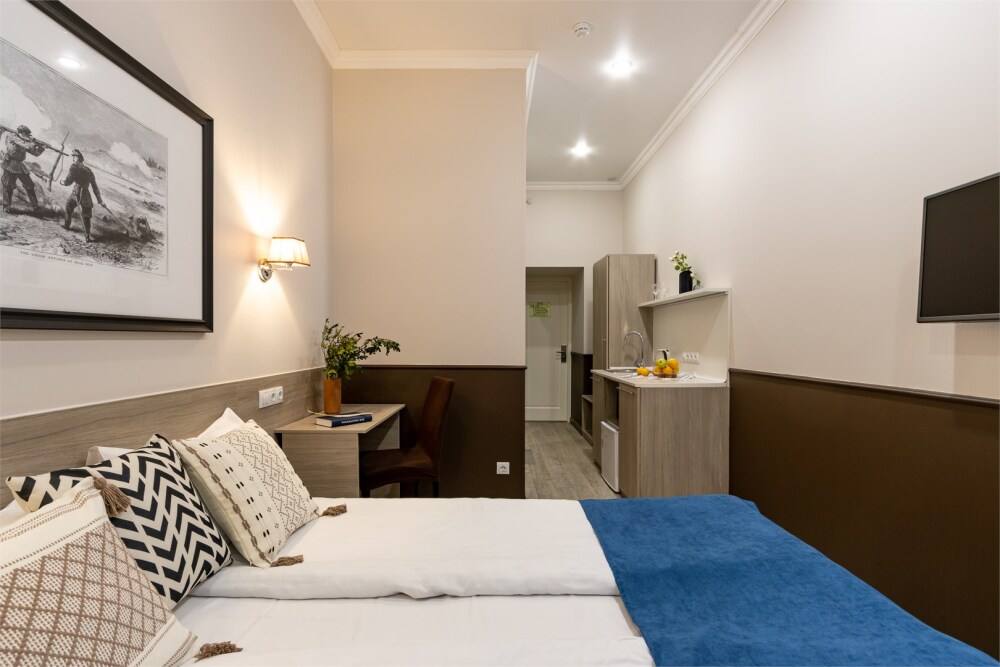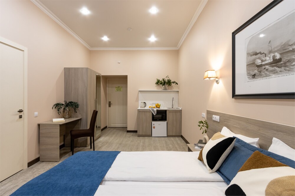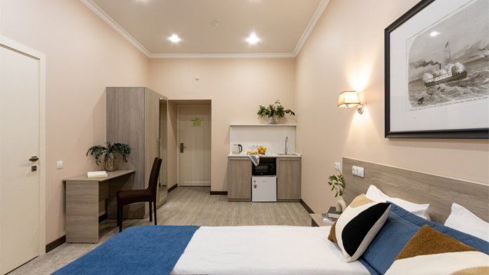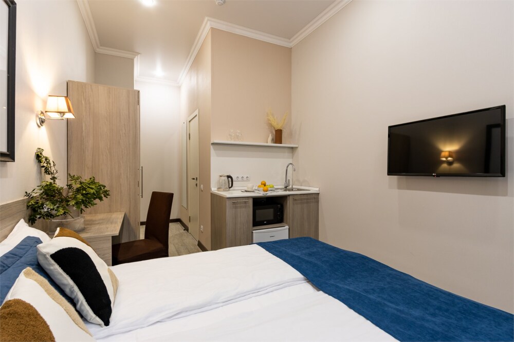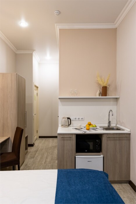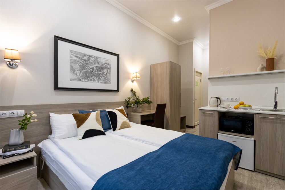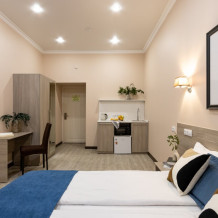 Номер площадью до 16-18 кв.м. В номере одна большая кровать 170х200 см Предназначен для проживания 1-2 человек. Этот светлый и нежный номер с собственной мини-кухней, отдельной ванной комнатой и классическим дизайном отлично подойдет для пары. Небольшой холодильник, раковина и микроволновая печь помогут гостям сделать себе горячий ужин, если им захочется остаться в номере и посмотреть телевизор с плоским экраном, расслабившись на уютной кровати с белоснежным бельём и полотенцами.