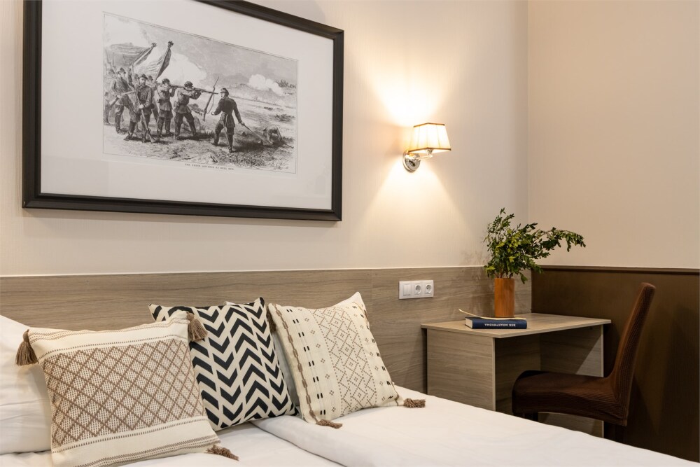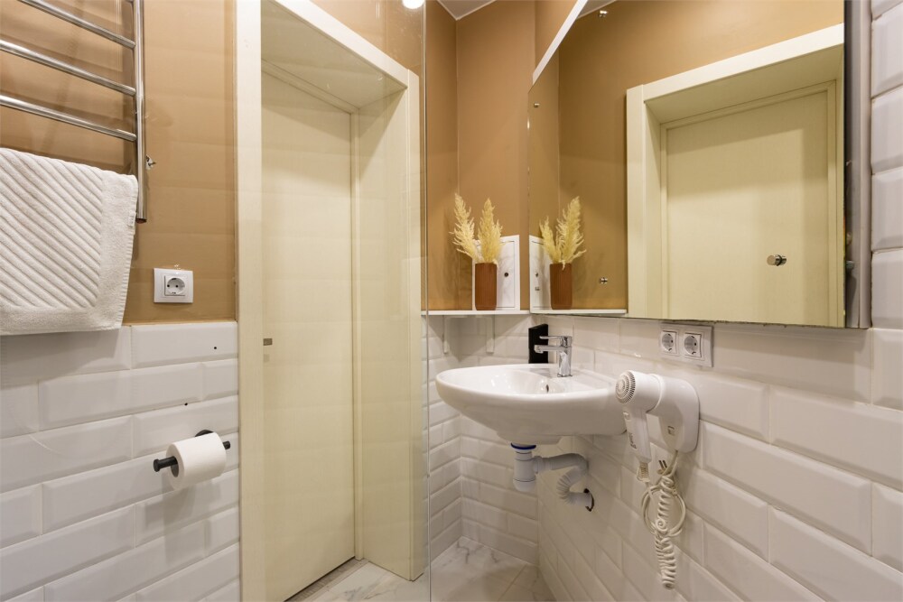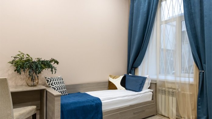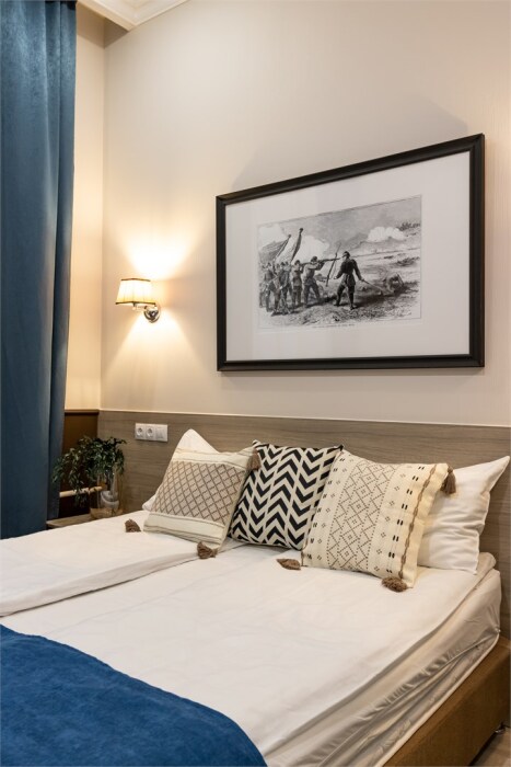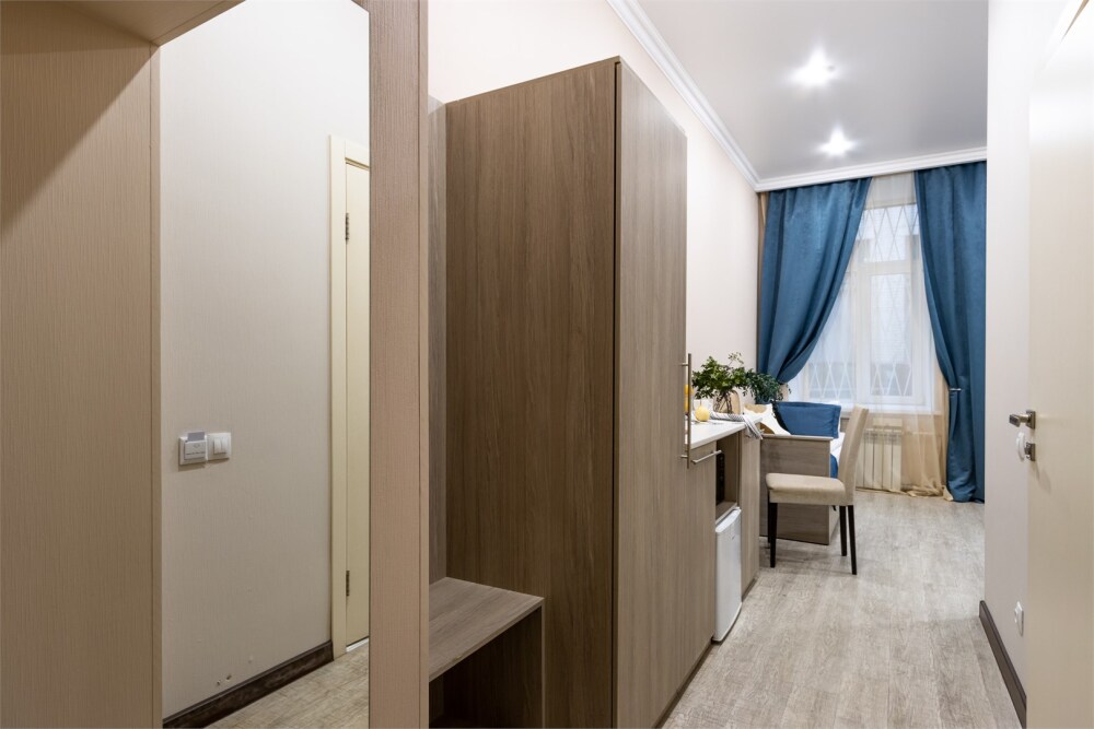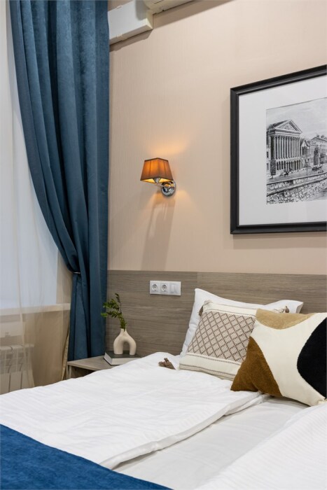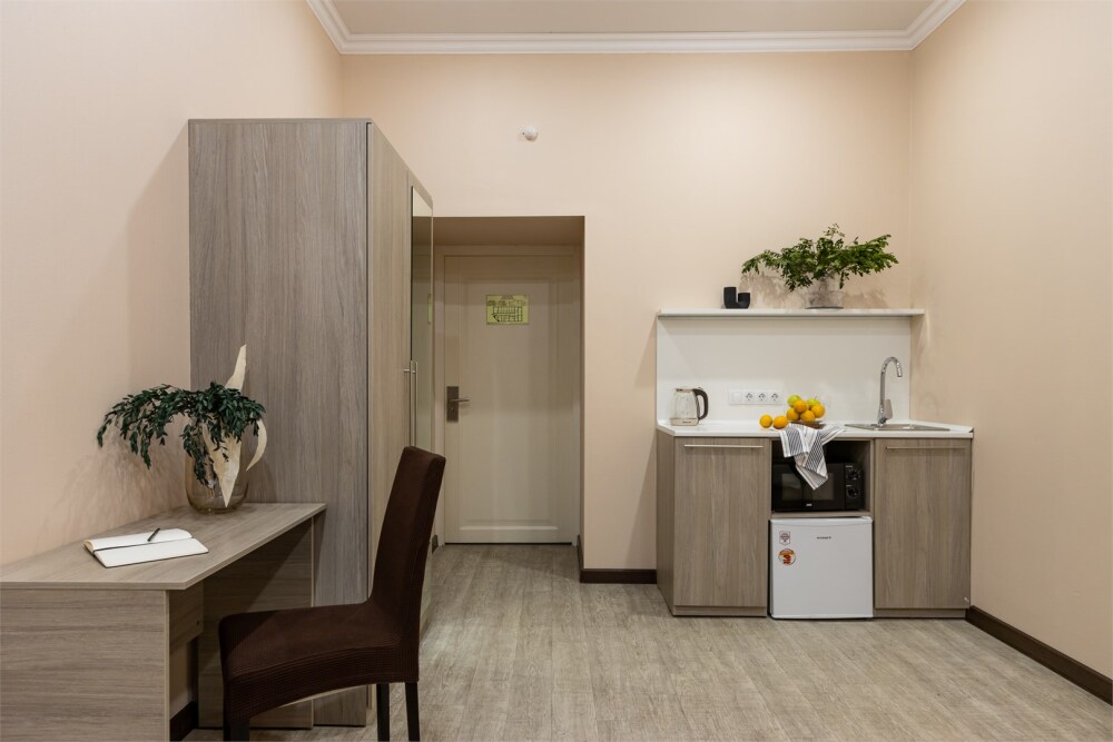 Номер площадью до 16-18 кв.м. В номере одна большая кровать 170х200 см Предназначен для проживания 1-2 человек. Этот светлый и нежный номер с собственной мини-кухней, отдельной ванной комнатой и классическим дизайном отлично подойдет для пары. Небольшой холодильник, раковина и микроволновая печь помогут гостям сделать себе горячий ужин, если им захочется остаться в номере и посмотреть телевизор с плоским экраном, расслабившись на уютной кровати с белоснежным бельём и полотенцами.