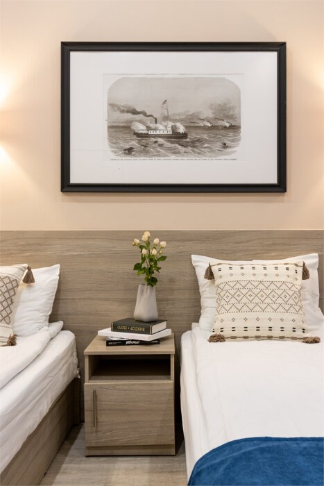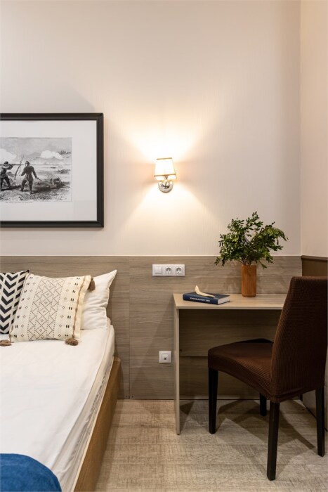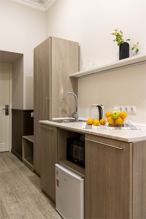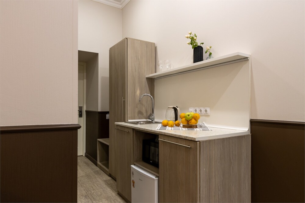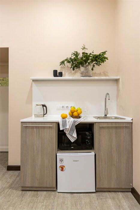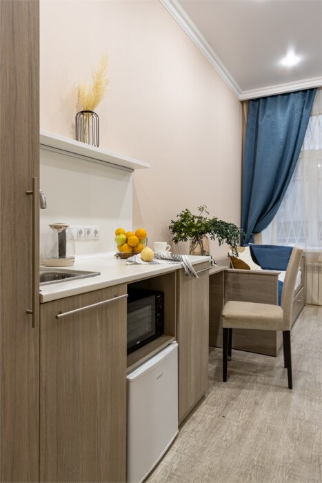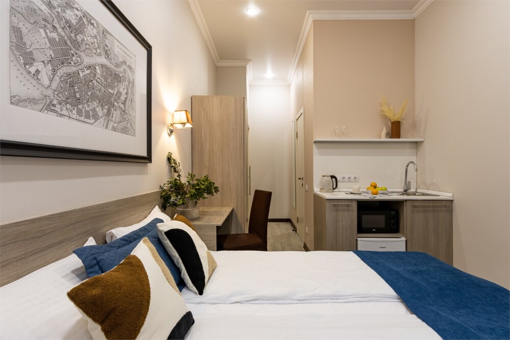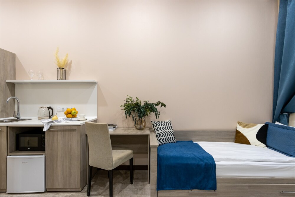 Каждый из этих апарт-номеров с одной двуспальной кроватью либо с 2 раздельными кроватями имеет собственную ванную комнату и мини-кухню с раковиной, небольшим холодильником и микроволновой печью, что гарантирует гостям максимально комфортный отдых. Универсальный стол подойдёт как для работы, так и для чаепития, удобный шкаф разместит багаж. Спальная система «Box spring», которой отдают предпочтение отели всего мира, позаботится о сне гостей, а телевизор с плоским экраном убаюкает после насыщенного дня.