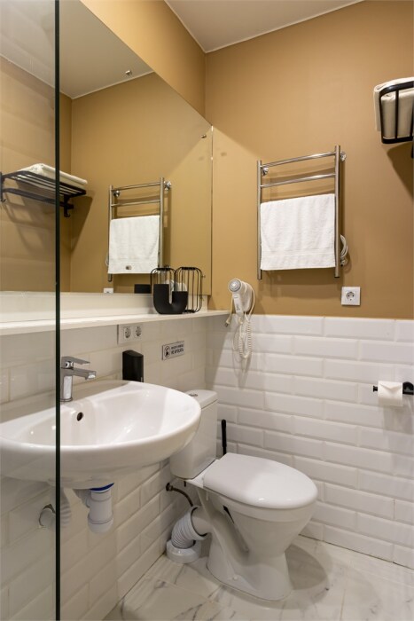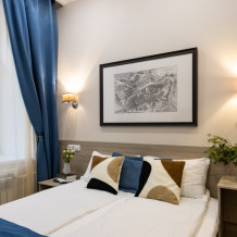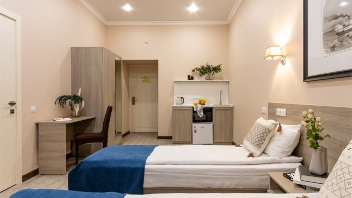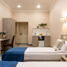 Номер площадью до 16-18 кв.м. В номере одна большая кровать 170х200 см или 2 раздельные. Предназначен для проживания 1-2 человек. Этот светлый и нежный номер с собственной мини-кухней, отдельной ванной комнатой и классическим дизайном отлично подойдет для пары. Небольшой холодильник, раковина и микроволновая печь помогут гостям сделать себе горячий ужин, если им захочется остаться в номере и посмотреть телевизор с плоским экраном, расслабившись на уютной кровати с белоснежным бельём и полотенцами.