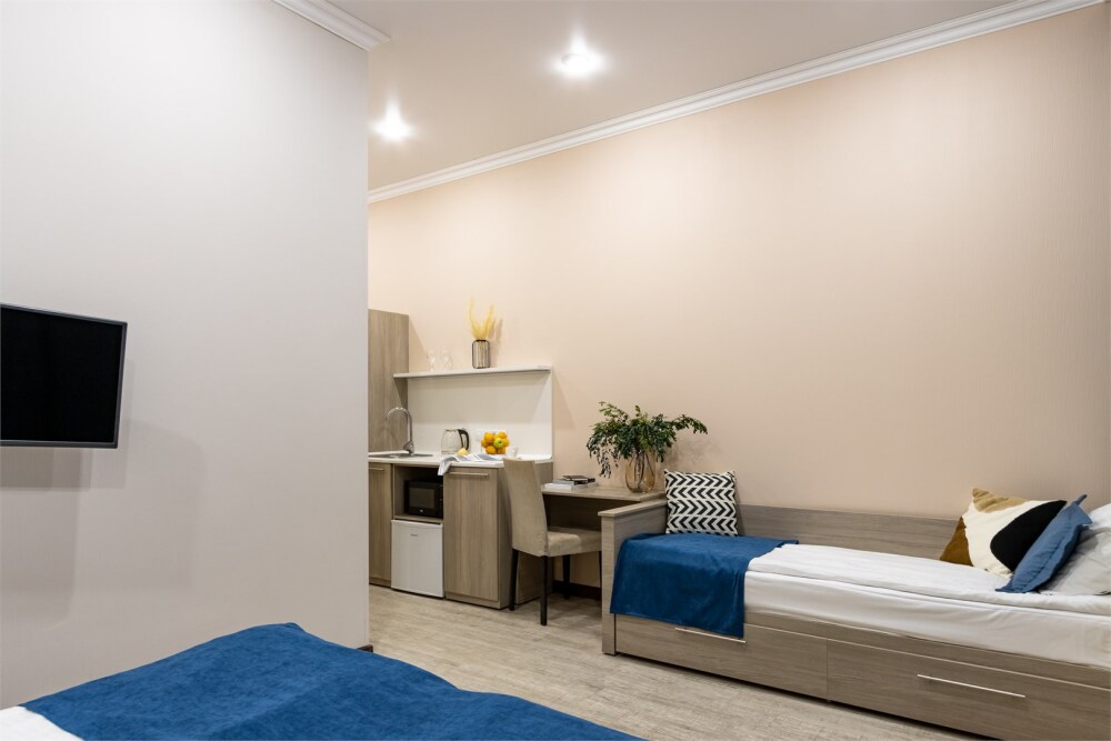 Каждый из этих апарт-номеров с одной двуспальной кроватью либо 2 раздельными кроватями диваном имеет собственную ванную комнату и мини-кухню с раковиной, небольшим холодильником и микроволновой печью, что гарантирует гостям максимально комфортный отдых. Спальная система «Box spring», которой отдают предпочтение отели всего мира, позаботится о сне гостей, а телевизор с плоским экраном убаюкает после насыщенного дня. Дополнительно установлена удобная кушетка для размещения третьего гостя.