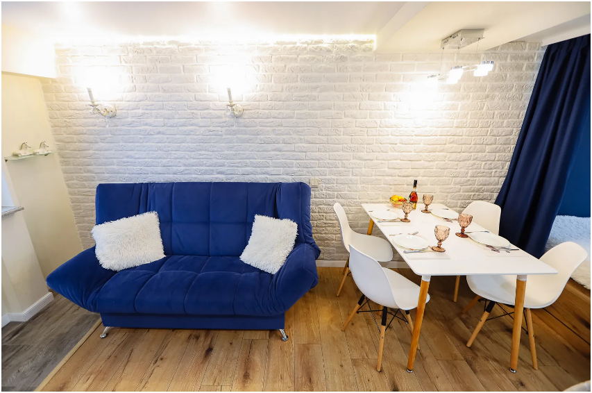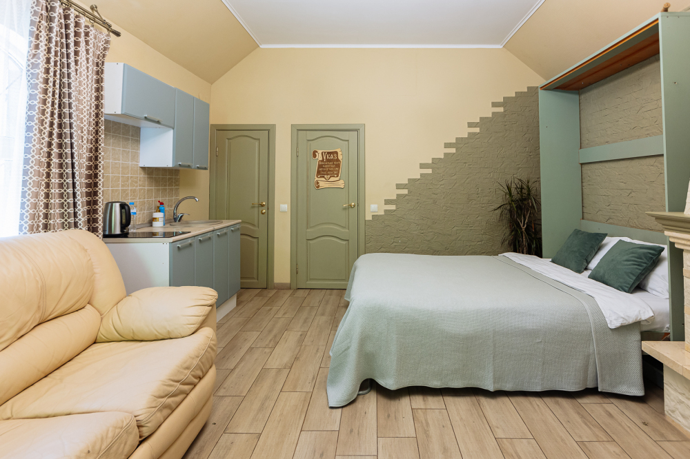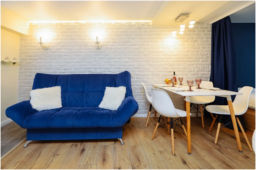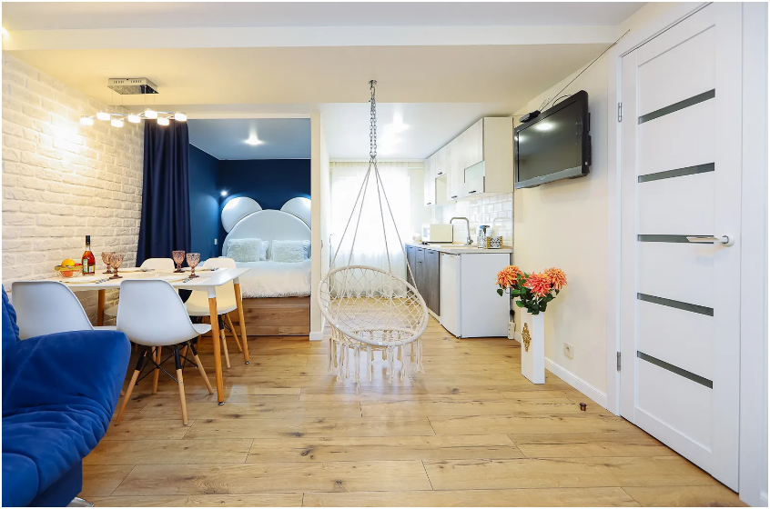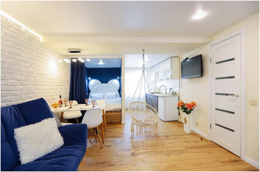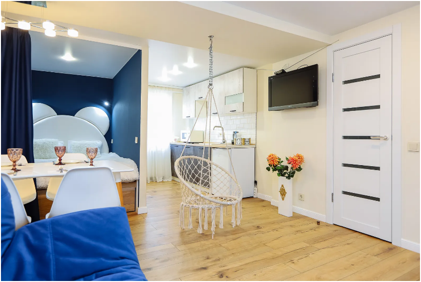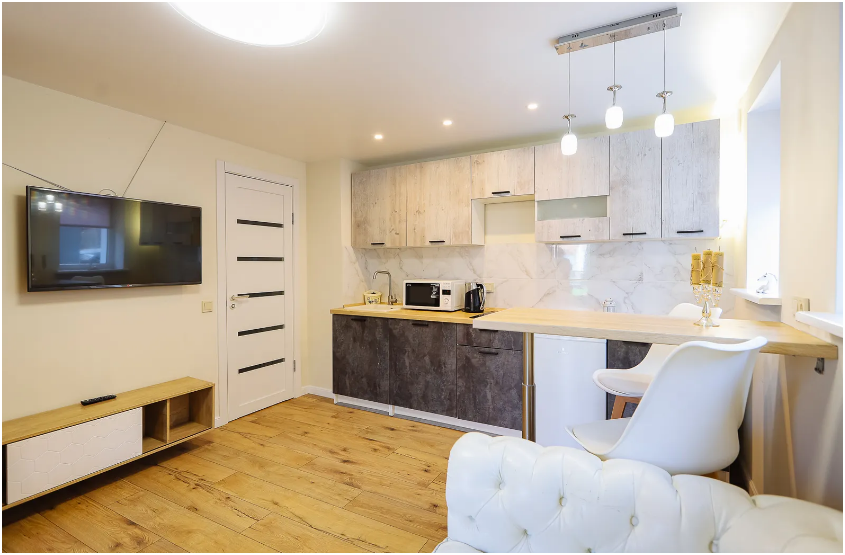 В студии сделан новый дизайнерский ремонт, есть шумоизоляция: телевизор, фен, утюг, удобный большой ортопедический диван и кровать (160/200), современная кухня со всем необходимым, микроволновая печь, санузел с душевой, средства гигиены, стиральная машина, постельное белье, полотенца, продуманная система освещения, гардеробная.