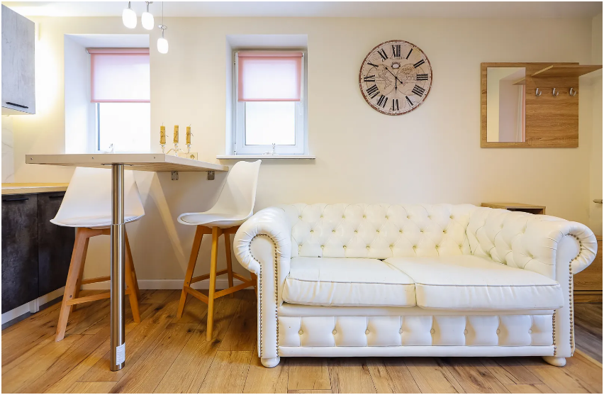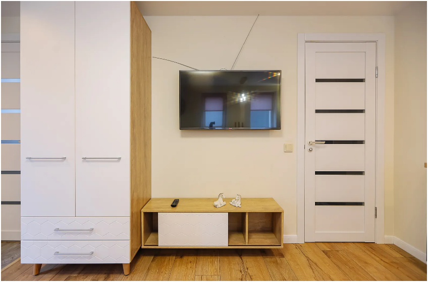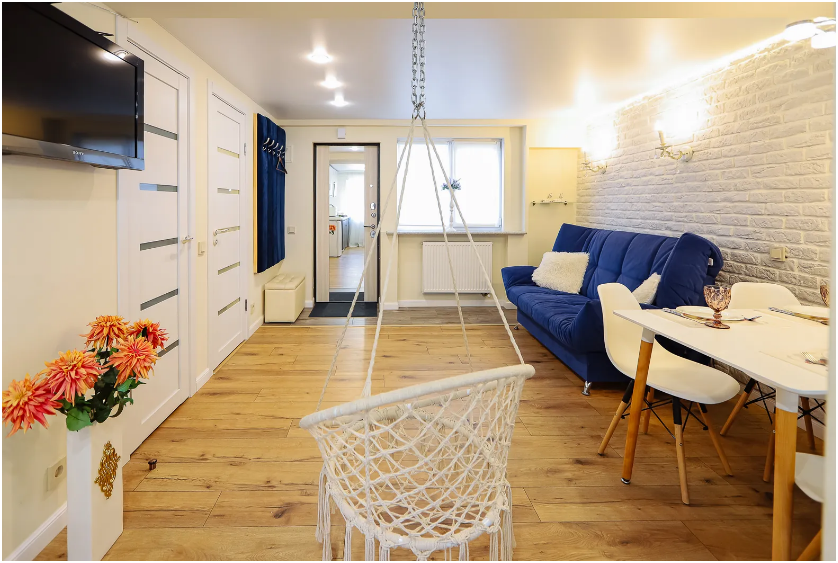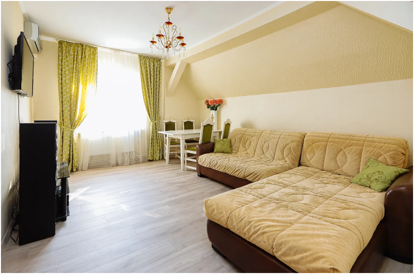 В гостиной: диван, который при желании можно расправить 300/300, телевизор, обеденный стол, стулья.