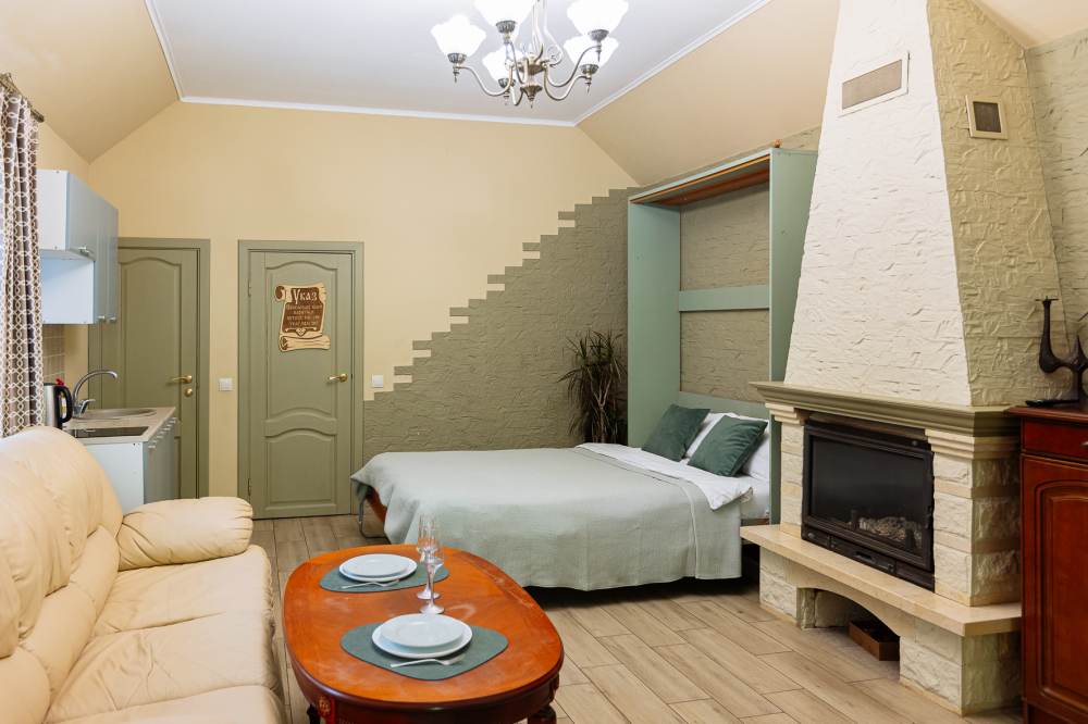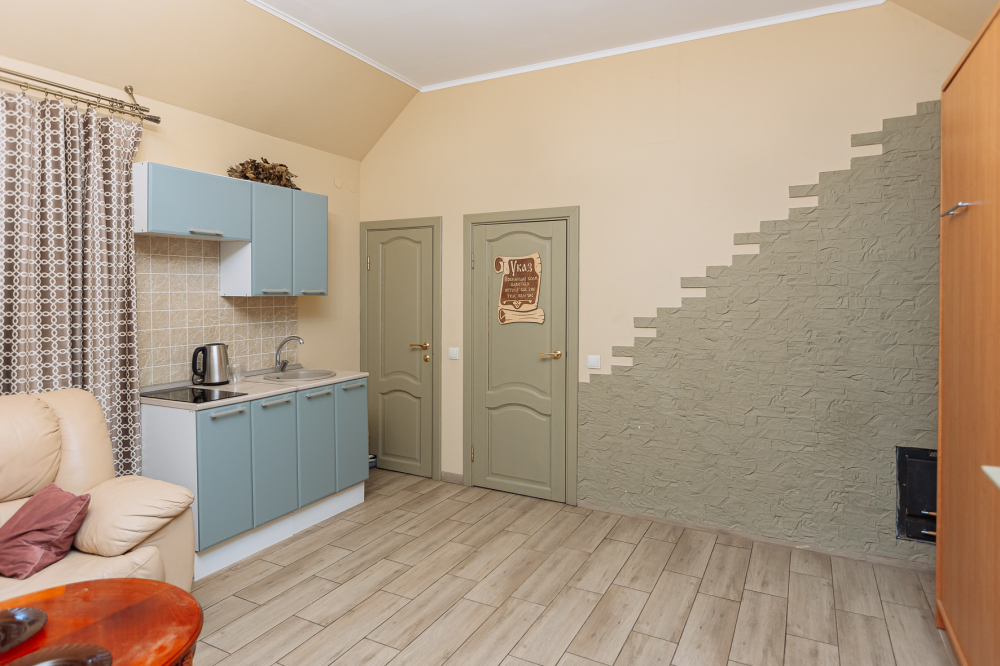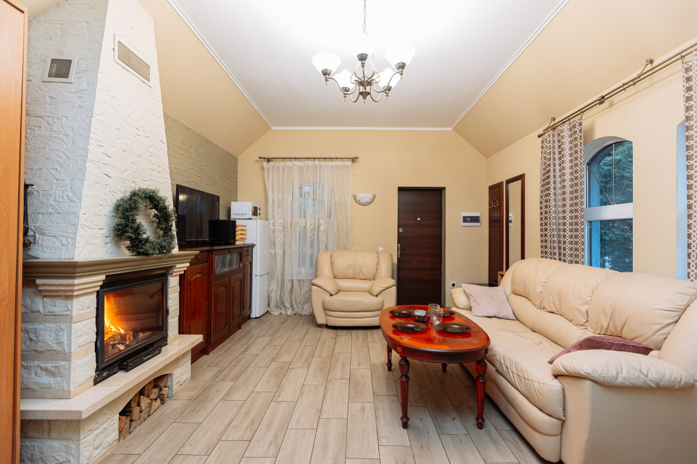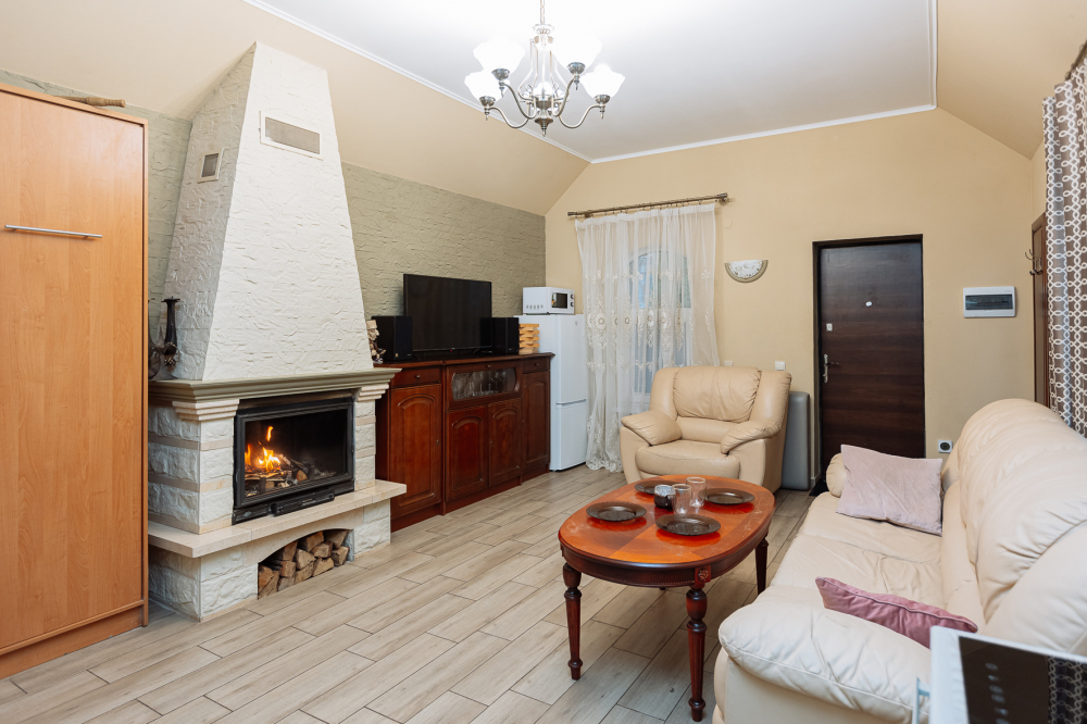 В доме имеется мини-кухня, вся необходимая посуда, чайник, кровать, 2-спальный диван, стол, кресла.