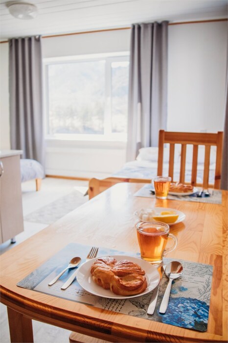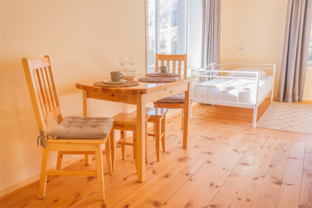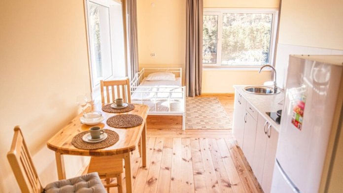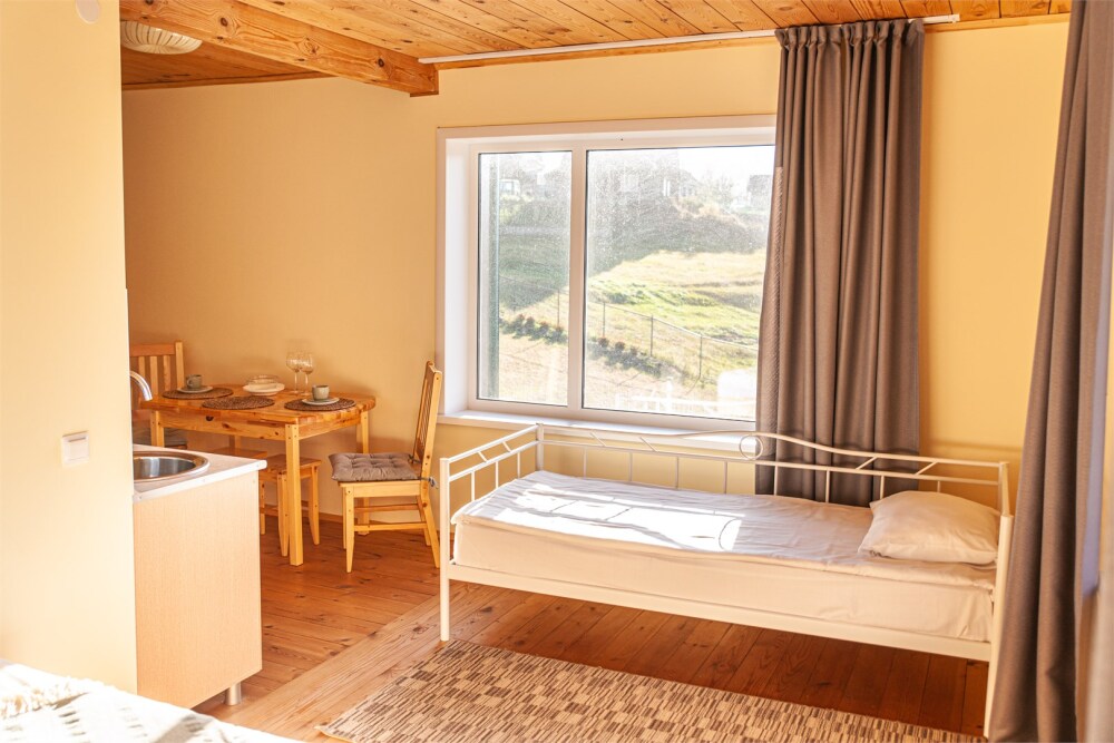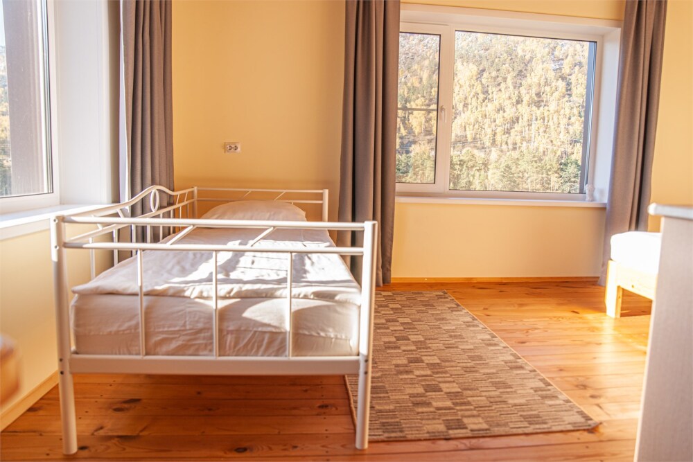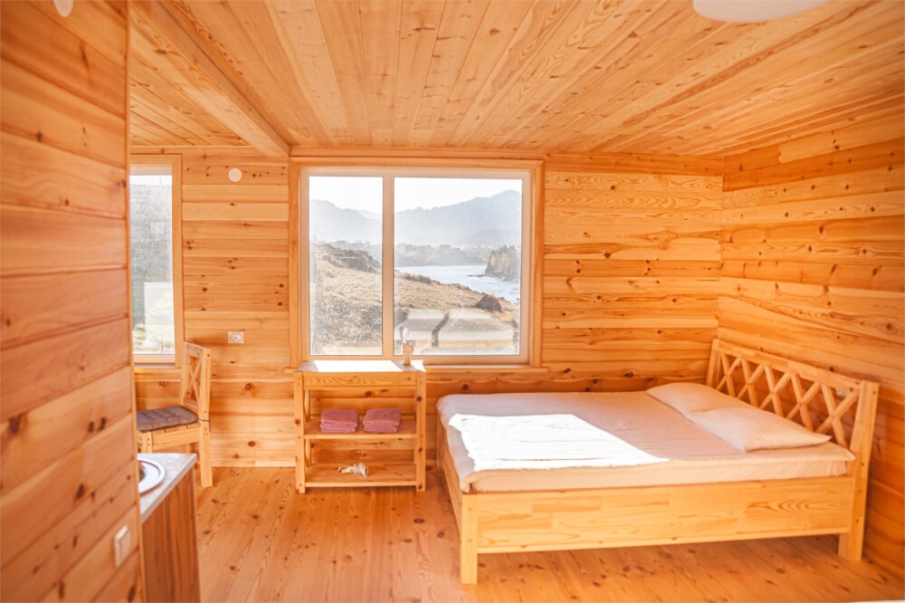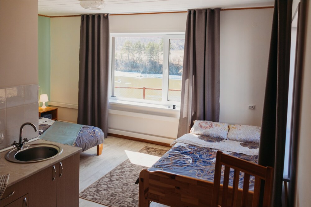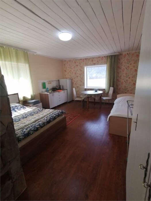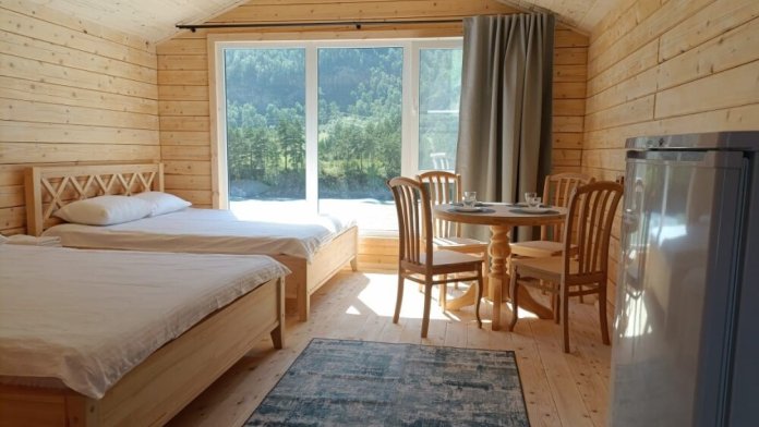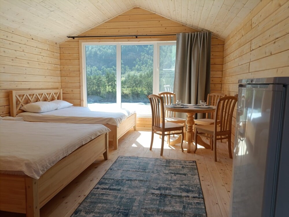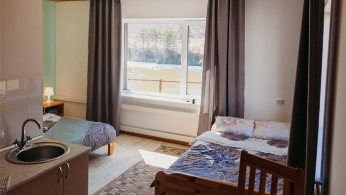 Двухместный номер с одной двуспальной кроватью, с кухней и ванной комнатой в номере, с прекрасным видом из окна на Катунь.