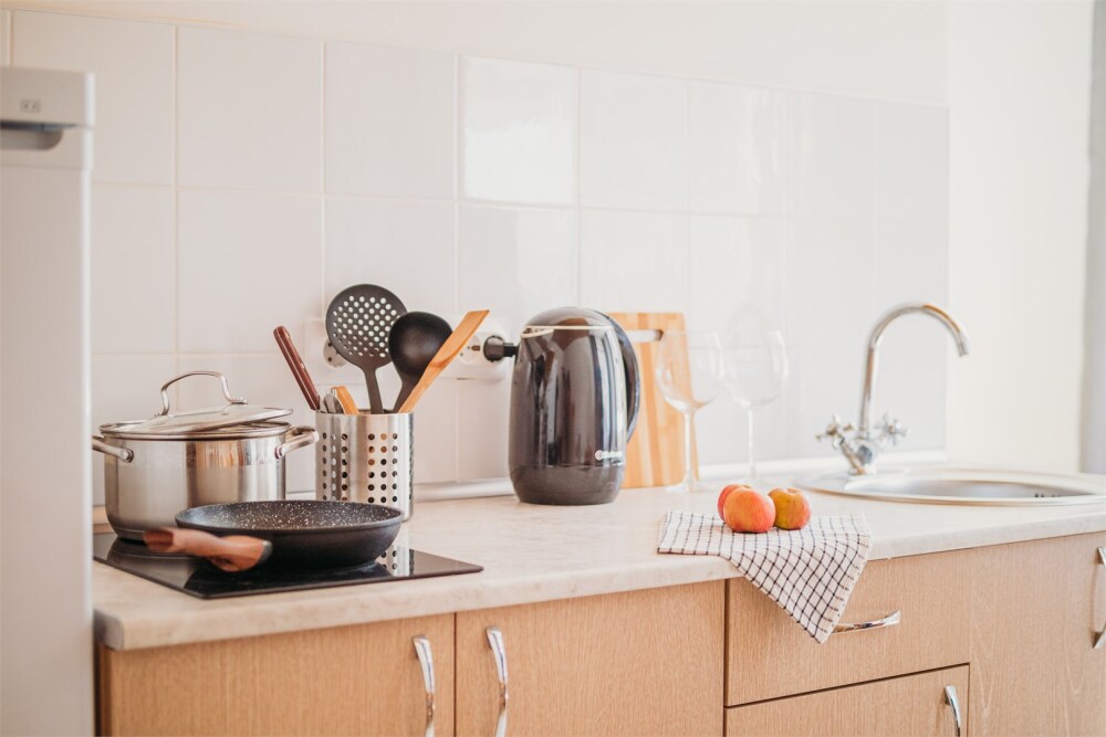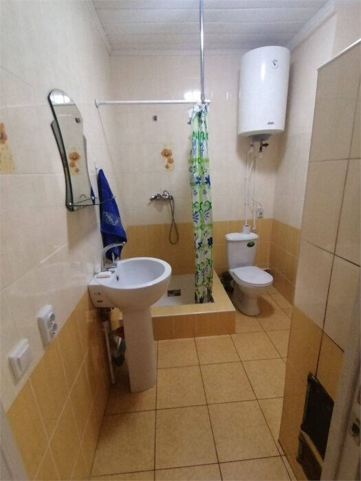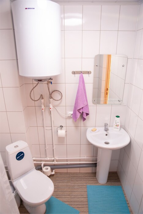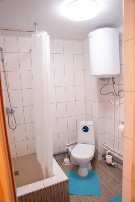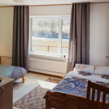 Трёхместный благоустроенный номер для троих гостей с одной двуспальной кроватью и одной односпальной кроватью. С кухней и ванной комнатой в номере.