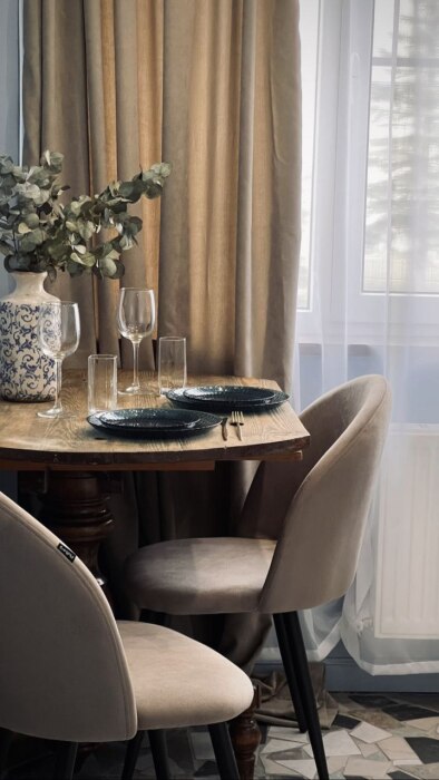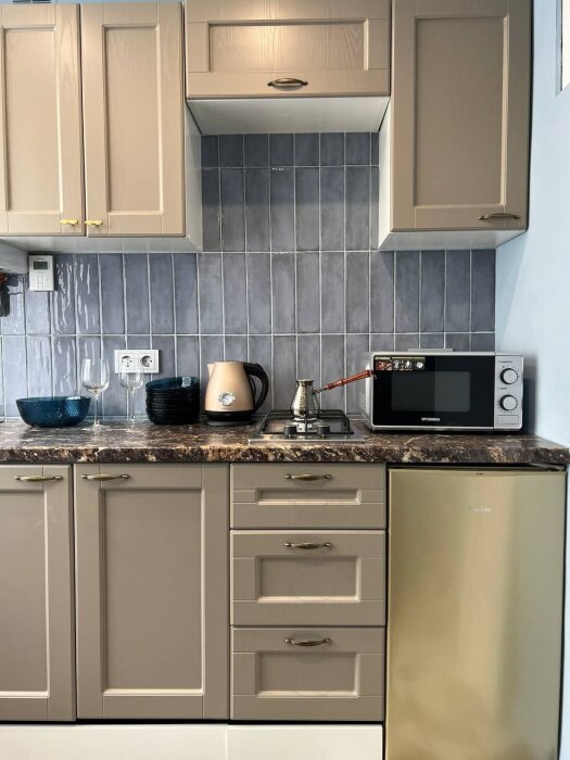 - Оборудованная кухня: посуда, холодильник, микроволновая печь, кастрюли, сковорода, электрический чайник, чай, кофе, сахар.