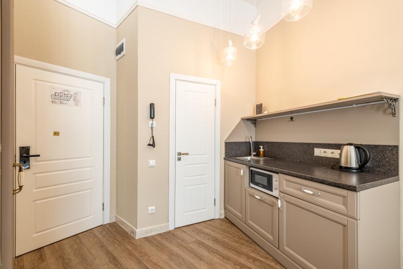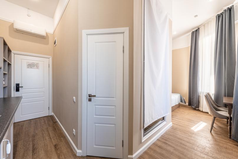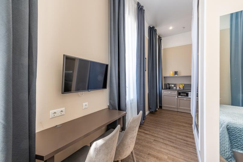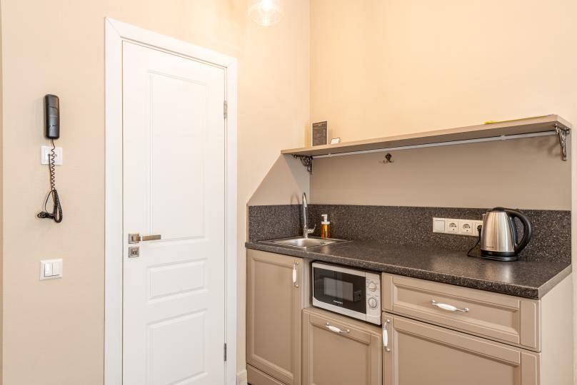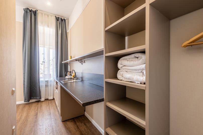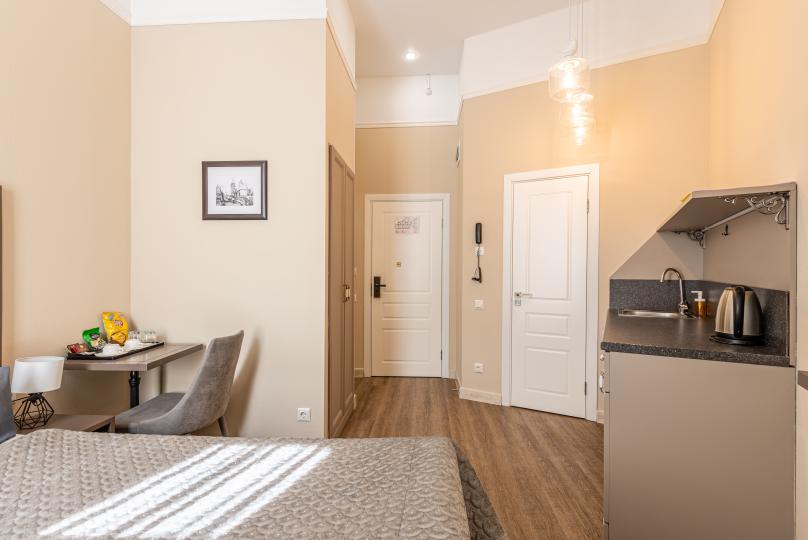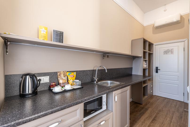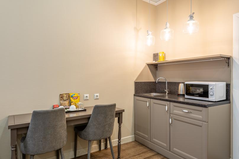 Самый просторный номер из всех категорий имеет ванную комнату, мини-кухню с кондиционером. Изюминка номера 4 больших окна вид, из которых открывается на всю площадь Восстания и Невский проспект. К услугам гостей бесплатные косметические принадлежности, банные халаты, тапочки, wi-fi, чай, кофе, кулер. Для Вашего комфорта имеется в обще зоне кофемашина с зерновым ароматным кофе