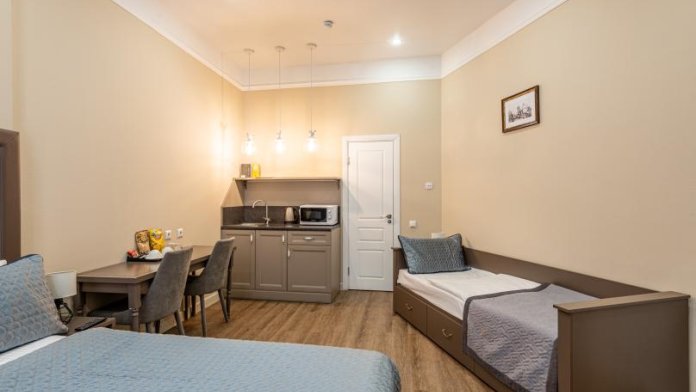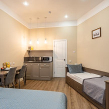 Семейный номер, в котором можно выбрать вариант кроватей: двуспальная и односпальная кровати или три раздельные кровати. Оборудован мини-кухней, санузлом. Номер с видом на тихий двор. Для трехместного размещения необходимо выбрать тариф на троих гостей. К услугам гостей бесплатные косметические принадлежности, банные халаты, полотенца, тапочки, wi-fi, чай, кофе.