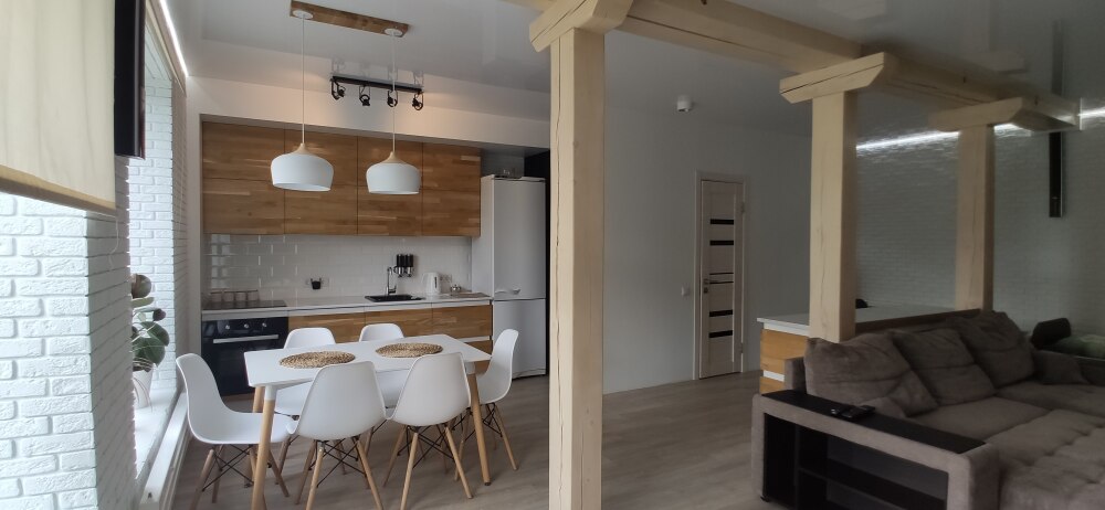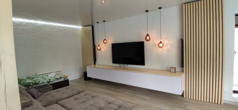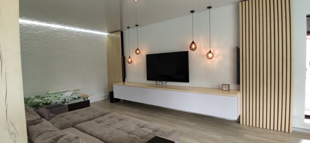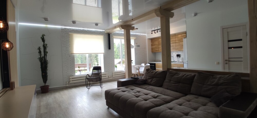 на первом этаже дома расположена большая гостиная с большим диваном, домашним кинотеатром столами которые можно составить в один длинный стол для посиделок вечерами. Барная стойка. Гостиная оборудована полноценной кухней и санузлом.