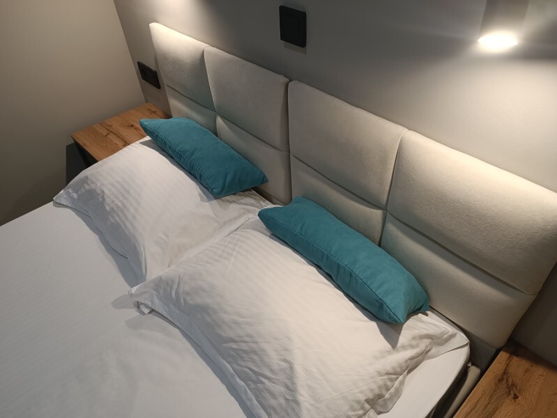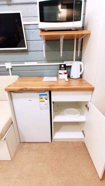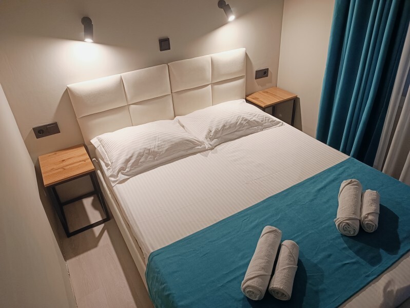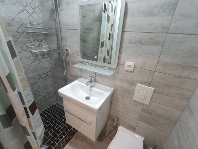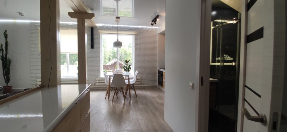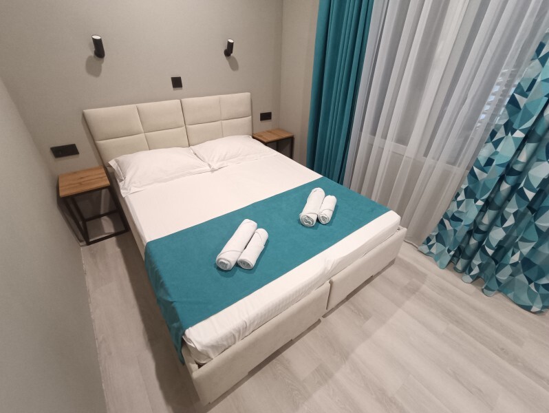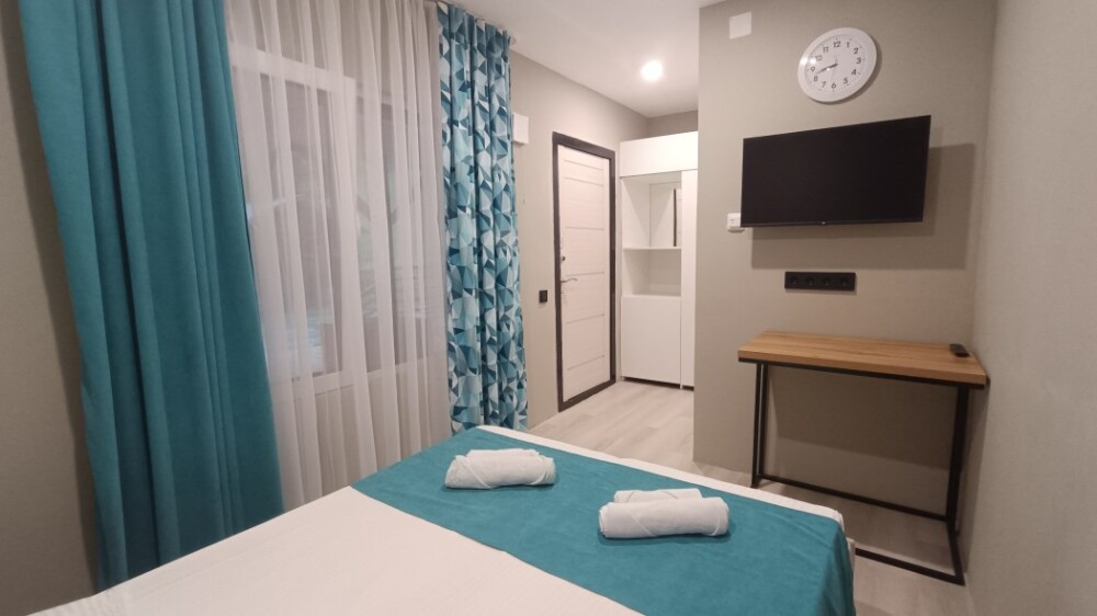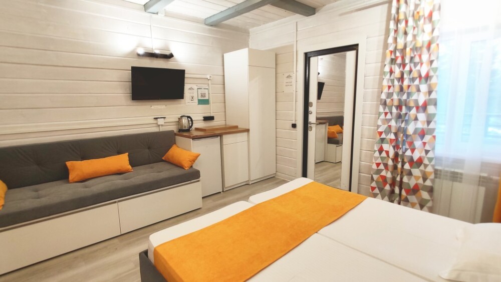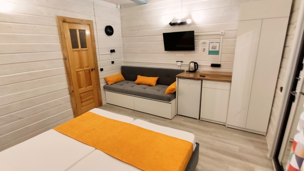 Вход на этаж отдельный. Удобства в номере - душевая кабина, туалет, фен для волос, 2-е односпальные кровати соединённые вместе (нет щелей между матрасами), стол обеденный, стол кухонный 2 тумбочки, 2 табурета, шкаф, диван-софа, холодильник, смарт ТВ, чайник, минимальный набор посуды, СВЧ-печь.