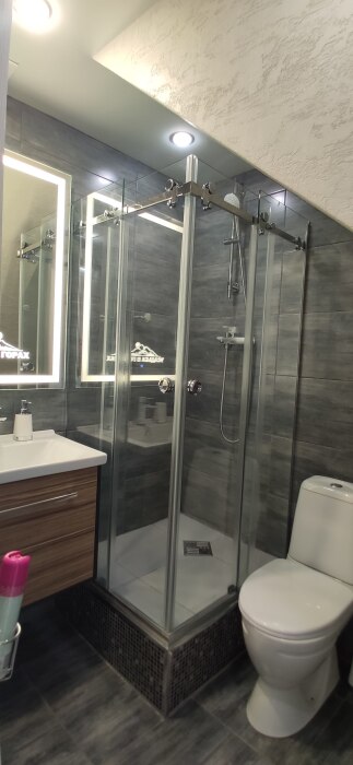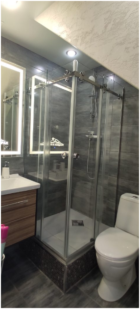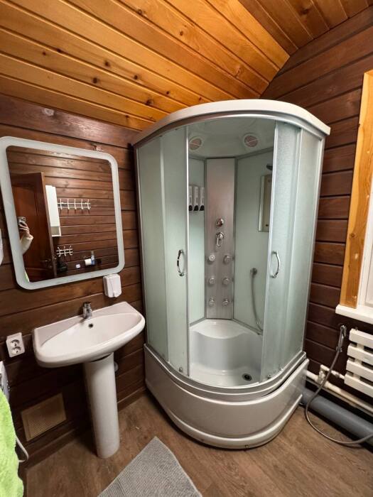 На третьем этаже три 2-х местных спальни и санузел с душевой кабиной. Кровати трансформеры.