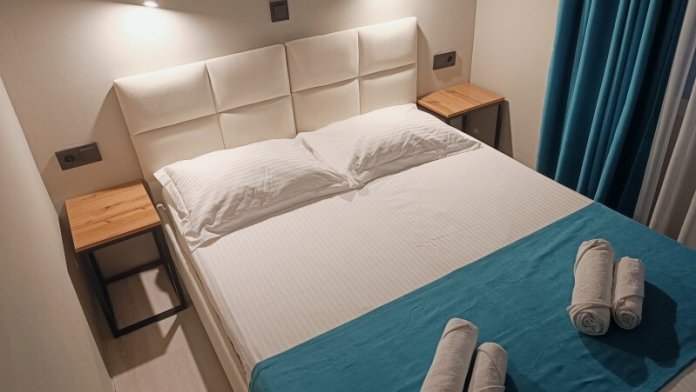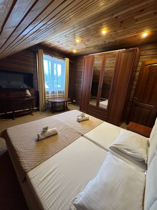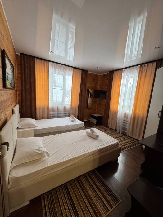 Четыре номера такого плана на втором этаже расположены рядом, вход на этаж отдельный. Удобства в номере - душевая кабина, туалет, фен для волос, 2-е односпальные кровати соединённые вместе (нет щелей между матрасами), стол обеденный, стол разделочный 2 тумбочки/табурета, шкаф, диван-софа, холодильник, смарт ТВ, чайник, минимальный набор посуды, СВЧ печь.