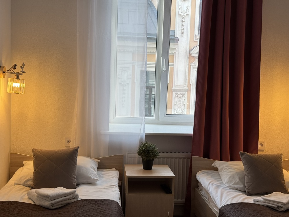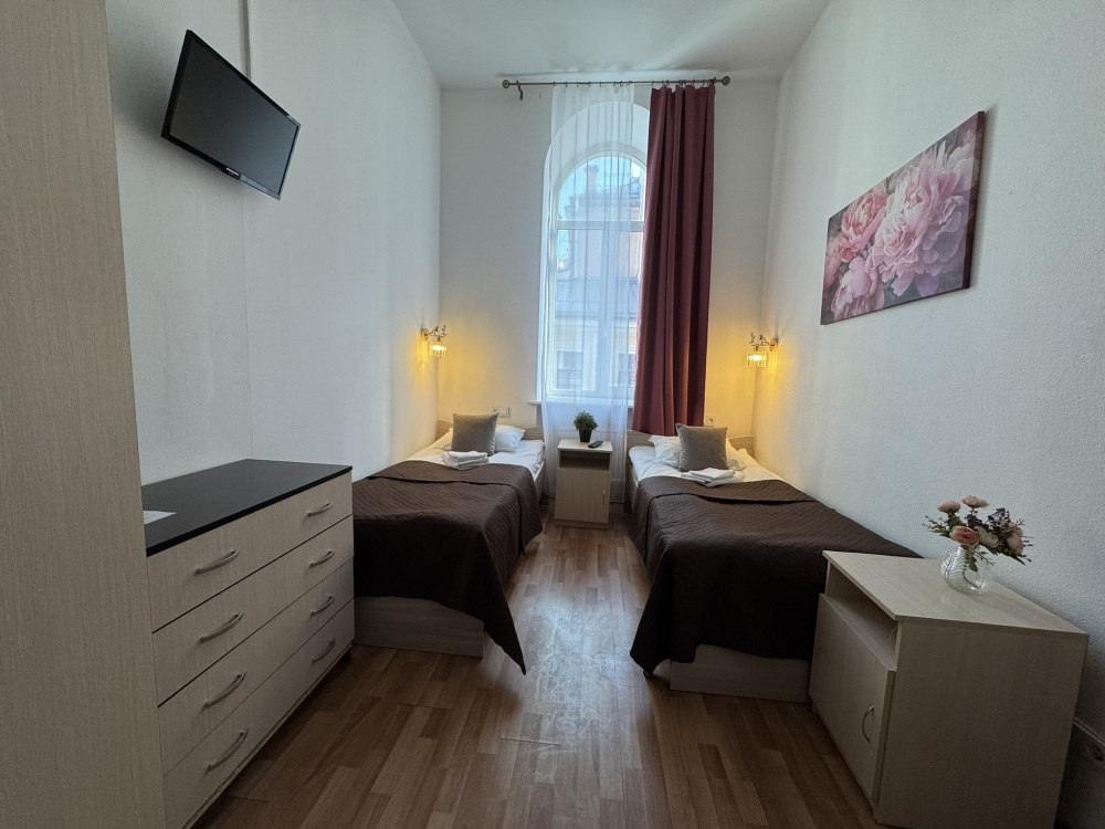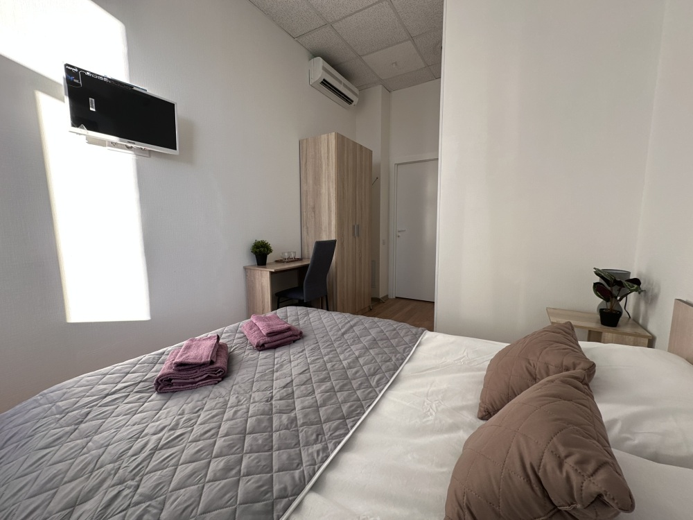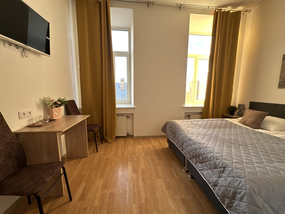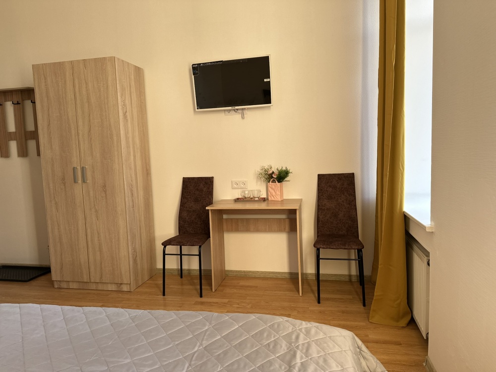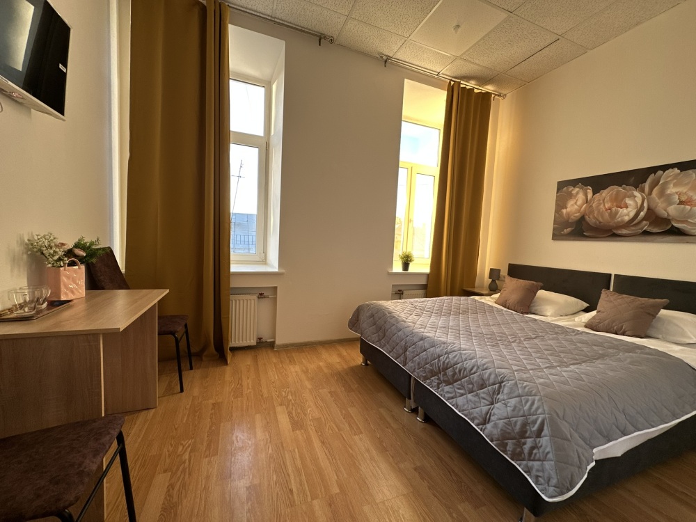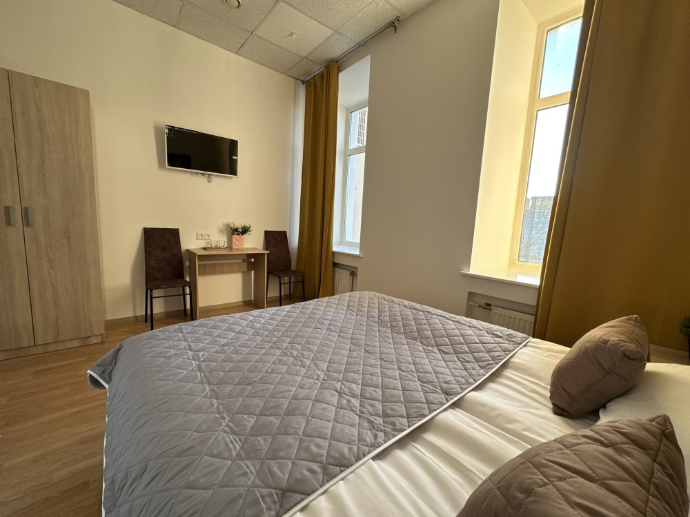 Стандартный двухместный номер с двуспальной кроватью или двумя односпальными кроватями, оборудованный всем необходимым для комфортного проживания: ЖК телевизор, собственная ванная комната с душевой кабиной, раковиной и туалетом. Гостям предоставляется постельное белье, полотенца, доступ к интернету. Номер находится на 5 этаже без лифта с удобной широкой лестницей.