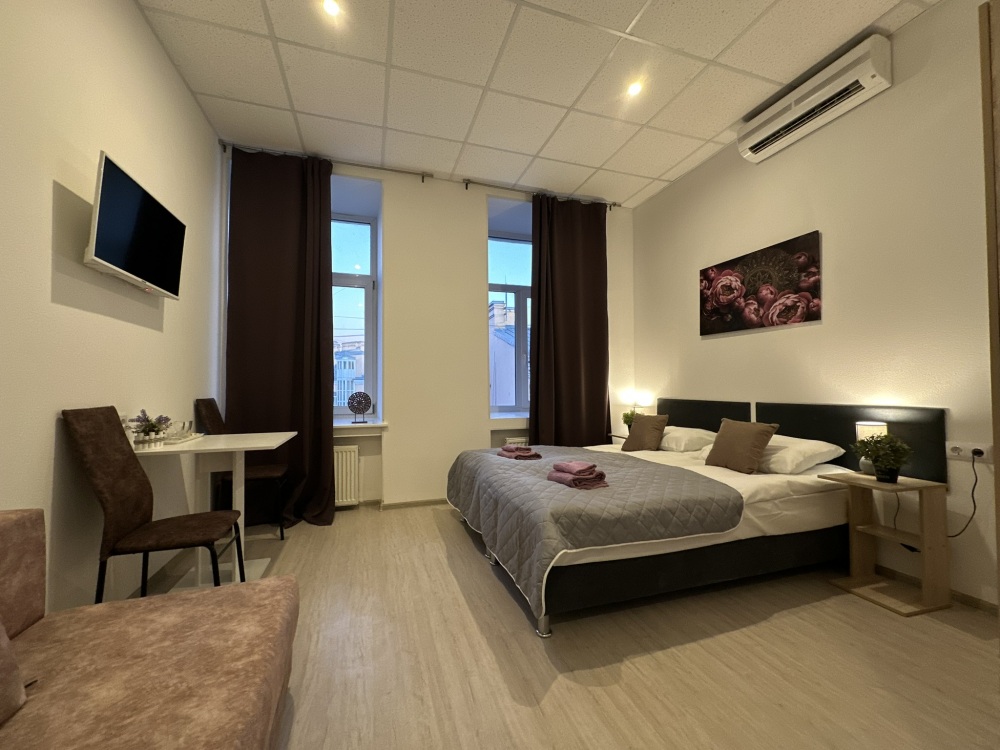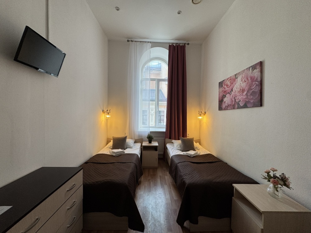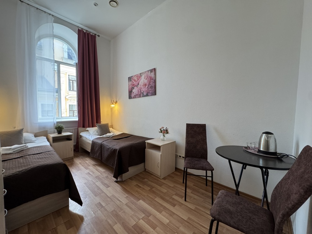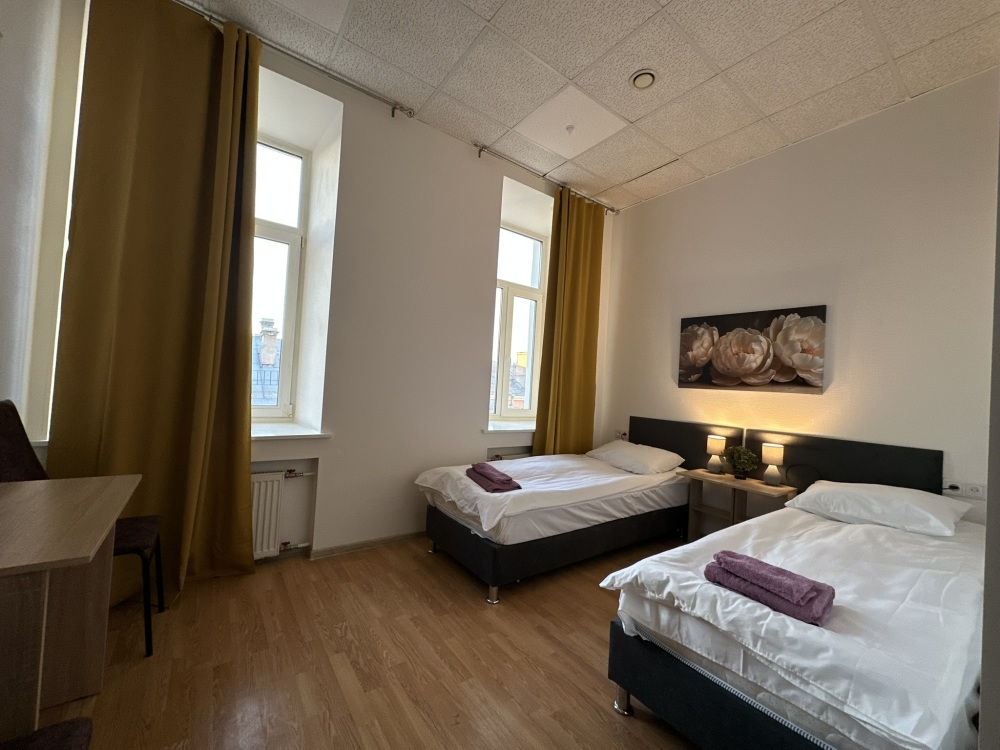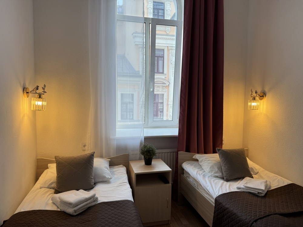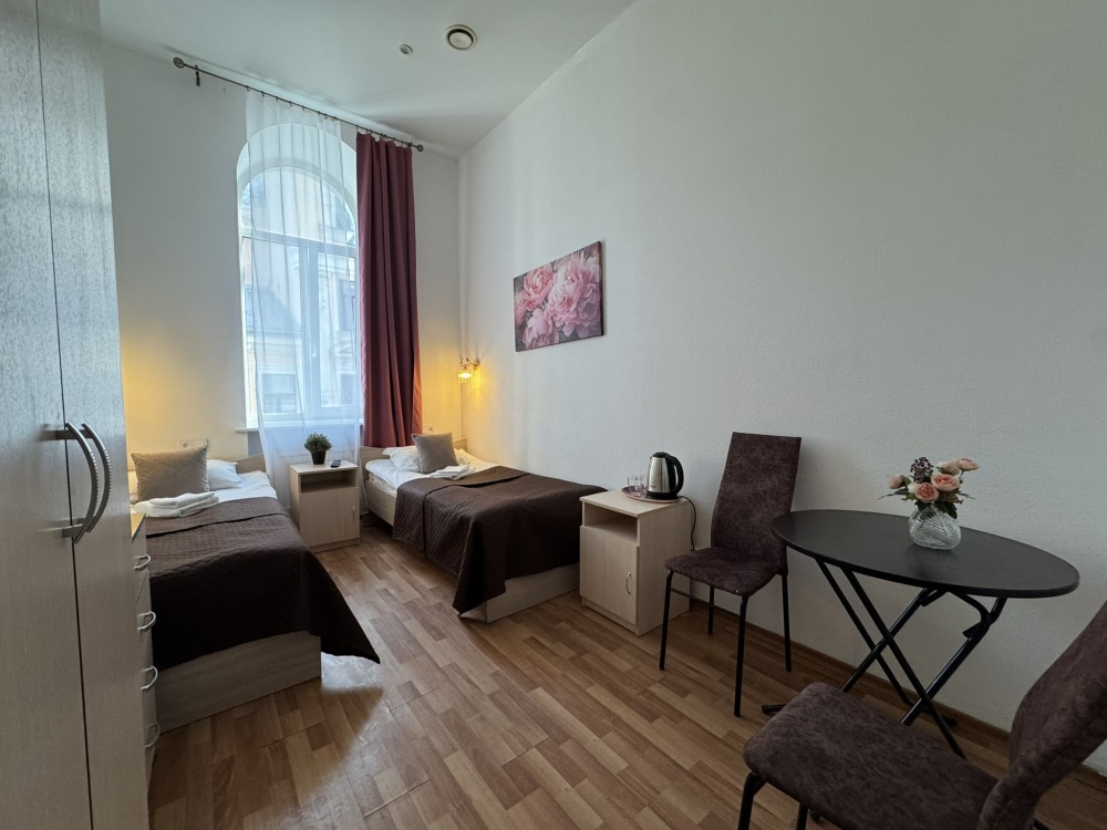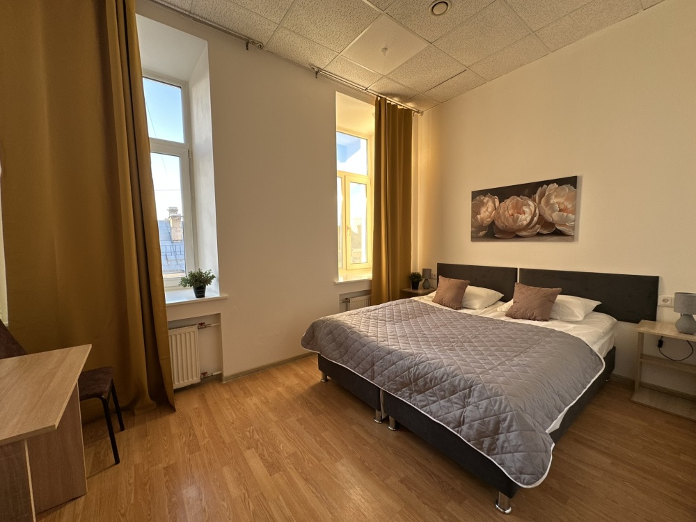 Стандартный двухместный номер с двуспальной кроватью или двумя односпальными кроватями, оборудованный всем необходимым для комфортного проживания: ЖК телевизор, собственная ванная комната с душевой кабиной, раковиной и туалетом. Гостям предоставляется постельное белье, полотенца, доступ к интернету. Номер находится на 5 этаже без лифта с удобной широкой лестницей.