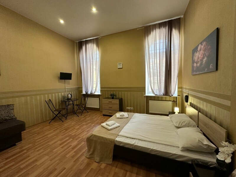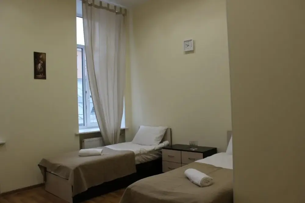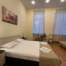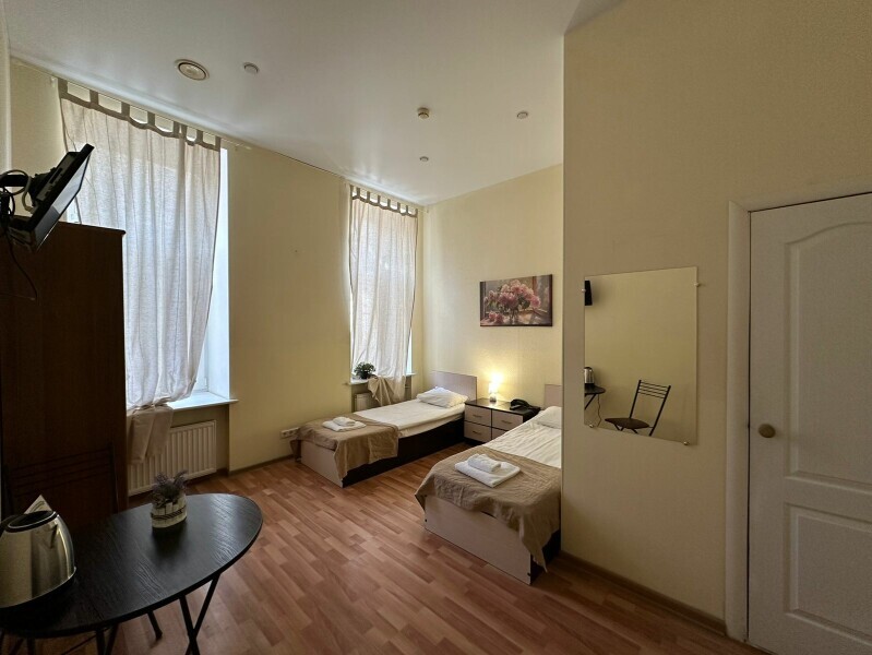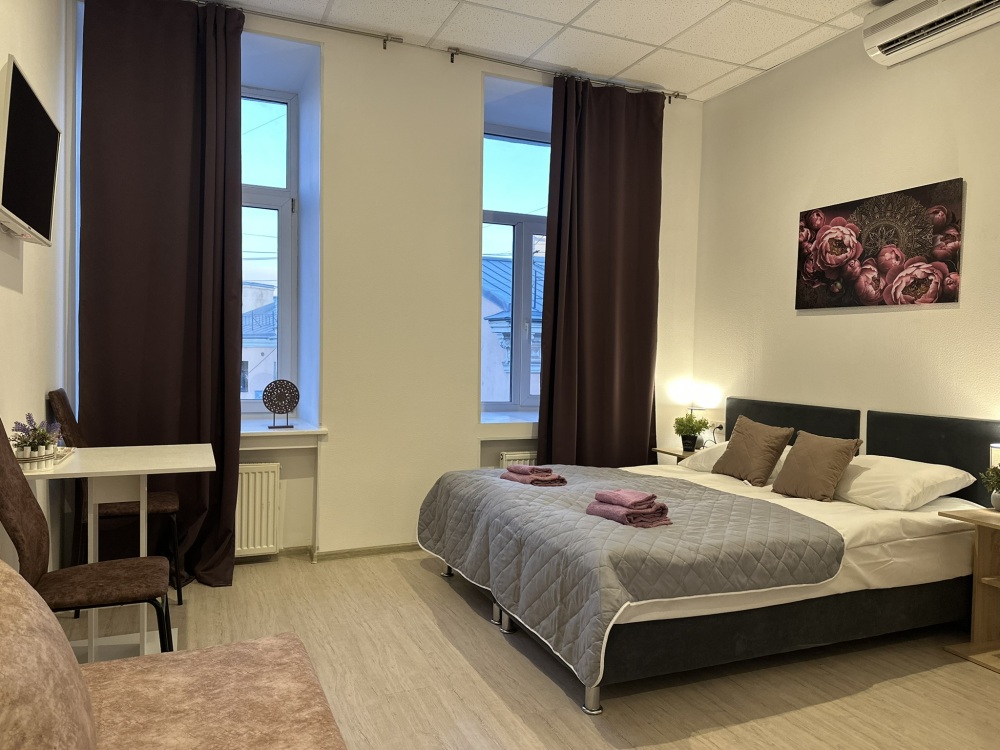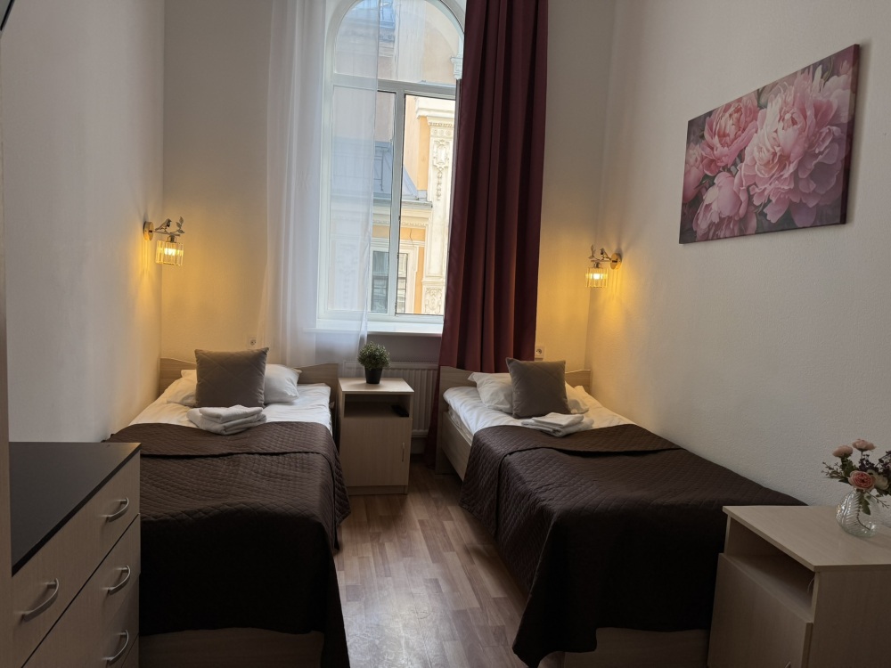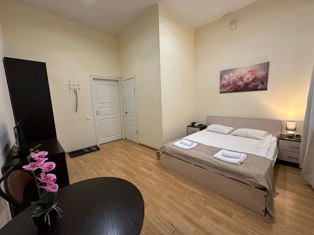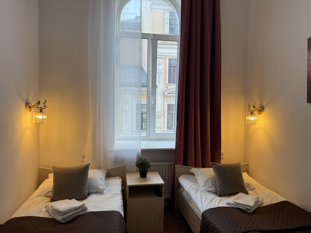 Стандартный двухместный номер с двуспальной кроватью или двумя односпальными кроватями, оборудованный всем необходимым для комфортного проживания: ЖК телевизор, собственная ванная комната с душевой кабиной, раковиной и туалетом. Гостям предоставляется постельное белье, полотенца, доступ к интернету. Номер находится на 5 этаже без лифта с удобной широкой лестницей.