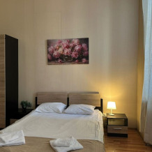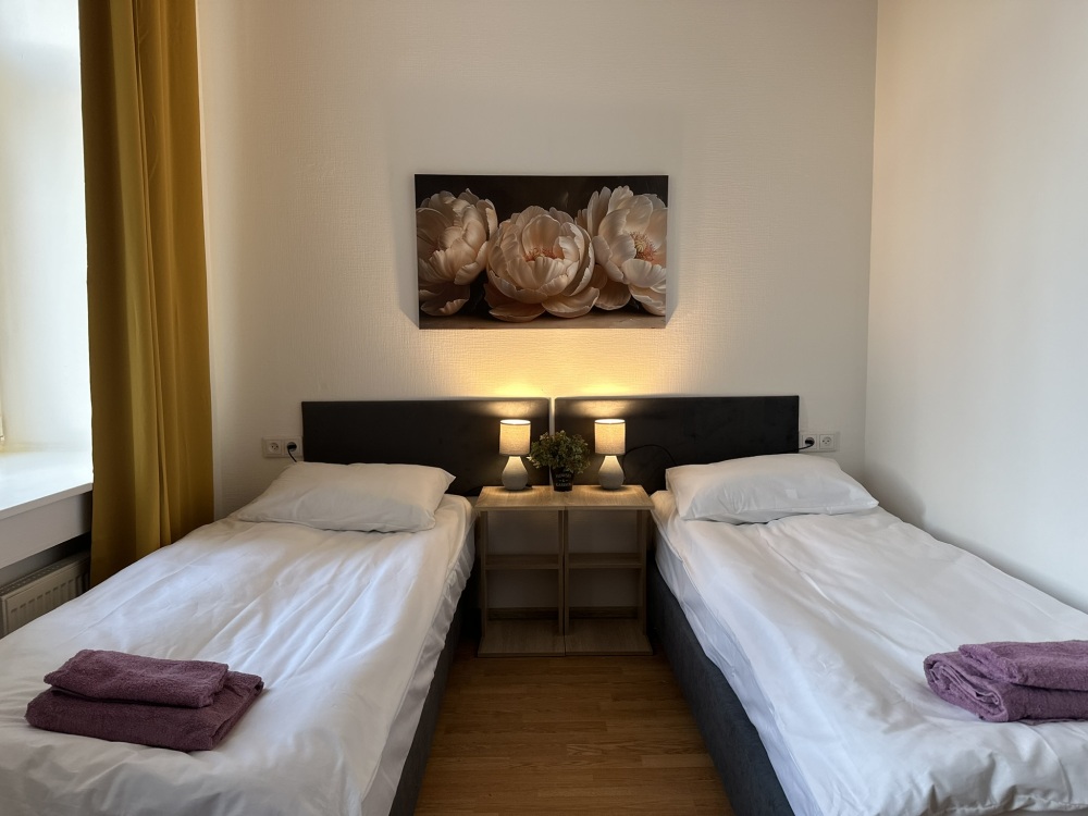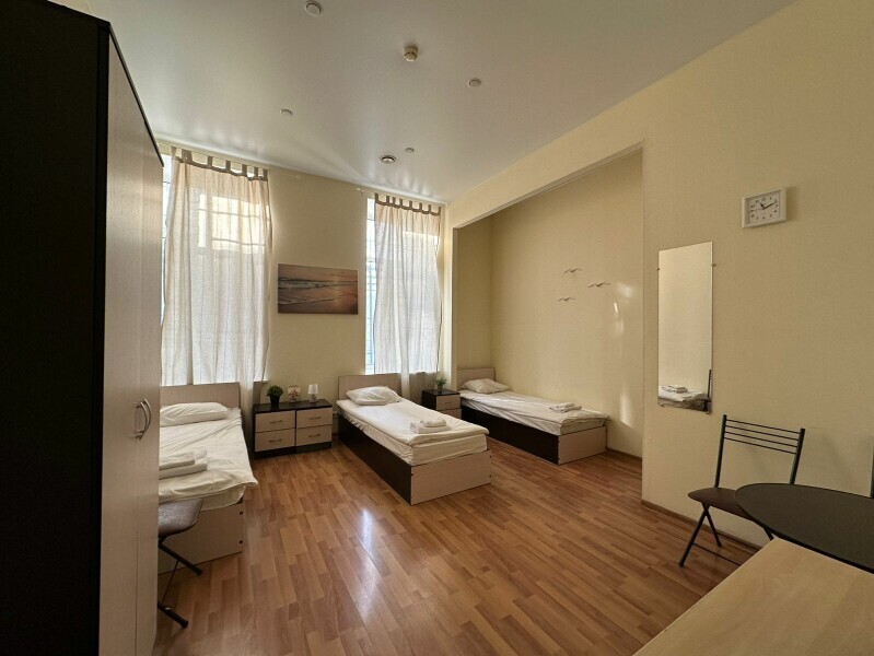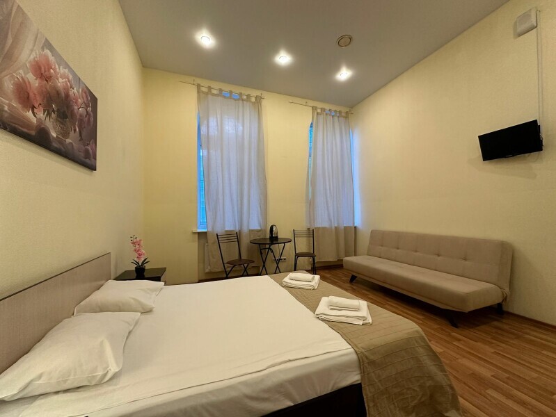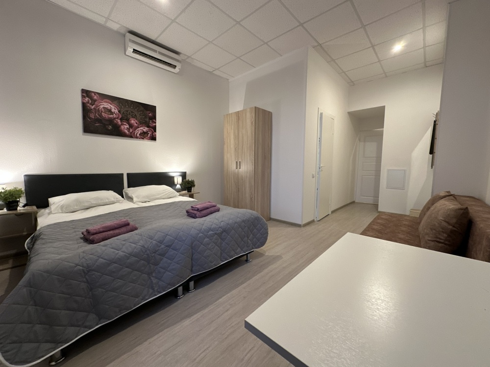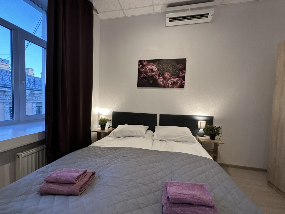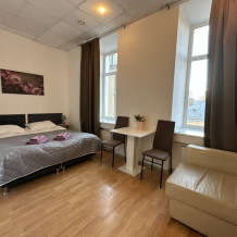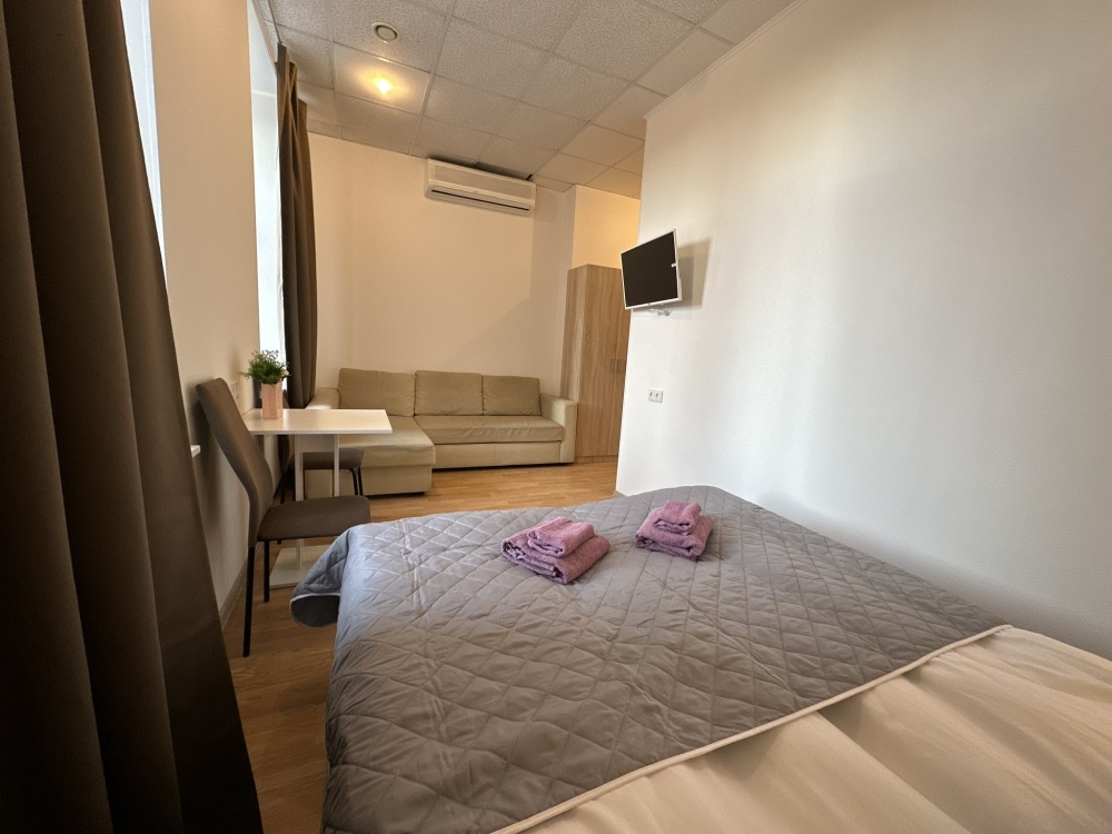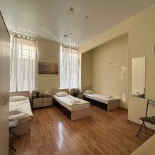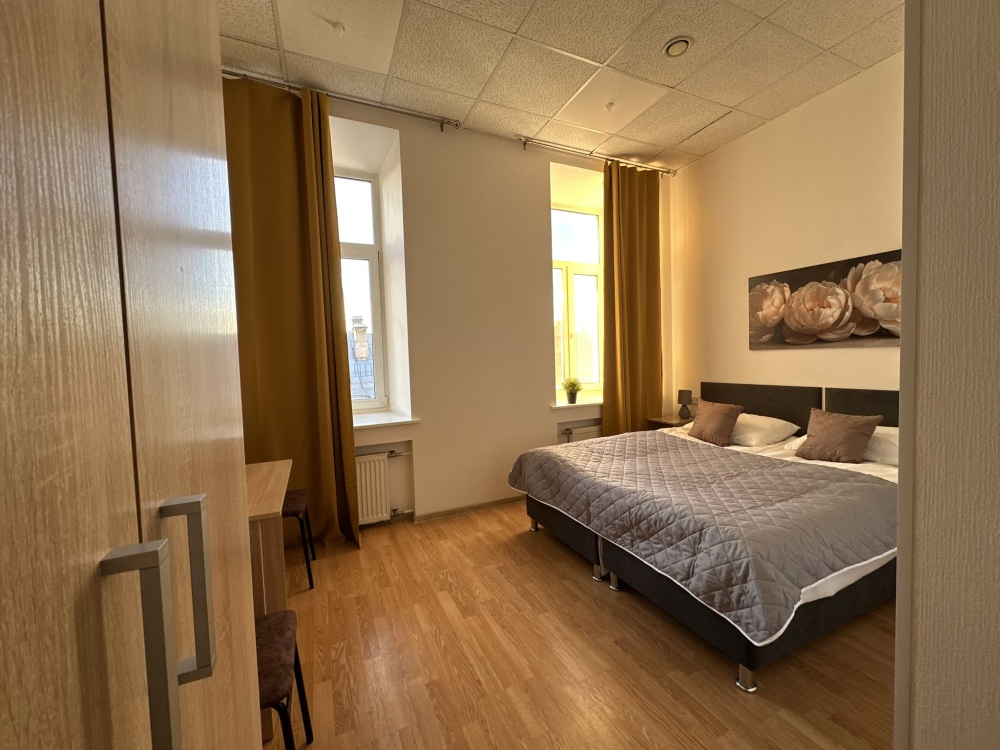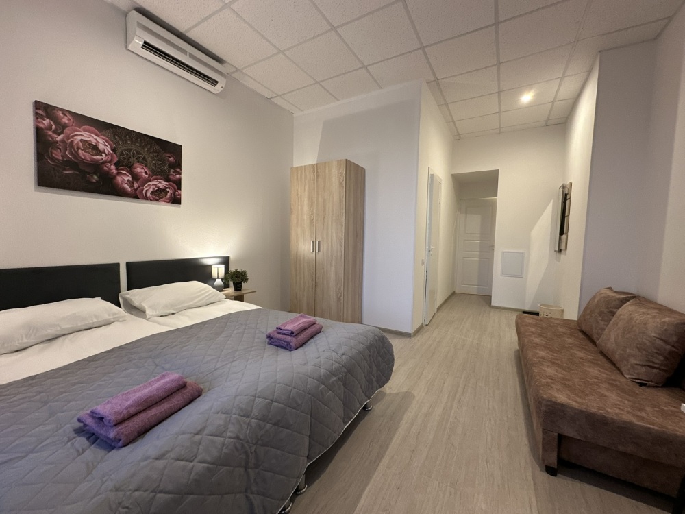 Четырехместный номер с двуспальной кроватью или двумя односпальными кроватями и двухместным диваном, оборудованный всем необходимым для комфортного проживания: кондиционер, ЖК телевизор, собственная ванная комната с душевой кабиной, раковиной и туалетом. Гостям предоставляется постельное белье, полотенца, доступ к интернету. Номер находится на 5 этаже без лифта с удобной широкой лестницей.