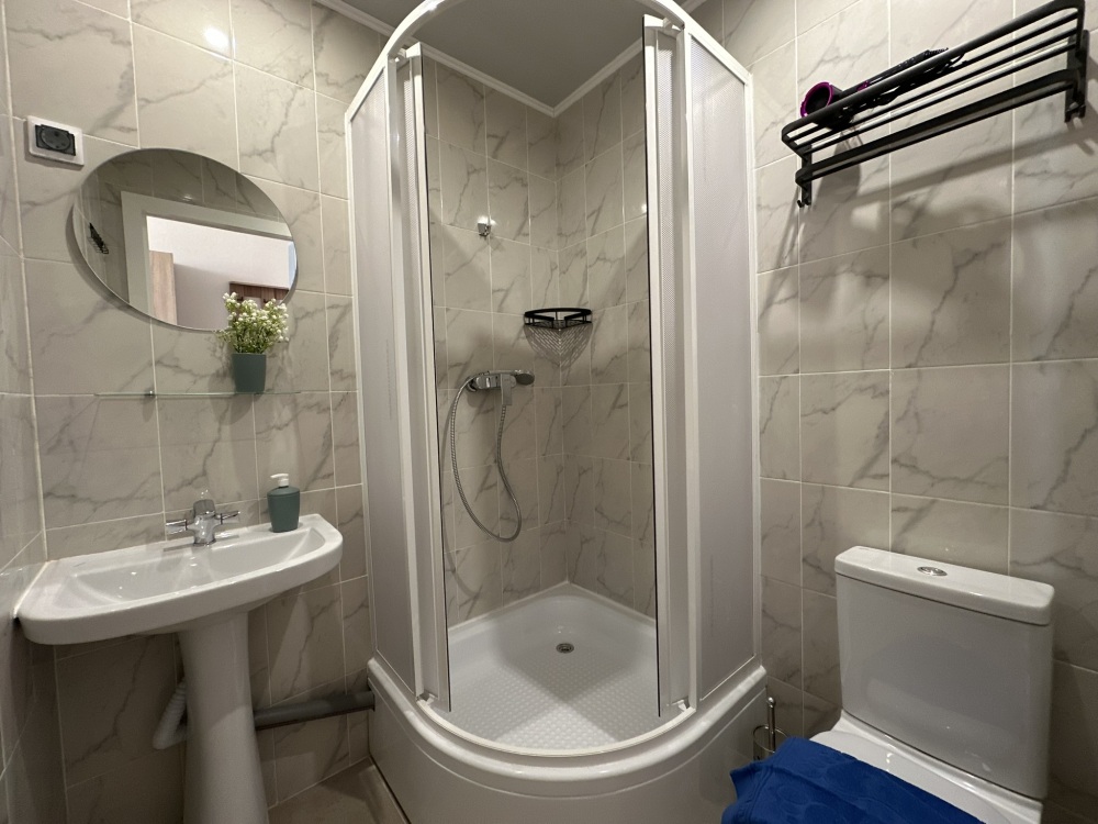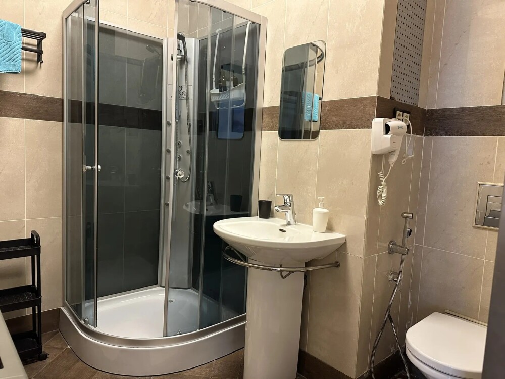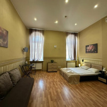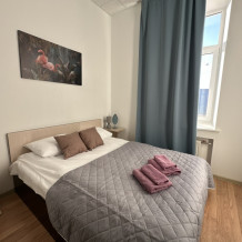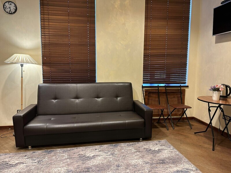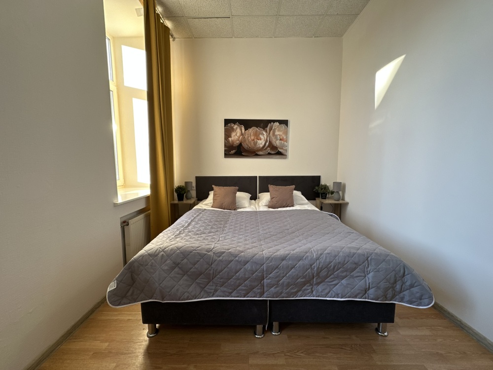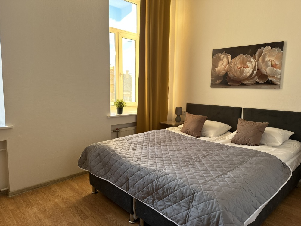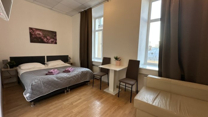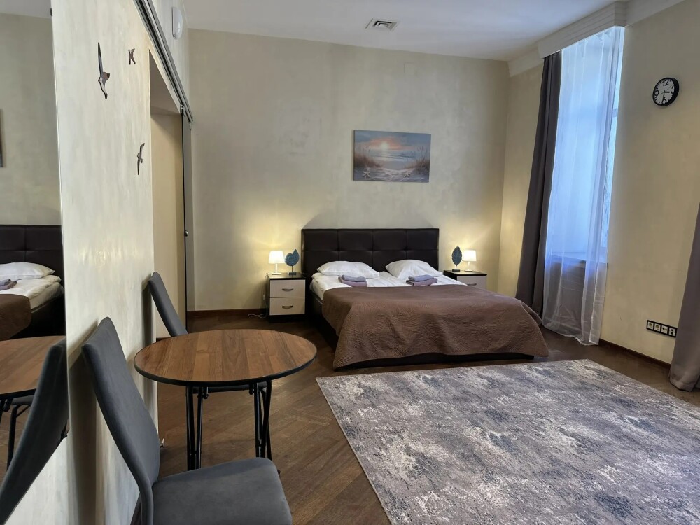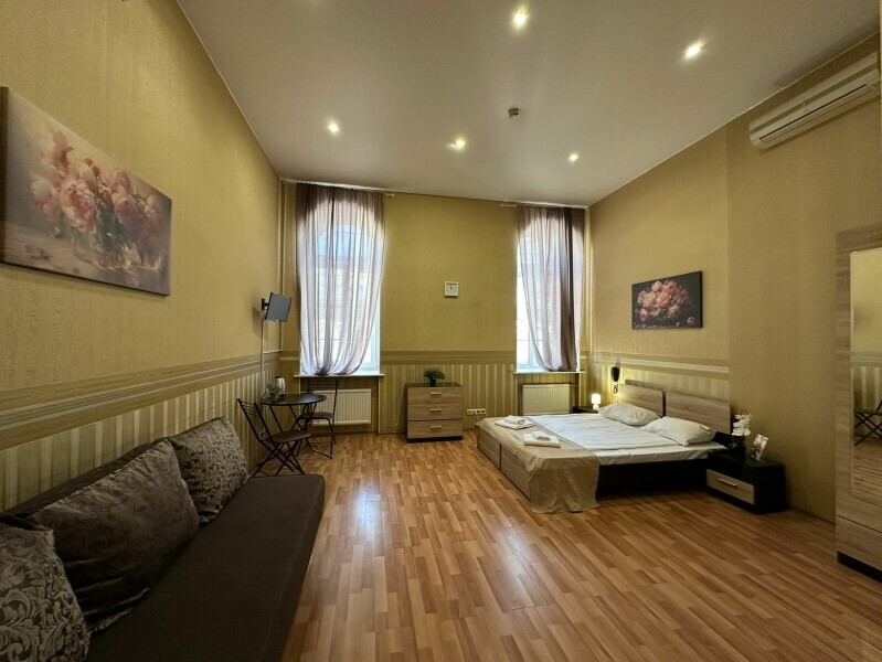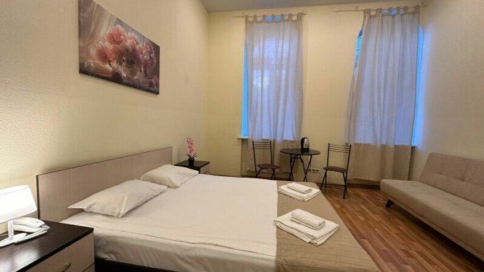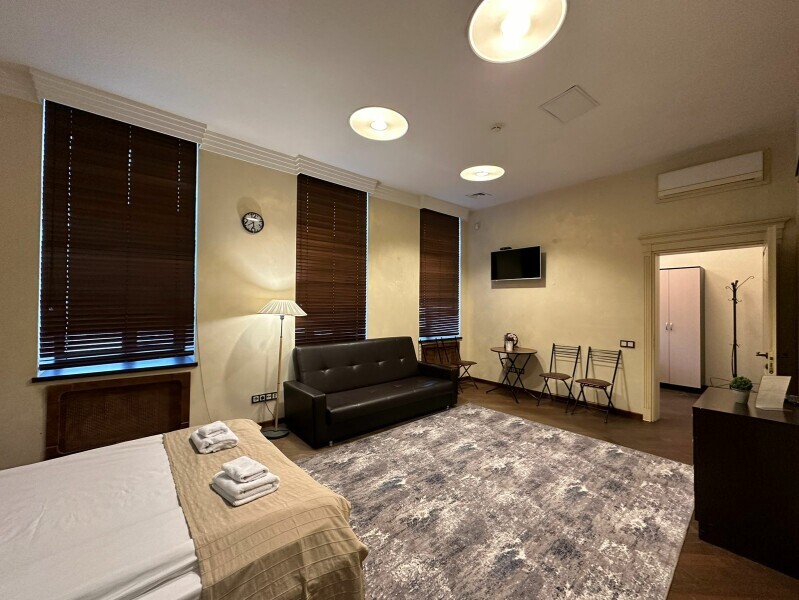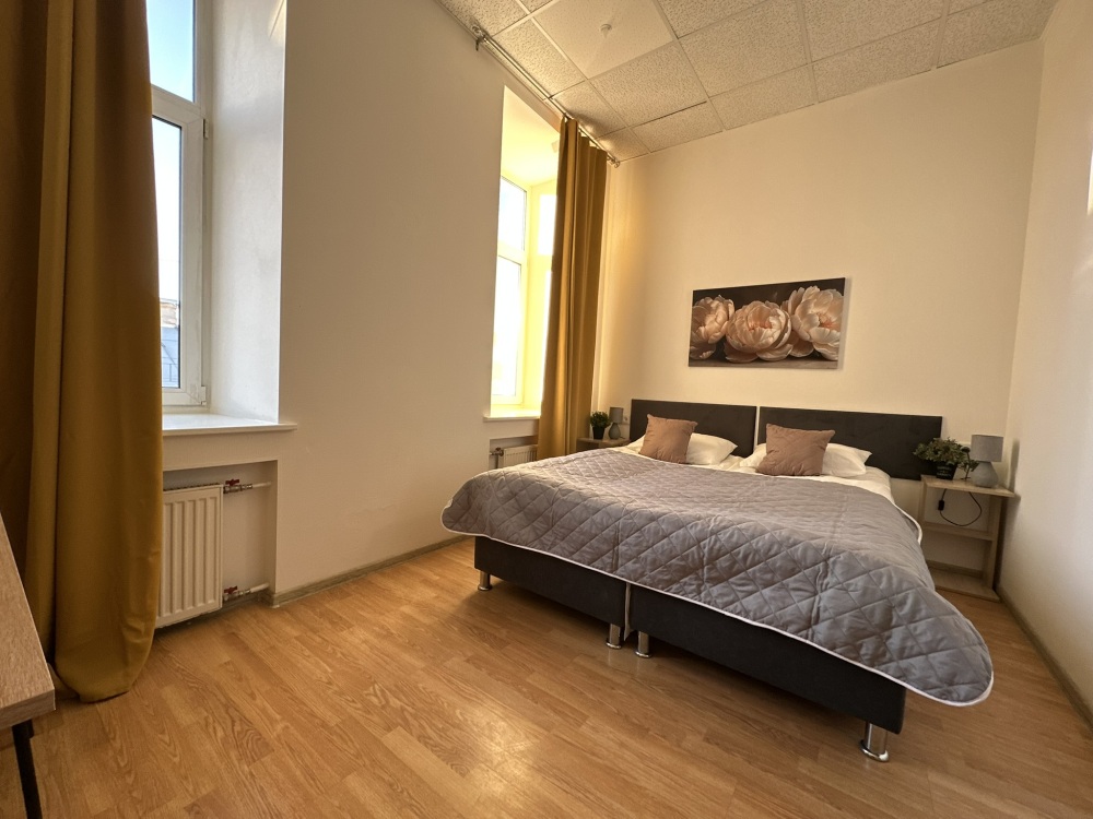Четырехместный номер с двуспальной кроватью или двумя односпальными кроватями и двухместным диваном, оборудованный всем необходимым для комфортного проживания: кондиционер, ЖК телевизор, собственная ванная комната с душевой кабиной, раковиной и туалетом. Гостям предоставляется постельное белье, полотенца, доступ к интернету. Номер находится на 5 этаже без лифта с удобной широкой лестницей.