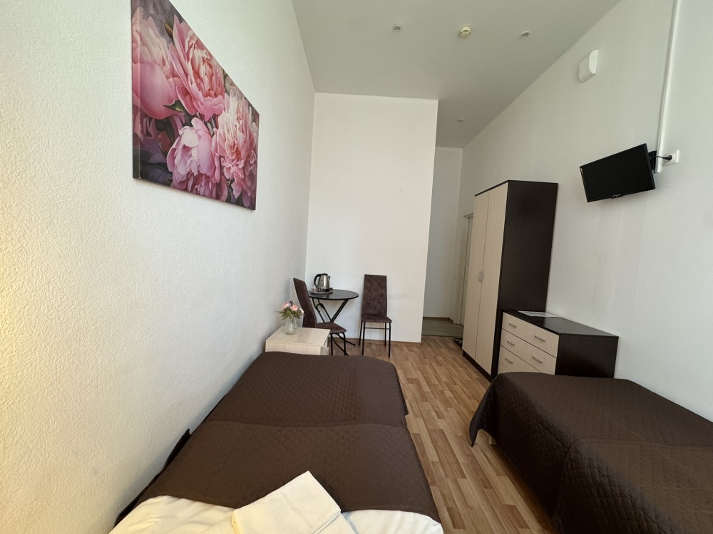 Бюджетный двухместный номер с двумя односпальными кроватями, оборудованный всем необходимым для комфортного проживания, кондиционер, ЖК телевизор. Ванная комната с душевой кабиной, раковиной и туалетом расположена на этаже (одна на 3 номера). Гостям предоставляется постельное белье, полотенца, доступ к интернету.